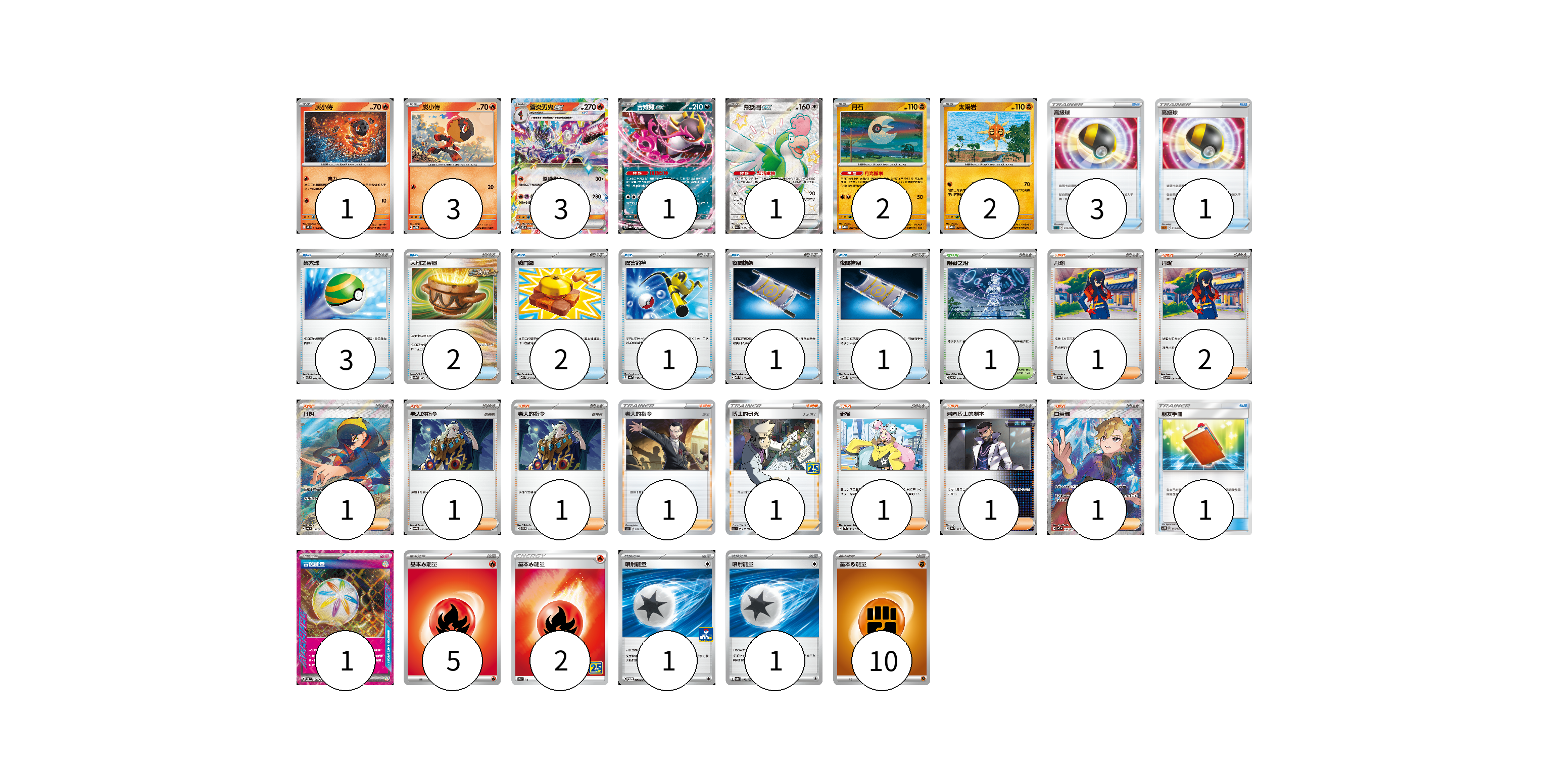 牌組構築方案 以此牌組為基礎新構築牌組 顯示卡面 顯示列表 寶可夢卡(13) 1 3 3 1 1 2 2 物品卡(15) 3 1 3 2 2 1 1 1 1 支援者卡(11) 1 2 1 1 1 1 1 1 1 1 競技場卡(1) 1 能量卡(20) 1 5 2 1 1 10 寶可夢卡(13) 卡牌名稱 張數 卡牌名稱 張數 炭小侍 M2 019/080 01 炭小侍 SVPS 005/008 03 蒼炎刃鬼ex SVPS 006/008 03 吉雉雞ex SV8a 104/187 01 怒鸚哥ex SV4a 337/190 01 月石 M1L 026/063 02 太陽岩 M1L 027/063 02 物品卡(15) 卡牌名稱 張數 卡牌名稱 張數 高級球 SLD 013/020 03 高級球 SLL 013/021 01 巢穴球 SVTL 011/021 03 大地之容器 SV8a 143/187 02 戰鬥鑼 M1L 059/063 02 厲害釣竿 SV4a 158/190 01 夜間擔架 MBD 016/022 01 夜間擔架 MBG 017/022 01 朋友手冊 AC2D 145/176 01 支援者卡(11) 卡牌名稱 張數 卡牌名稱 張數 丹瑜 SV8a 170/187 01 丹瑜 SV6 097/101 02 丹瑜 SV6 123/101 01 老大的指令 SVOM 020/021 01 老大的指令 SVTH 017/018 01 老大的指令(坂木) SJ 026/028 01 博士的研究(大木博士) S8a 003/028 01 奇樹 SV2D 069/071 01 弗圖博士的劇本 SV8a 175/187 01 白蕾雅 SV7 126/102 01 競技場卡(1) 卡牌名稱 張數 卡牌名稱 張數 阻礙之塔 SV6 100/101 01 能量卡(20) 卡牌名稱 張數 卡牌名稱 張數 古舊能量 SV6 101/101 01 基本火能量 sv-p FIR 05 基本火能量 S8a FIR 02 噴射能量 SV-P 180/SV-P 01 噴射能量 SV8a 185/187 01 基本鬥能量 sv-p FIG 10 以此牌組為基礎新構築牌組 牌組編碼 ZINucI-yPotew-DOSgbC copy 列印牌組單 牌組編碼已複製 分享至SNS