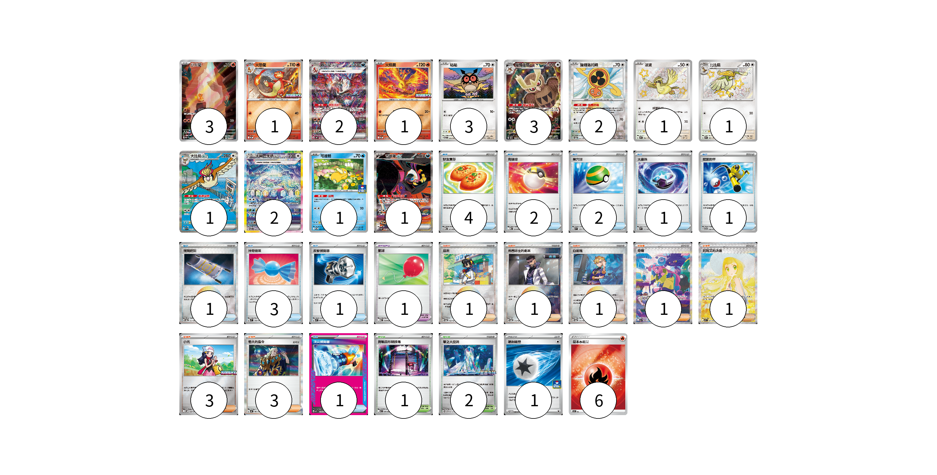 牌組構築方案 以此牌組為基礎新構築牌組 顯示卡面 顯示列表 寶可夢卡(22) 3 1 2 1 3 3 2 1 1 1 2 1 1 物品卡(17) 4 2 2 1 1 1 3 1 1 1 支援者卡(11) 1 1 1 1 1 3 3 競技場卡(3) 1 2 能量卡(7) 1 6 寶可夢卡(22) 卡牌名稱 張數 卡牌名稱 張數 小火龍 SV2a 168/165 03 火恐龍 M-P 021/M-P 01 噴火龍ex SV4a 349/190 02 火焰鳥 M-P 022/M-P 01 咕咕 SV7 076/102 03 貓頭夜鷹 SV7 114/102 03 旋轉洛托姆 SV8a 131/187 02 波波 SV4a 304/190 01 比比鳥 SV4a 305/190 01 大比鳥ex SV3 136/108 01 太樂巴戈斯ex SV7 130/102 02 可達鴨 SV-P 220/SV-P 01 吉雉雞ex SV6a 089/064 01 物品卡(17) 卡牌名稱 張數 卡牌名稱 張數 好友寶芬 MBG 011/022 04 高級球 MBD 014/022 02 巢穴球 SVM 133/175 02 太晶珠 SVK 013/042 01 厲害釣竿 SVTG 009/019 01 夜間擔架 SV8a 151/187 01 神奇糖果 SVM 135/175 03 反擊捕捉器 SVK 009/042 01 氣球 MBD 018/022 01 頂尖捕捉器 MBG 014/022 01 支援者卡(11) 卡牌名稱 張數 卡牌名稱 張數 烏栗 SV8a 169/187 01 弗圖博士的劇本 SV8a 175/187 01 白蕾雅 SV8a 176/187 01 奇樹 SV4a 350/190 01 莉莉艾的決意 M1L 091/063 01 小光 M-P 028/M-P 03 老大的指令 SV4a 181/190 03 競技場卡(3) 卡牌名稱 張數 卡牌名稱 張數 對戰圓形競技場 M2 079/080 01 零之大空洞 SV-P 151/SV-P 02 能量卡(7) 卡牌名稱 張數 卡牌名稱 張數 噴射能量 SV-P 180/SV-P 01 基本【火】能量 SO FIR 06 以此牌組為基礎新構築牌組 牌組編碼 ZOYnoY-NIlDtW-gAiwgJ copy 列印牌組單 牌組編碼已複製 分享至SNS