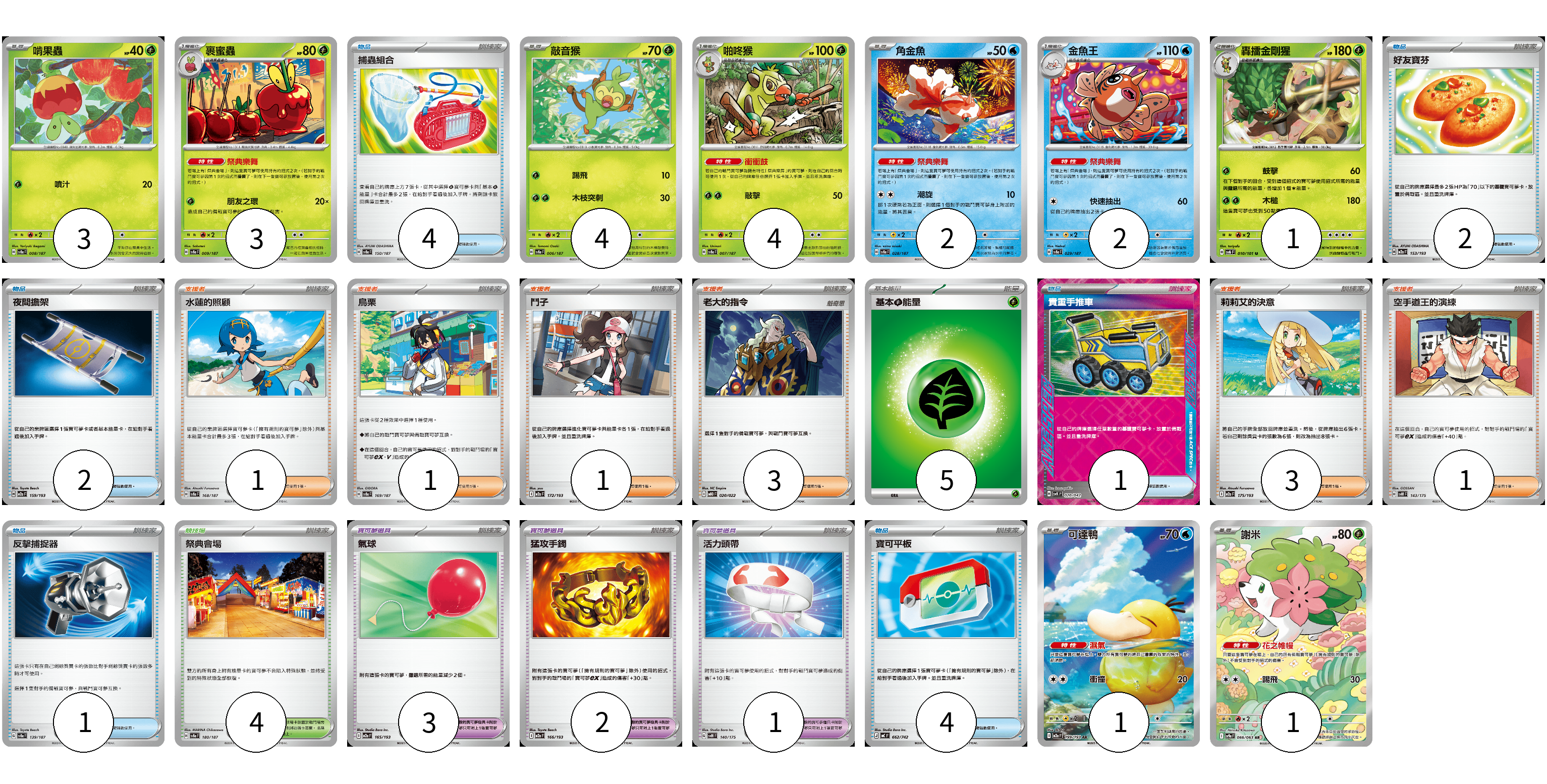 牌組構築方案 以此牌組為基礎新構築牌組 顯示卡面 顯示列表 寶可夢卡(21) 3 3 4 4 2 2 1 1 1 寶可夢道具(6) 3 2 1 物品卡(14) 4 2 2 1 1 4 支援者卡(10) 1 1 1 3 3 1 競技場卡(4) 4 能量卡(5) 5 寶可夢卡(21) 卡牌名稱 張數 卡牌名稱 張數 啃果蟲 SV8a 008/187 03 裹蜜蟲 SV8a 009/187 03 敲音猴 SV8a 006/187 04 啪咚猴 SV8a 007/187 04 角金魚 SV8a 028/187 02 金魚王 SV8a 029/187 02 轟擂金剛猩 SV6 010/101 01 可達鴨 M2a 199/193 01 謝米 SV9a 066/063 01 寶可夢道具(6) 卡牌名稱 張數 卡牌名稱 張數 氣球 M2a 165/193 03 猛攻手鐲 M2a 166/193 02 活力頭帶 SVM 140/175 01 物品卡(14) 卡牌名稱 張數 卡牌名稱 張數 捕蟲組合 SV8a 150/187 04 好友寶芬 M2a 153/193 02 夜間擔架 M2a 159/193 02 貴重手推車 SVK 020/042 01 反擊捕捉器 SV8a 139/187 01 寶可平板 MC 662/742 04 支援者卡(10) 卡牌名稱 張數 卡牌名稱 張數 水蓮的照顧 SV8a 168/187 01 烏栗 SV8a 169/187 01 鬥子 M2a 172/193 01 老大的指令 MBD 020/022 03 莉莉艾的決意 M2a 175/193 03 空手道王的演練 SVM 143/175 01 競技場卡(4) 卡牌名稱 張數 卡牌名稱 張數 祭典會場 SV8a 180/187 04 能量卡(5) 卡牌名稱 張數 卡牌名稱 張數 基本【草】能量 M-P GRA 05 以此牌組為基礎新構築牌組 牌組編碼 ZUWitY-IJFftl-USfJBV copy 列印牌組單 牌組編碼已複製 分享至SNS
