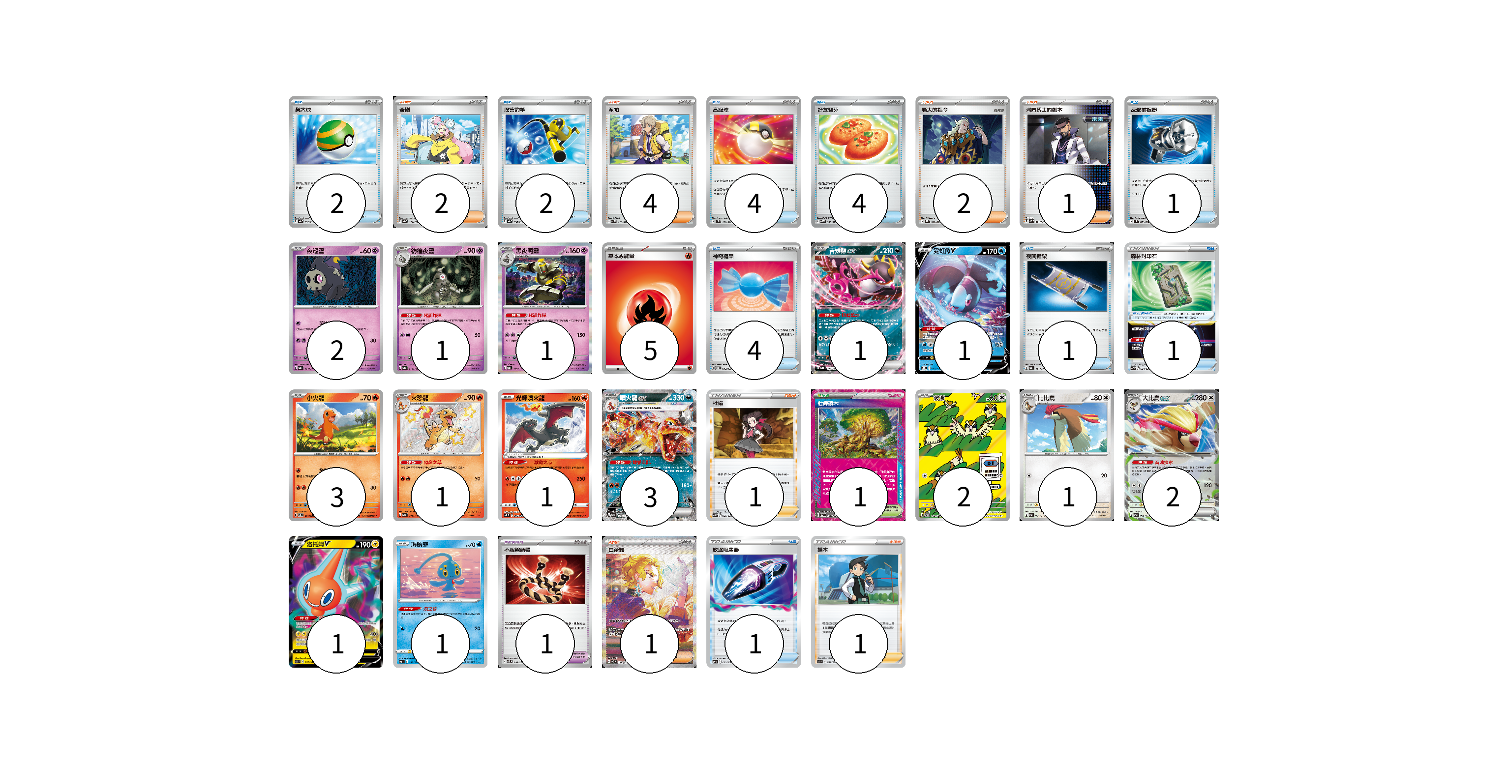 牌組構築方案 以此牌組為基礎新構築牌組 顯示卡面 顯示列表 寶可夢卡(21) 2 1 1 1 1 3 1 1 3 2 1 2 1 1 寶可夢道具(1) 1 物品卡(20) 2 2 4 4 1 4 1 1 1 支援者卡(12) 2 4 2 1 1 1 1 競技場卡(1) 1 能量卡(5) 5 寶可夢卡(21) 卡牌名稱 張數 卡牌名稱 張數 夜巡靈 SV8a 064/187 02 彷徨夜靈 SV8a 065/187 01 黑夜魔靈 SV8a 066/187 01 吉雉雞ex SV8a 104/187 01 霓虹魚V SVHM 001/022 01 小火龍 SVTL 001/021 03 火恐龍 SV4a 211/190 01 光輝噴火龍 SVTL 003/021 01 噴火龍ex SV4a 115/190 03 波波 SV3 118/108 02 比比鳥 SVK 004/042 01 大比鳥ex SVK 005/042 02 洛托姆V S11 037/100 01 瑪納霏 SVF 003/038 01 寶可夢道具(1) 卡牌名稱 張數 卡牌名稱 張數 不服輸頭帶 SVTL 016/021 01 物品卡(20) 卡牌名稱 張數 卡牌名稱 張數 巢穴球 SV4a 159/190 02 厲害釣竿 SV4a 158/190 02 高級球 SV1V 070/078 04 好友寶芬 SV5K 063/071 04 反擊捕捉器 SV4M 059/066 01 神奇糖果 SVTM 013/022 04 夜間擔架 SV8a 151/187 01 森林封印石 SVF 024/038 01 放逐吸塵器 SVF 023/038 01 支援者卡(12) 卡牌名稱 張數 卡牌名稱 張數 奇樹 SV4a 174/190 02 派帕 SV1V 076/078 04 老大的指令 SVHK 022/022 02 弗圖博士的劇本 SVHM 021/022 01 杜娟 SVB 021/028 01 白蕾雅 SV7 132/102 01 捩木 S11 097/100 01 競技場卡(1) 卡牌名稱 張數 卡牌名稱 張數 壯偉碩木 SV7 101/102 01 能量卡(5) 卡牌名稱 張數 卡牌名稱 張數 基本【火】能量 SVEL FIR 05 以此牌組為基礎新構築牌組 牌組編碼 ZWlORK-sLWbgT-xSIZJo copy 列印牌組單 牌組編碼已複製 分享至SNS
