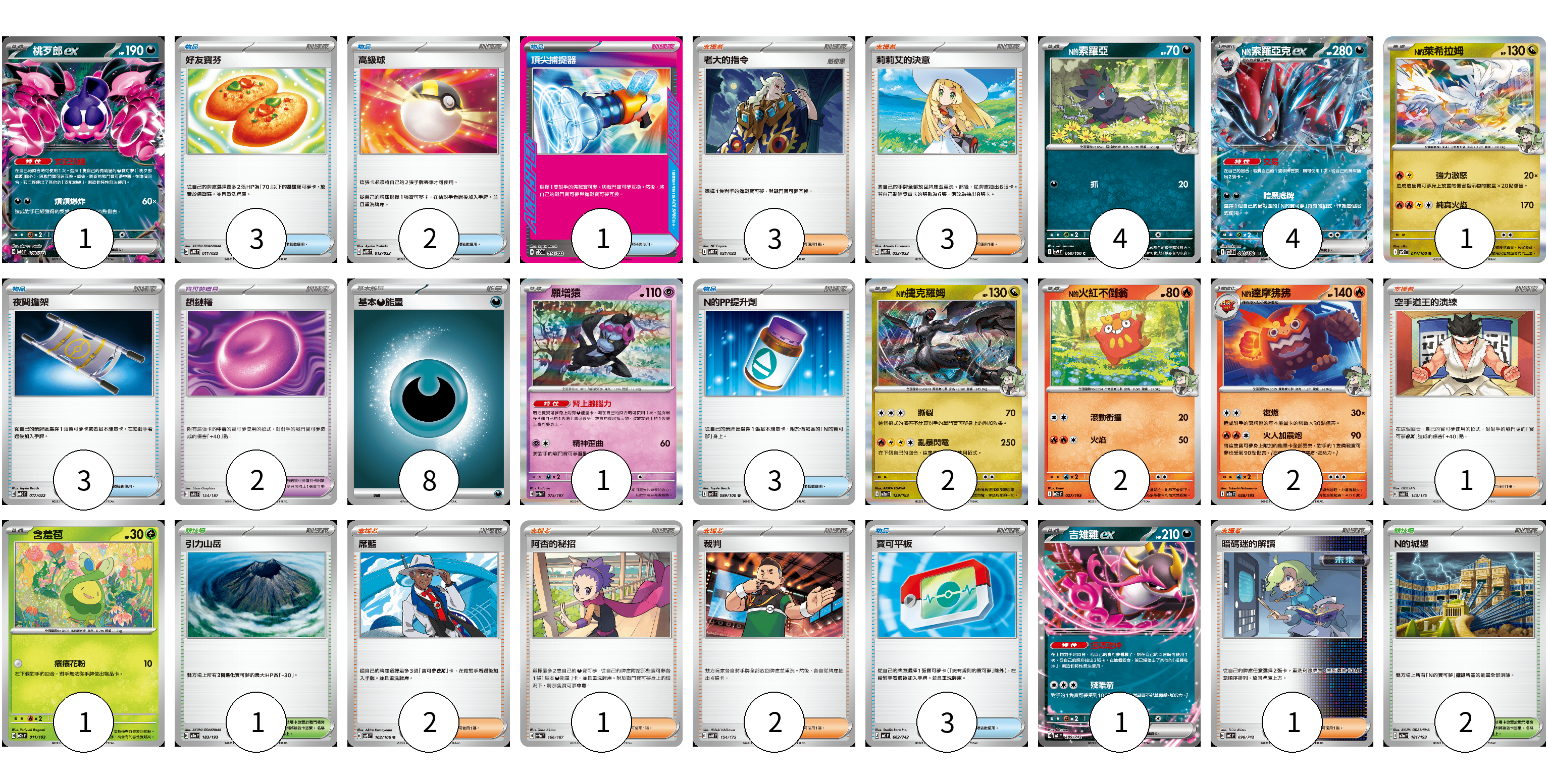 牌組構築方案 以此牌組為基礎新構築牌組 顯示卡面 顯示列表 寶可夢卡(19) 1 4 4 1 1 2 2 2 1 1 寶可夢道具(2) 2 物品卡(15) 3 2 1 3 3 3 支援者卡(13) 3 3 1 2 1 2 1 競技場卡(3) 1 2 能量卡(8) 8 寶可夢卡(19) 卡牌名稱 張數 卡牌名稱 張數 桃歹郎ex MBG 009/022 01 N的索羅亞 SV9 060/100 04 N的索羅亞克ex SV9 061/100 04 N的萊希拉姆 SV9 074/100 01 願增猿 SV8a 075/187 01 N的捷克羅姆 M2a 129/193 02 N的火紅不倒翁 M2a 027/193 02 N的達摩狒狒 M2a 028/193 02 含羞苞 M2a 011/193 01 吉雉雞ex MC 489/742 01 寶可夢道具(2) 卡牌名稱 張數 卡牌名稱 張數 鎖鏈糬 SV8a 154/187 02 物品卡(15) 卡牌名稱 張數 卡牌名稱 張數 好友寶芬 MBG 011/022 03 高級球 MBG 012/022 02 頂尖捕捉器 MBG 014/022 01 夜間擔架 MBG 017/022 03 N的PP提升劑 SV9 089/100 03 寶可平板 MC 662/742 03 支援者卡(13) 卡牌名稱 張數 卡牌名稱 張數 老大的指令 MBG 021/022 03 莉莉艾的決意 MBG 022/022 03 空手道王的演練 SVM 143/175 01 席藍 SV8 102/106 02 阿杏的秘招 SV8a 166/187 01 裁判 SVM 154/175 02 暗碼迷的解讀 MC 698/742 01 競技場卡(3) 卡牌名稱 張數 卡牌名稱 張數 引力山岳 M2a 183/193 01 N的城堡 M2a 181/193 02 能量卡(8) 卡牌名稱 張數 卡牌名稱 張數 基本【惡】能量 MBG DAR 08 以此牌組為基礎新構築牌組 牌組編碼 ZXGNHW-kKqrsF-RbdUth copy 列印牌組單 牌組編碼已複製 分享至SNS