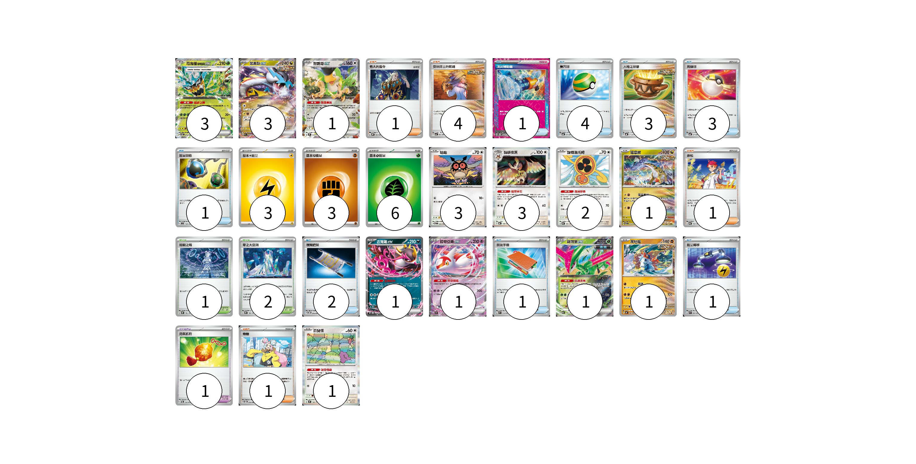 牌組構築方案 以此牌組為基礎新構築牌組 顯示卡面 顯示列表 寶可夢卡(21) 3 3 1 3 3 2 1 1 1 1 1 1 寶可夢道具(1) 1 物品卡(16) 1 4 3 3 1 2 1 1 支援者卡(7) 1 4 1 1 競技場卡(3) 1 2 能量卡(12) 3 3 6 寶可夢卡(21) 卡牌名稱 張數 卡牌名稱 張數 厄鬼椪 碧草面具ex SV6 016/101 03 猛雷鼓ex SV5K 053/071 03 怒鸚哥ex SV2P 065/071 01 咕咕 SV7 076/102 03 貓頭夜鷹 SV8a 128/187 03 旋轉洛托姆 SV8a 131/187 02 猛雷鼓 SV7 075/102 01 吉雉雞ex SVOM 009/021 01 拉帝亞斯ex SV7a 019/064 01 鐵斑葉ex SV8a 016/187 01 爬地翅 SV4K 041/066 01 百變怪 SV4a 144/190 01 寶可夢道具(1) 卡牌名稱 張數 卡牌名稱 張數 勇氣護符 SVEM 016/020 01 物品卡(16) 卡牌名稱 張數 卡牌名稱 張數 頂尖捕捉器 SV5M 062/071 01 巢穴球 SVHK 012/022 04 大地之容器 SVHK 011/022 03 高級球 SVHK 013/022 03 能量回收 SVD 110/139 01 夜間擔架 SVOM 016/021 02 朋友手冊 SVK 014/042 01 能量轉移 SVK 008/042 01 支援者卡(7) 卡牌名稱 張數 卡牌名稱 張數 老大的指令 SVHK 022/022 01 奧琳博士的氣魄 SV4K 064/066 04 赤松 SV8a 163/187 01 奇樹 SVOD 016/020 01 競技場卡(3) 卡牌名稱 張數 卡牌名稱 張數 阻礙之塔 SV8a 181/187 01 零之大空洞 SV8a 182/187 02 能量卡(12) 卡牌名稱 張數 卡牌名稱 張數 基本【雷】能量 SVHM LIG 03 基本【鬥】能量 SVF FIG 03 基本【草】能量 SVF GRA 06 以此牌組為基礎新構築牌組 牌組編碼 ZZEGPs-PNUewX-gISdlI copy 列印牌組單 牌組編碼已複製 分享至SNS
