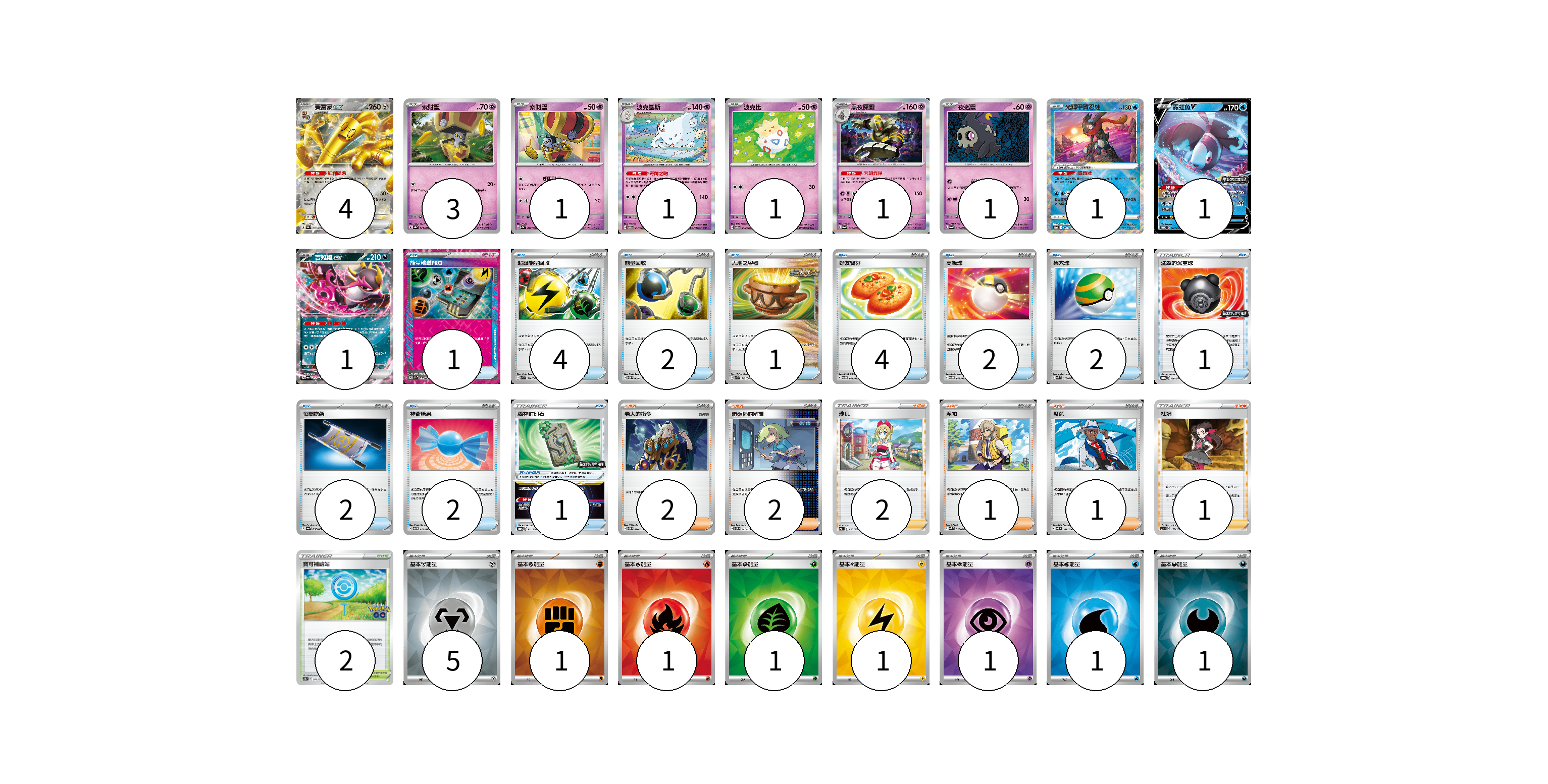 牌組構築方案 以此牌組為基礎新構築牌組 顯示卡面 顯示列表 寶可夢卡(15) 4 3 1 1 1 1 1 1 1 1 寶可夢道具(1) 1 物品卡(21) 1 4 2 1 4 2 2 1 2 2 支援者卡(9) 2 2 2 1 1 1 競技場卡(2) 2 能量卡(12) 5 1 1 1 1 1 1 1 寶可夢卡(15) 卡牌名稱 張數 卡牌名稱 張數 賽富豪ex SV3a 050/062 04 索財靈 SV3a 021/062 03 索財靈 SV3a 020/062 01 波克基斯 SV8 047/106 01 波克比 SV8 045/106 01 黑夜魔靈 SV6a 020/064 01 夜巡靈 SV6a 018/064 01 光輝甲賀忍蛙 S12a 033/172 01 霓虹魚V SV-P 134/SV-P 01 吉雉雞ex SV6a 038/064 01 寶可夢道具(1) 卡牌名稱 張數 卡牌名稱 張數 森林封印石 SV-P 141/SV-P 01 物品卡(21) 卡牌名稱 張數 卡牌名稱 張數 能量輸送PRO SV7a 052/064 01 超級能量回收 SVK 010/042 04 能量回收 SVTM 009/022 02 大地之容器 SVK 012/042 01 好友寶芬 SVTM 011/022 04 高級球 SVTM 012/022 02 巢穴球 SVK 016/042 02 洗翠的沉重球 SV-P 138/SV-P 01 夜間擔架 SV6a 056/064 02 神奇糖果 SVTM 013/022 02 支援者卡(9) 卡牌名稱 張數 卡牌名稱 張數 老大的指令 SVTM 020/022 02 暗碼迷的解讀 SV5M 067/071 02 珠貝 SVF 025/038 02 派帕 SVK 035/042 01 席藍 SV8 102/106 01 杜娟 S12a 157/172 01 競技場卡(2) 卡牌名稱 張數 卡牌名稱 張數 寶可補給站 S10b 071/071 02 能量卡(12) 卡牌名稱 張數 卡牌名稱 張數 基本【鋼】能量 SVK MET 05 基本【鬥】能量 SVK FIG 01 基本【火】能量 SVK FIR 01 基本【草】能量 SVK GRA 01 基本【雷】能量 SVK LIG 01 基本【超】能量 SVK PSY 01 基本【水】能量 SVK WAT 01 基本【惡】能量 SVK DAR 01 以此牌組為基礎新構築牌組 牌組編碼 ZiQcrd-FlRZgq-pblbBO copy 列印牌組單 牌組編碼已複製 分享至SNS