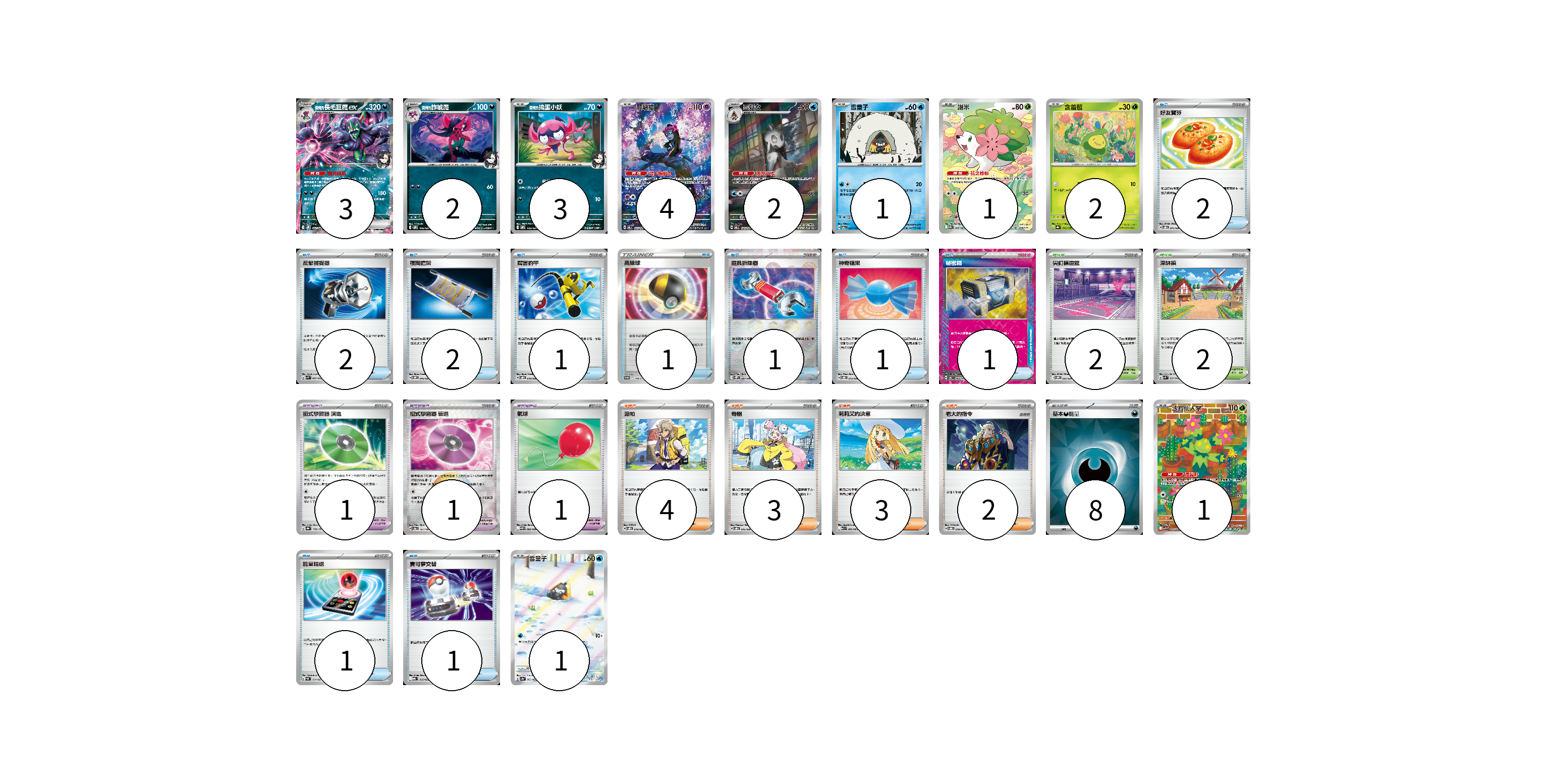 牌組構築方案 以此牌組為基礎新構築牌組 顯示卡面 顯示列表 寶可夢卡(20) 3 2 3 4 2 1 1 2 1 1 寶可夢道具(3) 1 1 1 物品卡(13) 2 2 2 1 1 1 1 1 1 1 支援者卡(12) 4 3 3 2 競技場卡(4) 2 2 能量卡(8) 8 寶可夢卡(20) 卡牌名稱 張數 卡牌名稱 張數 <瑪俐的>長毛巨魔ex SVOM 007/021 03 <瑪俐的>詐唬魔 SVOM 006/021 02 <瑪俐的>搗蛋小妖 SVOM 005/021 03 願增猿 SV6 107/101 04 雪妖女 SV6 104/101 02 雪童子 SV6 031/101 01 謝米 SV9a 066/063 01 含羞苞 SV8a 001/187 02 沙鈴仙人掌 SV9 101/100 01 雪童子 SV3a 063/062 01 寶可夢道具(3) 卡牌名稱 張數 卡牌名稱 張數 招式學習器 演進 SV8a 160/187 01 招式學習器 衰退 SV8a 161/187 01 氣球 SV11B 082/086 01 物品卡(13) 卡牌名稱 張數 卡牌名稱 張數 好友寶芬 SVOD 011/020 02 反擊捕捉器 SVK 009/042 02 夜間擔架 SVOM 016/021 02 厲害釣竿 SVOD 010/020 01 高級球 S-P 148/S-P 01 道具拆除器 SV11W 080/086 01 神奇糖果 SVOD 013/020 01 秘密箱 SV6 092/101 01 能量輸送 SVAL 011/021 01 寶可夢交替 MBG 015/022 01 支援者卡(12) 卡牌名稱 張數 卡牌名稱 張數 派帕 SVOD 018/020 04 奇樹 SVOD 016/020 03 莉莉艾的決意 M1L 062/063 03 老大的指令 SVOD 019/020 02 競技場卡(4) 卡牌名稱 張數 卡牌名稱 張數 尖釘鎮道館 SVOM 021/021 02 深缽鎮 SVK 039/042 02 能量卡(8) 卡牌名稱 張數 卡牌名稱 張數 基本【惡】能量 SVOM DAR 08 以此牌組為基礎新構築牌組 牌組編碼 ZihohV-FsdOuZ-PQKFKP copy 列印牌組單 牌組編碼已複製 分享至SNS