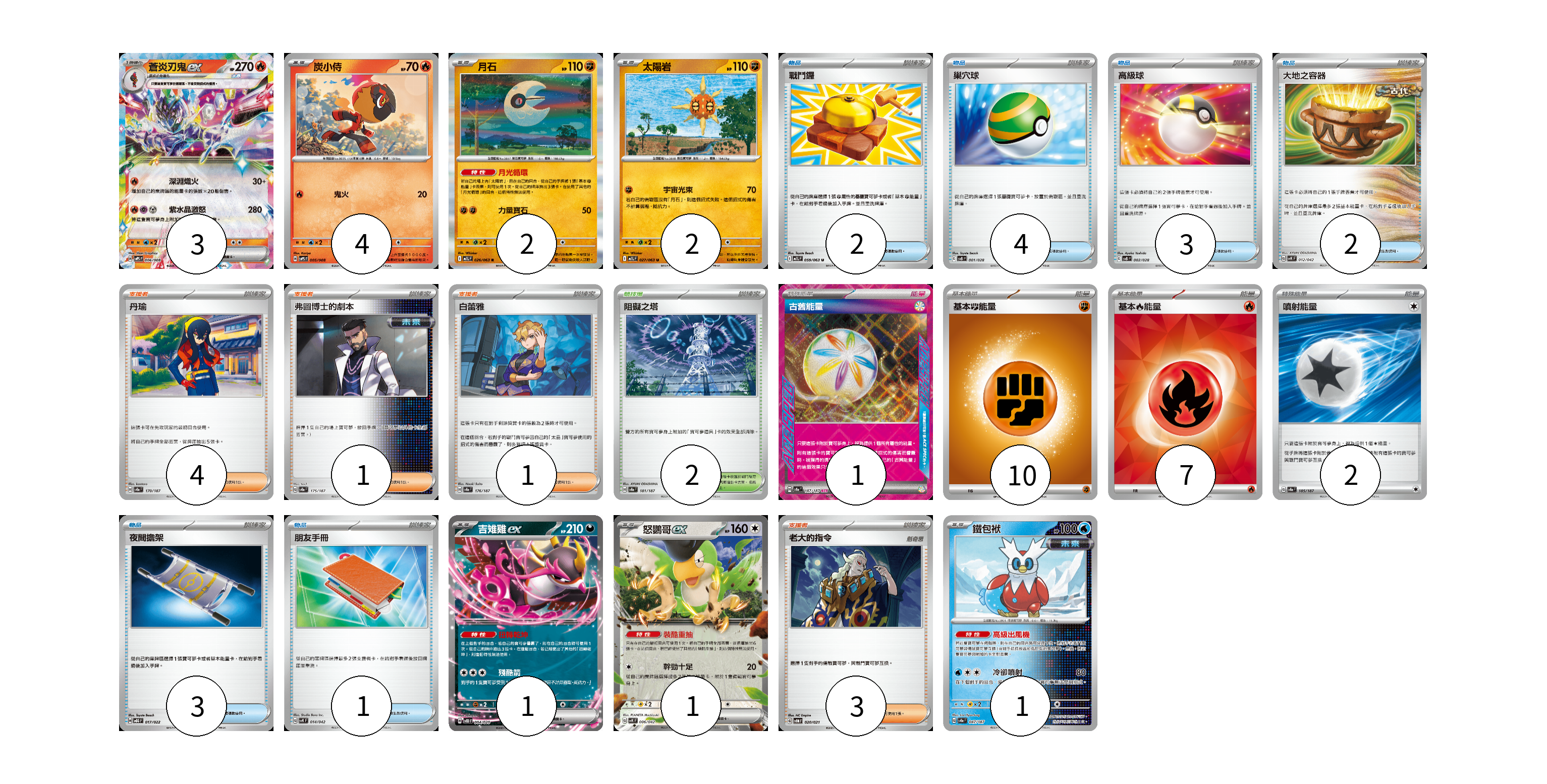 牌組構築方案 以此牌組為基礎新構築牌組 顯示卡面 顯示列表 寶可夢卡(14) 3 4 2 2 1 1 1 物品卡(15) 2 4 3 2 3 1 支援者卡(9) 4 1 1 3 競技場卡(2) 2 能量卡(20) 1 10 7 2 寶可夢卡(14) 卡牌名稱 張數 卡牌名稱 張數 蒼炎刃鬼ex SVPS 006/008 03 炭小侍 SVPS 005/008 04 月石 M1L 026/063 02 太陽岩 M1L 027/063 02 吉雉雞ex SVOD 004/020 01 怒鸚哥ex SVK 006/042 01 鐵包袱 SV8a 047/187 01 物品卡(15) 卡牌名稱 張數 卡牌名稱 張數 戰鬥鑼 M1L 059/063 02 巢穴球 SVB 001/028 04 高級球 SVB 002/028 03 大地之容器 SVK 012/042 02 夜間擔架 MBG 017/022 03 朋友手冊 SVK 014/042 01 支援者卡(9) 卡牌名稱 張數 卡牌名稱 張數 丹瑜 SV8a 170/187 04 弗圖博士的劇本 SV8a 175/187 01 白蕾雅 SV8a 176/187 01 老大的指令 SVOM 020/021 03 競技場卡(2) 卡牌名稱 張數 卡牌名稱 張數 阻礙之塔 SV8a 181/187 02 能量卡(20) 卡牌名稱 張數 卡牌名稱 張數 古舊能量 SV8a 187/187 01 基本【鬥】能量 M-P FIG 10 基本【火】能量 SVQL FIR 07 噴射能量 SV8a 185/187 02 以此牌組為基礎新構築牌組 牌組編碼 ZiyjZP-XohntQ-uzZciZ copy 列印牌組單 牌組編碼已複製 分享至SNS