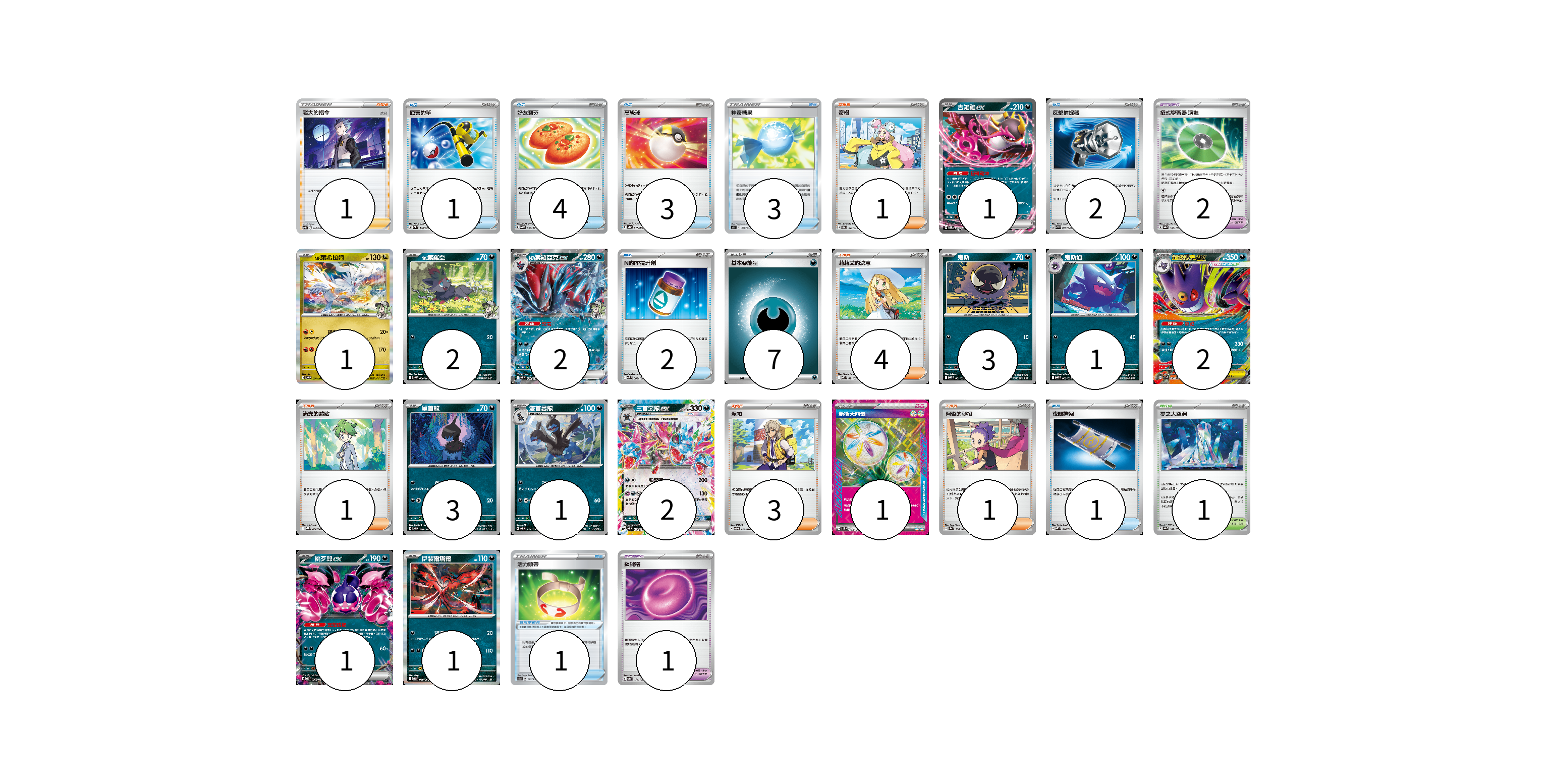 牌組構築方案 以此牌組為基礎新構築牌組 顯示卡面 顯示列表 寶可夢卡(20) 1 1 2 2 3 1 2 3 1 2 1 1 寶可夢道具(4) 2 1 1 物品卡(16) 1 4 3 3 2 2 1 支援者卡(11) 1 1 4 1 3 1 競技場卡(1) 1 能量卡(8) 7 1 寶可夢卡(20) 卡牌名稱 張數 卡牌名稱 張數 吉雉雞ex SVOM 009/021 01 N的萊希拉姆 SV9 074/100 01 N的索羅亞 SV9 060/100 02 N的索羅亞克ex SV9 061/100 02 鬼斯 MBG 001/022 03 鬼斯通 MBG 002/022 01 超級耿鬼ex MBG 003/022 02 單首龍 SV8 070/106 03 雙首暴龍 SV8 071/106 01 三首惡龍ex SV8 072/106 02 桃歹郎ex MBG 009/022 01 伊裴爾塔爾 M1L 040/063 01 寶可夢道具(4) 卡牌名稱 張數 卡牌名稱 張數 招式學習器 演進 SV8a 160/187 02 活力頭帶 SC1a 143/154 01 鎖鏈糬 SV8a 154/187 01 物品卡(16) 卡牌名稱 張數 卡牌名稱 張數 厲害釣竿 SV2P 066/071 01 好友寶芬 SV5K 063/071 04 高級球 SVHK 013/022 03 神奇糖果 SI 376/414 03 反擊捕捉器 SVK 009/042 02 N的PP提升劑 SV9 089/100 02 夜間擔架 MBD 016/022 01 支援者卡(11) 卡牌名稱 張數 卡牌名稱 張數 老大的指令(赤日) SVB 024/028 01 奇樹 SVEM 017/020 01 莉莉艾的決意 MBD 021/022 04 滿充的體貼 M1S 060/063 01 派帕 SVOD 018/020 03 阿杏的秘招 SV8a 166/187 01 競技場卡(1) 卡牌名稱 張數 卡牌名稱 張數 零之大空洞 SV8a 182/187 01 能量卡(8) 卡牌名稱 張數 卡牌名稱 張數 基本【惡】能量 MBG DAR 07 新衝天能量 SV5K 071/071 01 以此牌組為基礎新構築牌組 牌組編碼 ZkBhtu-eBozsI-AeIjDV copy 列印牌組單 牌組編碼已複製 分享至SNS
