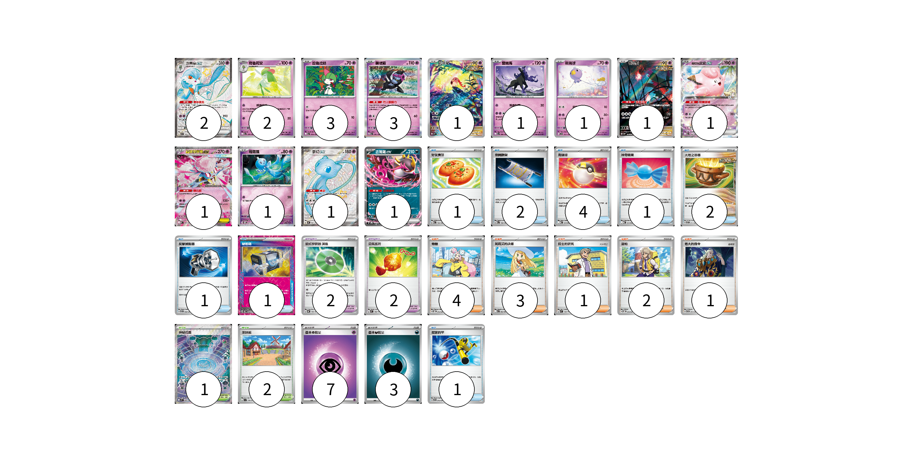 牌組構築方案 以此牌組為基礎新構築牌組 顯示卡面 顯示列表 寶可夢卡(19) 2 2 3 3 1 1 1 1 1 1 1 1 1 寶可夢道具(4) 2 2 物品卡(13) 1 2 4 1 2 1 1 1 支援者卡(11) 4 3 1 2 1 競技場卡(3) 1 2 能量卡(10) 7 3 寶可夢卡(19) 卡牌名稱 張數 卡牌名稱 張數 沙奈朵ex SV4a 328/190 02 奇魯莉安 M2a 070/193 02 拉魯拉絲 M2a 069/193 03 願增猿 M2a 081/193 03 吼叫尾 SV4K 071/066 01 靈幽馬 M2a 080/193 01 飄飄球 SVD 052/139 01 振翼髮 SV5K 076/071 01 莉莉艾的皮皮ex M2a 060/193 01 超級蒂安希ex MBD 006/022 01 輕飄飄 SV11W 041/086 01 夢幻ex SV4a 327/190 01 吉雉雞ex SVOD 004/020 01 寶可夢道具(4) 卡牌名稱 張數 卡牌名稱 張數 招式學習器 演進 SV8a 160/187 02 勇氣護符 SVM 142/175 02 物品卡(13) 卡牌名稱 張數 卡牌名稱 張數 好友寶芬 M2a 153/193 01 夜間擔架 M2a 159/193 02 高級球 MBD 014/022 04 神奇糖果 MBG 013/022 01 大地之容器 SVTS 011/022 02 反擊捕捉器 SVTS 009/022 01 秘密箱 SV6 092/101 01 厲害釣竿 SVTR 012/021 01 支援者卡(11) 卡牌名稱 張數 卡牌名稱 張數 奇樹 SVOD 016/020 04 莉莉艾的決意 M1L 062/063 03 博士的研究 SVM 162/175 01 派帕 SVOD 018/020 02 老大的指令 SVTH 017/018 01 競技場卡(3) 卡牌名稱 張數 卡牌名稱 張數 神秘花園 M1S 086/063 01 深缽鎮 SV1a 070/073 02 能量卡(10) 卡牌名稱 張數 卡牌名稱 張數 基本【超】能量 MBD PSY 07 基本【惡】能量 MBG DAR 03 以此牌組為基礎新構築牌組 牌組編碼 ZqjBMr-AbdWDe-GrprVf copy 列印牌組單 牌組編碼已複製 分享至SNS