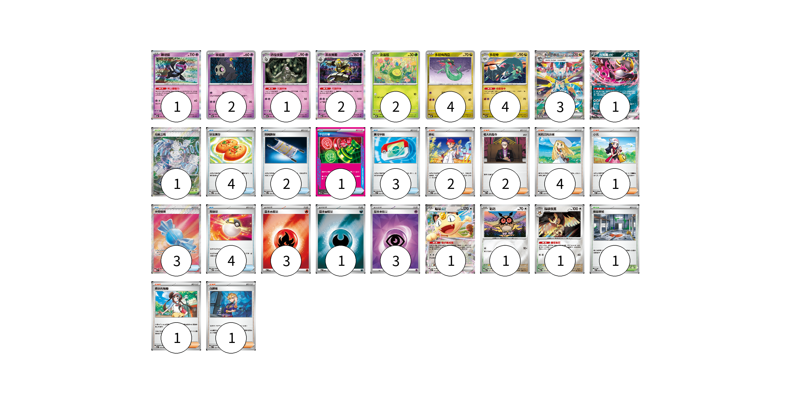 牌組構築方案 以此牌組為基礎新構築牌組 顯示卡面 顯示列表 寶可夢卡(23) 1 2 1 2 2 4 4 3 1 1 1 1 物品卡(17) 4 2 1 3 3 4 支援者卡(11) 2 2 4 1 1 1 競技場卡(2) 1 1 能量卡(7) 3 1 3 寶可夢卡(23) 卡牌名稱 張數 卡牌名稱 張數 願增猿 SV8a 075/187 01 夜巡靈 SV8a 064/187 02 彷徨夜靈 SV8a 065/187 01 黑夜魔靈 SV8a 066/187 02 含羞苞 SV8a 001/187 02 多龍梅西亞 SV8a 118/187 04 多龍奇 SV8a 119/187 04 多龍巴魯托ex SV8a 221/187 03 吉雉雞ex M2a 114/193 01 喵喵ex M3 061/080 01 咕咕 M2a 137/193 01 貓頭夜鷹 M2a 138/193 01 物品卡(17) 卡牌名稱 張數 卡牌名稱 張數 好友寶芬 M2a 153/193 04 夜間擔架 M2a 159/193 02 不公印章 MC 633/742 01 寶可平板 MC 662/742 03 神奇糖果 M1S 082/063 03 高級球 MBG 012/022 04 支援者卡(11) 卡牌名稱 張數 卡牌名稱 張數 赤松 MC 696/742 02 老大的指令 MC 724/742 02 莉莉艾的決意 MC 729/742 04 小光 M2 077/080 01 鳴依的勉勵 M3 075/080 01 白蕾雅 MC 722/742 01 競技場卡(2) 卡牌名稱 張數 卡牌名稱 張數 阻礙之塔 M2a 222/193 01 險惡廢墟 M1L 063/063 01 能量卡(7) 卡牌名稱 張數 卡牌名稱 張數 基本【火】能量 MC FIR 03 基本【惡】能量 MC DAR 01 基本【超】能量 SVOD PSY 03 以此牌組為基礎新構築牌組 牌組編碼 ZrnhxB-pXKSHt-panSXX copy 列印牌組單 牌組編碼已複製 分享至SNS
