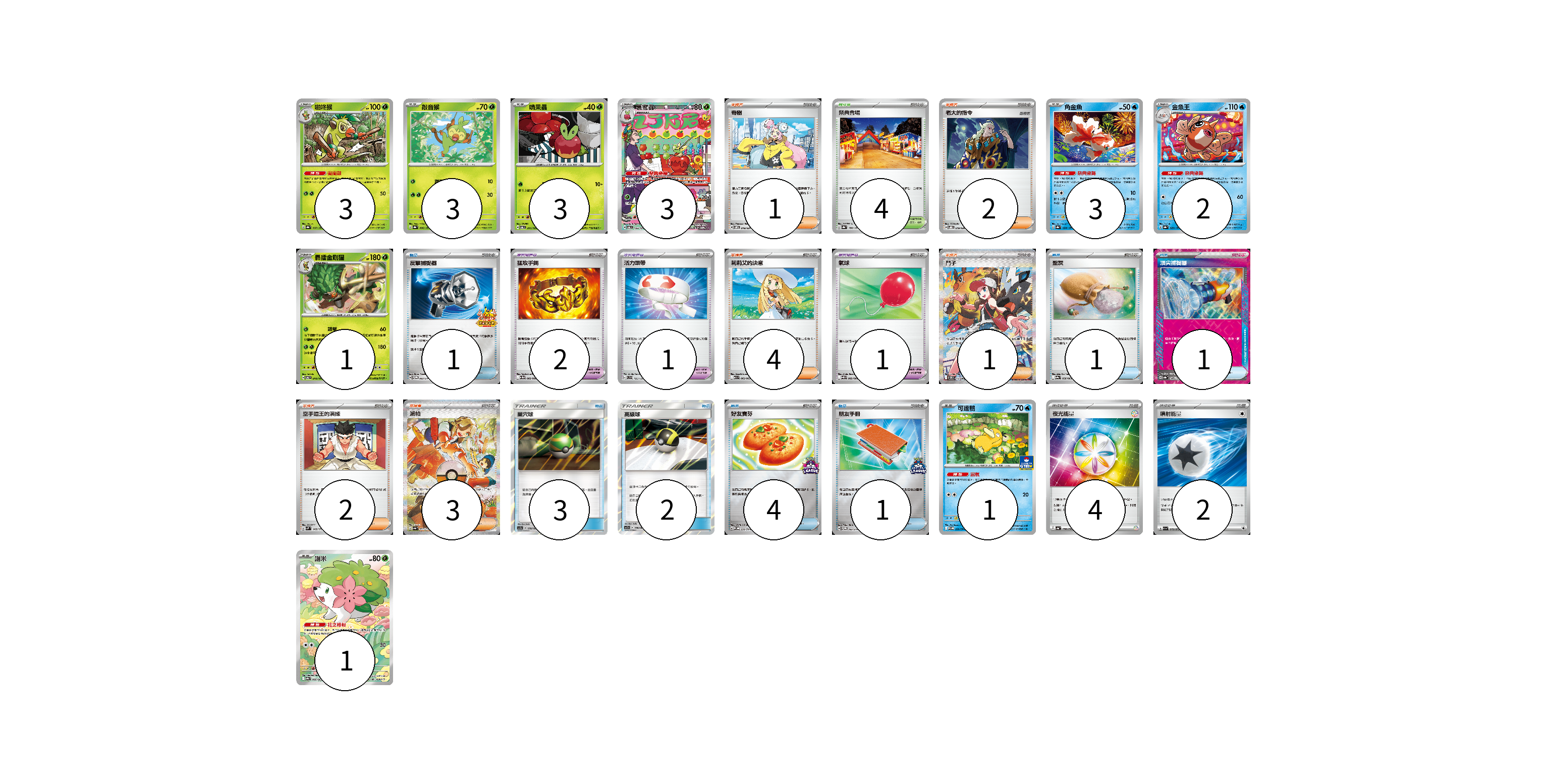 牌組構築方案 以此牌組為基礎新構築牌組 顯示卡面 顯示列表 寶可夢卡(20) 3 3 3 3 3 2 1 1 1 寶可夢道具(4) 2 1 1 物品卡(13) 1 1 1 3 2 4 1 支援者卡(13) 1 2 4 1 2 3 競技場卡(4) 4 能量卡(6) 4 2 寶可夢卡(20) 卡牌名稱 張數 卡牌名稱 張數 啪咚猴 SV8a 007/187 03 敲音猴 SV8a 006/187 03 啃果蟲 SV6 011/101 03 裹蜜蟲 SV6 103/101 03 角金魚 SV8a 028/187 03 金魚王 SV8a 029/187 02 轟擂金剛猩 SV6 010/101 01 可達鴨 SV-P 220/SV-P 01 謝米 SV9a 066/063 01 寶可夢道具(4) 卡牌名稱 張數 卡牌名稱 張數 猛攻手鐲 SV11W 082/086 02 活力頭帶 SVD 125/139 01 氣球 SV11B 082/086 01 物品卡(13) 卡牌名稱 張數 卡牌名稱 張數 反擊捕捉器 SV-P 083/SV-P 01 聖灰 SV9a 056/063 01 頂尖捕捉器 SV8a 148/187 01 巢穴球 AS5a 178/184 03 高級球 AS5b 178/186 02 好友寶芬 SV-P 230/SV-P 04 朋友手冊 SV-P 182/SV-P 01 支援者卡(13) 卡牌名稱 張數 卡牌名稱 張數 奇樹 SVOM 018/021 01 老大的指令 SVOD 019/020 02 莉莉艾的決意 M1L 062/063 04 鬥子 SV11W 173/086 01 空手道王的演練 SVM 143/175 02 派帕 SV4a 353/190 03 競技場卡(4) 卡牌名稱 張數 卡牌名稱 張數 祭典會場 SV8a 180/187 04 能量卡(6) 卡牌名稱 張數 卡牌名稱 張數 夜光能量 SV4a 190/190 04 噴射能量 SV1a 072/073 02 以此牌組為基礎新構築牌組 牌組編碼 ZsXsxa-xwnEvE-MFseri copy 列印牌組單 牌組編碼已複製 分享至SNS