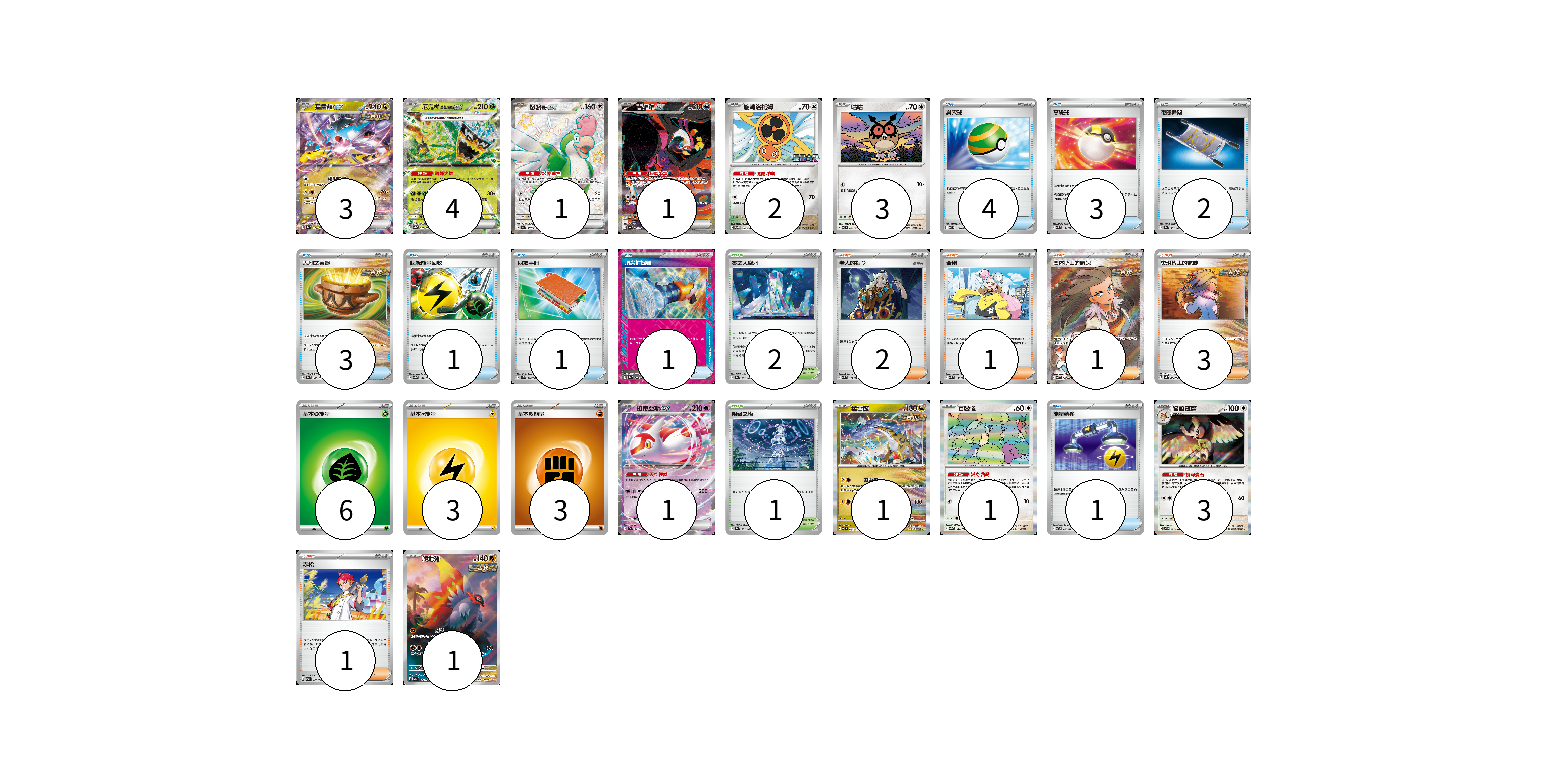 牌組構築方案 以此牌組為基礎新構築牌組 顯示卡面 顯示列表 寶可夢卡(21) 3 4 1 1 2 3 1 1 1 3 1 物品卡(16) 4 3 2 3 1 1 1 1 支援者卡(8) 2 1 1 3 1 競技場卡(3) 2 1 能量卡(12) 6 3 3 寶可夢卡(21) 卡牌名稱 張數 卡牌名稱 張數 猛雷鼓ex SV8a 124/187 03 厄鬼椪 碧草面具ex SV8a 020/187 04 怒鸚哥ex SV4a 337/190 01 吉雉雞ex SV6a 089/064 01 旋轉洛托姆 SV-P 146/SV-P 02 咕咕 SV7 076/102 03 拉帝亞斯ex SV7a 019/064 01 猛雷鼓 SV7 075/102 01 百變怪 SV4a 144/190 01 貓頭夜鷹 SV7 077/102 03 爬地翅 SV4K 074/066 01 物品卡(16) 卡牌名稱 張數 卡牌名稱 張數 巢穴球 SVEL 011/020 04 高級球 SVM 134/175 03 夜間擔架 SV8a 151/187 02 大地之容器 SV8a 143/187 03 超級能量回收 SV8a 141/187 01 朋友手冊 SVK 014/042 01 頂尖捕捉器 SV8a 148/187 01 能量轉移 SVTR 010/021 01 支援者卡(8) 卡牌名稱 張數 卡牌名稱 張數 老大的指令 SVM 172/175 02 奇樹 SVM 160/175 01 奧琳博士的氣魄 SV4K 085/066 01 奧琳博士的氣魄 SV4K 064/066 03 赤松 SVK 027/042 01 競技場卡(3) 卡牌名稱 張數 卡牌名稱 張數 零之大空洞 SV8a 182/187 02 阻礙之塔 SV8a 181/187 01 能量卡(12) 卡牌名稱 張數 卡牌名稱 張數 基本【草】能量 SVTM GRA 06 基本【雷】能量 SVTR LIG 03 基本【鬥】能量 SVTG FIG 03 以此牌組為基礎新構築牌組 牌組編碼 ZsyBsK-qoBgQl-zTEicP copy 列印牌組單 牌組編碼已複製 分享至SNS