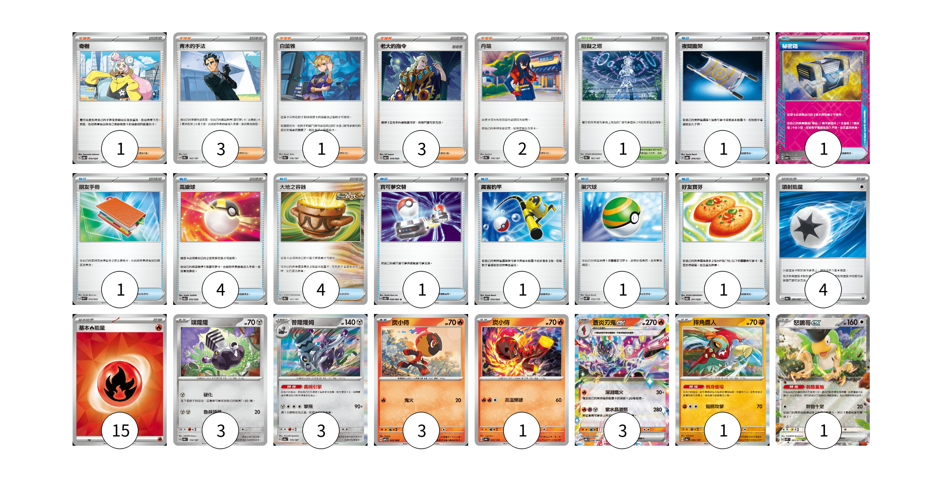 牌組構築方案 以此牌組為基礎新構築牌組 顯示卡面 顯示列表 寶可夢卡(15) 3 3 3 1 3 1 1 物品卡(15) 1 1 1 4 4 1 1 1 1 支援者卡(10) 1 3 1 3 2 競技場卡(1) 1 能量卡(19) 4 15 寶可夢卡(15) 卡牌名稱 張數 卡牌名稱 張數 噗隆隆 SV8a 114/187 03 普隆隆姆 SV8a 115/187 03 炭小侍 SVPS 005/008 03 炭小侍 SV4a 033/190 01 蒼炎刃鬼ex SVPS 006/008 03 摔角鷹人 SV8a 084/187 01 怒鸚哥ex SV2P 065/071 01 物品卡(15) 卡牌名稱 張數 卡牌名稱 張數 夜間擔架 SVOM 016/021 01 秘密箱 SV6 092/101 01 朋友手冊 SVK 014/042 01 高級球 SVOD 012/020 04 大地之容器 SV8a 143/187 04 寶可夢交替 SV9a 058/063 01 厲害釣竿 SVOD 010/020 01 巢穴球 SVM 133/175 01 好友寶芬 SVOD 011/020 01 支援者卡(10) 卡牌名稱 張數 卡牌名稱 張數 奇樹 SVOD 016/020 01 青木的手法 SV8a 162/187 03 白蕾雅 SV8a 176/187 01 老大的指令 SVOD 019/020 03 丹瑜 SV8a 170/187 02 競技場卡(1) 卡牌名稱 張數 卡牌名稱 張數 阻礙之塔 SV8a 181/187 01 能量卡(19) 卡牌名稱 張數 卡牌名稱 張數 噴射能量 SV8a 185/187 04 基本【火】能量 SVM FIR 15 以此牌組為基礎新構築牌組 牌組編碼 ZuiKGI-iPhhzC-enmgmG copy 列印牌組單 牌組編碼已複製 分享至SNS