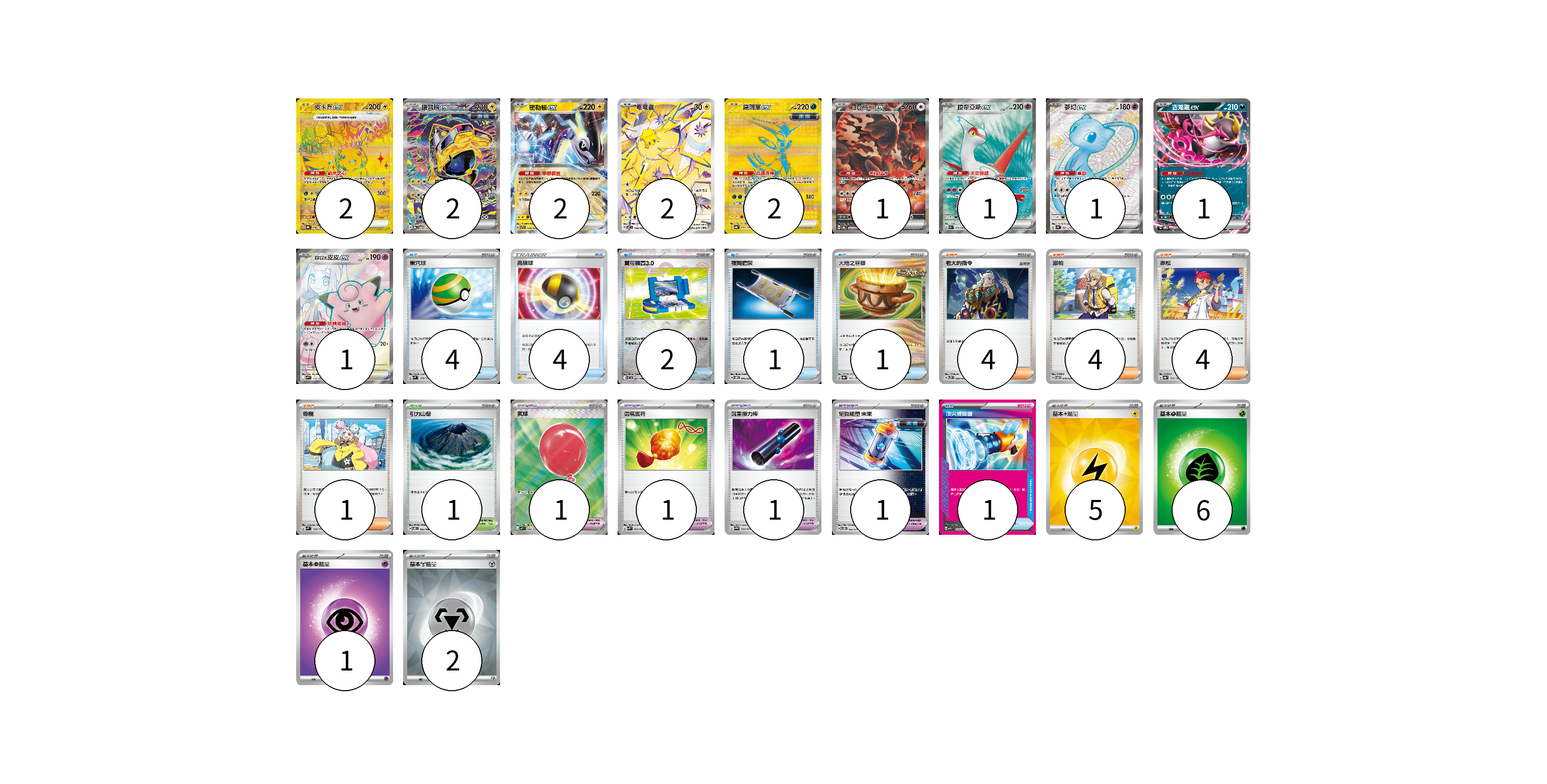 牌組構築方案 以此牌組為基礎新構築牌組 顯示卡面 顯示列表 寶可夢卡(15) 2 2 2 2 2 1 1 1 1 1 寶可夢道具(4) 1 1 1 1 物品卡(13) 4 4 2 1 1 1 支援者卡(13) 4 4 4 1 競技場卡(1) 1 能量卡(14) 5 6 1 2 寶可夢卡(15) 卡牌名稱 張數 卡牌名稱 張數 皮卡丘ex SV8a 236/187 02 鐵臂膀ex SV8a 210/187 02 密勒頓ex SVTR 008/021 02 電電蟲 SV7 108/102 02 鐵斑葉ex SV8a 233/187 02 月月熊 赫月ex SV8a 225/187 01 拉帝亞斯ex SV7a 078/064 01 夢幻ex SV4a 327/190 01 吉雉雞ex SVOD 004/020 01 莉莉艾的皮皮ex SV9 115/100 01 寶可夢道具(4) 卡牌名稱 張數 卡牌名稱 張數 氣球 M1L 084/063 01 勇氣護符 SVK 024/042 01 沉重接力棒 SV5M 066/071 01 驅勁能量 未來 SV5M 065/071 01 物品卡(13) 卡牌名稱 張數 卡牌名稱 張數 巢穴球 SVM 133/175 04 高級球 SDP 015/022 04 寶可裝置3.0 SV11B 081/086 02 夜間擔架 SVOM 016/021 01 大地之容器 SV8a 143/187 01 頂尖捕捉器 MBG 014/022 01 支援者卡(13) 卡牌名稱 張數 卡牌名稱 張數 老大的指令 SVTS 020/022 04 派帕 SVTM 019/022 04 赤松 SV8a 163/187 04 奇樹 SVM 160/175 01 競技場卡(1) 卡牌名稱 張數 卡牌名稱 張數 引力山岳 SV8 106/106 01 能量卡(14) 卡牌名稱 張數 卡牌名稱 張數 基本【雷】能量 SVQP LIG 05 基本【草】能量 M-P GRA 06 基本【超】能量 M-P PSY 01 基本【鋼】能量 SVOD MET 02 以此牌組為基礎新構築牌組 牌組編碼 ZvnPyC-xXYaUZ-fujwyS copy 列印牌組單 牌組編碼已複製 分享至SNS