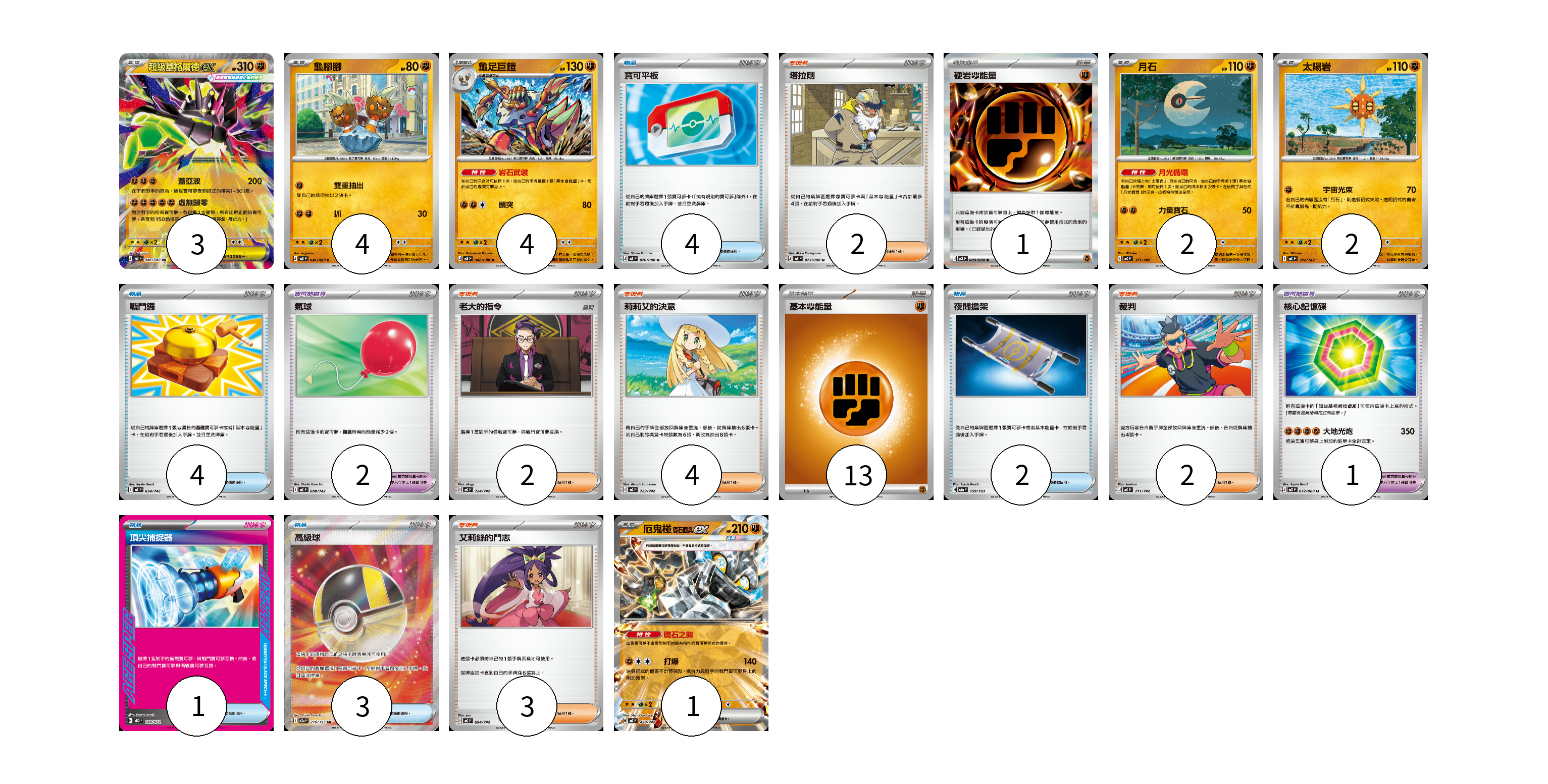 牌組構築方案 以此牌組為基礎新構築牌組 顯示卡面 顯示列表 寶可夢卡(16) 3 4 4 2 2 1 寶可夢道具(3) 2 1 物品卡(14) 4 4 2 1 3 支援者卡(13) 2 2 4 2 3 能量卡(14) 1 13 寶可夢卡(16) 卡牌名稱 張數 卡牌名稱 張數 超級基格爾德ex M3 046/080 03 龜腳腳 M3 041/080 04 龜足巨鎧 M3 042/080 04 月石 MC 371/742 02 太陽岩 MC 372/742 02 厄鬼椪 礎石面具ex MC 428/742 01 寶可夢道具(3) 卡牌名稱 張數 卡牌名稱 張數 氣球 MC 688/742 02 核心記憶碟 M3 072/080 01 物品卡(14) 卡牌名稱 張數 卡牌名稱 張數 寶可平板 M3 070/080 04 戰鬥鑼 MC 654/742 04 夜間擔架 M2a 159/193 02 頂尖捕捉器 MBG 014/022 01 高級球 M2a 216/193 03 支援者卡(13) 卡牌名稱 張數 卡牌名稱 張數 塔拉剛 M3 073/080 02 老大的指令 MC 724/742 02 莉莉艾的決意 MC 729/742 04 裁判 MC 711/742 02 艾莉絲的鬥志 MC 694/742 03 能量卡(14) 卡牌名稱 張數 卡牌名稱 張數 硬岩【鬥】能量 M3 080/080 01 基本【鬥】能量 MC FIG 13 以此牌組為基礎新構築牌組 牌組編碼 aAFOqP-fVlQhE-WzvQmB copy 列印牌組單 牌組編碼已複製 分享至SNS