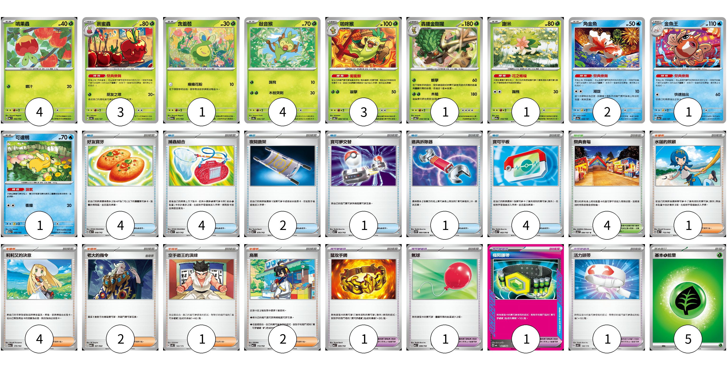 牌組構築方案 以此牌組為基礎新構築牌組 顯示卡面 顯示列表 寶可夢卡(21) 4 3 1 4 3 1 1 2 1 1 寶可夢道具(4) 1 1 1 1 物品卡(16) 4 4 2 1 1 4 支援者卡(10) 1 4 2 1 2 競技場卡(4) 4 能量卡(5) 5 寶可夢卡(21) 卡牌名稱 張數 卡牌名稱 張數 啃果蟲 MC 062/742 04 裹蜜蟲 SV8a 009/187 03 含羞苞 M2a 011/193 01 敲音猴 SV8a 006/187 04 啪咚猴 SV6 009/101 03 轟擂金剛猩 SV6 010/101 01 謝米 M2a 012/193 01 角金魚 SV8a 028/187 02 金魚王 SV8a 029/187 01 可達鴨 M2a 032/193 01 寶可夢道具(4) 卡牌名稱 張數 卡牌名稱 張數 猛攻手鐲 MC 689/742 01 氣球 MC 688/742 01 極限腰帶 MC 691/742 01 活力頭帶 SVM 140/175 01 物品卡(16) 卡牌名稱 張數 卡牌名稱 張數 好友寶芬 MC 648/742 04 捕蟲組合 MC 667/742 04 夜間擔架 MC 670/742 02 寶可夢交替 MC 663/742 01 道具拆除器 SV11W 080/086 01 寶可平板 MC 662/742 04 支援者卡(10) 卡牌名稱 張數 卡牌名稱 張數 水蓮的照顧 MC 712/742 01 莉莉艾的決意 M2a 175/193 04 老大的指令 MBG 021/022 02 空手道王的演練 SVM 143/175 01 烏栗 MC 713/742 02 競技場卡(4) 卡牌名稱 張數 卡牌名稱 張數 祭典會場 SV6 099/101 04 能量卡(5) 卡牌名稱 張數 卡牌名稱 張數 基本【草】能量 MC GRA 05 以此牌組為基礎新構築牌組 牌組編碼 aBzFms-aLtSXo-zvrfLM copy 列印牌組單 牌組編碼已複製 分享至SNS