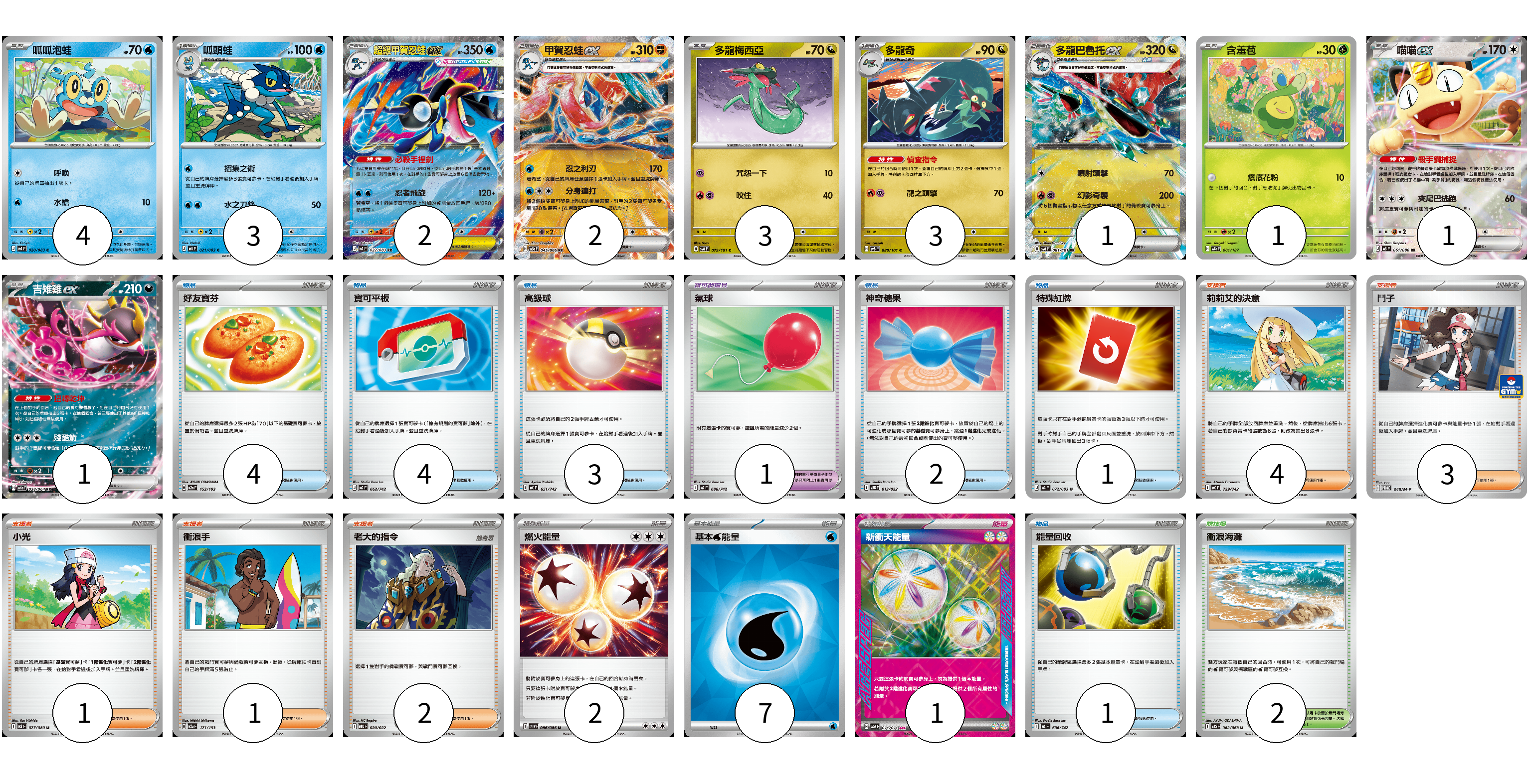 牌組構築方案 以此牌組為基礎新構築牌組 顯示卡面 顯示列表 寶可夢卡(21) 4 3 2 2 3 3 1 1 1 1 寶可夢道具(1) 1 物品卡(15) 4 4 3 2 1 1 支援者卡(11) 4 3 1 1 2 競技場卡(2) 2 能量卡(10) 2 7 1 寶可夢卡(21) 卡牌名稱 張數 卡牌名稱 張數 呱呱泡蛙 M4 020/083 04 呱頭蛙 M4 021/083 03 超級甲賀忍蛙ex M4 022/083 02 甲賀忍蛙ex SV5a 045/066 02 多龍梅西亞 SV6 079/101 03 多龍奇 SV6 080/101 03 多龍巴魯托ex SV6 081/101 01 含羞苞 SV8a 001/187 01 喵喵ex M3 061/080 01 吉雉雞ex SV6a 038/064 01 寶可夢道具(1) 卡牌名稱 張數 卡牌名稱 張數 氣球 MC 688/742 01 物品卡(15) 卡牌名稱 張數 卡牌名稱 張數 好友寶芬 M2a 153/193 04 寶可平板 MC 662/742 04 高級球 MC 651/742 03 神奇糖果 MBG 013/022 02 特殊紅牌 M4 072/083 01 能量回收 MC 636/742 01 支援者卡(11) 卡牌名稱 張數 卡牌名稱 張數 莉莉艾的決意 MC 729/742 04 鬥子 M-P 048/M-P 03 小光 M2 077/080 01 衝浪手 M2a 171/193 01 老大的指令 MBD 020/022 02 競技場卡(2) 卡牌名稱 張數 卡牌名稱 張數 衝浪海灘 M1S 062/063 02 能量卡(10) 卡牌名稱 張數 卡牌名稱 張數 燃火能量 SV11W 086/086 02 基本【水】能量 SVM WAT 07 新衝天能量 SV5K 071/071 01 以此牌組為基礎新構築牌組 牌組編碼 aDsYFk-FLMcVT-kEsgdV copy 列印牌組單 牌組編碼已複製 分享至SNS