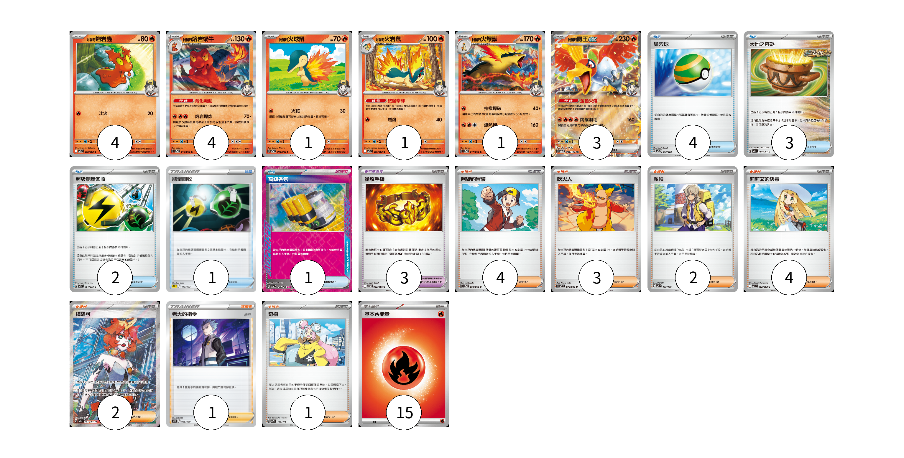 牌組構築方案 以此牌組為基礎新構築牌組 顯示卡面 顯示列表 寶可夢卡(14) 4 4 1 1 1 3 寶可夢道具(3) 3 物品卡(11) 4 3 2 1 1 支援者卡(17) 4 3 2 4 2 1 1 能量卡(15) 15 寶可夢卡(14) 卡牌名稱 張數 卡牌名稱 張數 <阿響的>熔岩蟲 SV9a 018/063 04 <阿響的>熔岩蝸牛 SV9a 019/063 04 <阿響的>火球鼠 SV9a 015/063 01 <阿響的>火岩鼠 SV9a 016/063 01 <阿響的>火爆獸 SV9a 017/063 01 <阿響的>鳳王ex M2a 021/193 03 寶可夢道具(3) 卡牌名稱 張數 卡牌名稱 張數 猛攻手鐲 SV11W 082/086 03 物品卡(11) 卡牌名稱 張數 卡牌名稱 張數 巢穴球 SVTS 013/022 04 大地之容器 SV4K 060/066 03 超級能量回收 SV1a 064/073 02 能量回收 SDP 013/022 01 高級香氛 SV5a 055/066 01 支援者卡(17) 卡牌名稱 張數 卡牌名稱 張數 阿響的冒險 SV9a 063/063 04 吹火人 M2 078/080 03 派帕 SVD 137/139 02 莉莉艾的決意 M1L 062/063 04 梅洛可 SV4K 087/066 02 老大的指令(赤日) SK 025/030 01 奇樹 SVM 160/175 01 能量卡(15) 卡牌名稱 張數 卡牌名稱 張數 基本【火】能量 M-P FIR 15 以此牌組為基礎新構築牌組 牌組編碼 aDxTqR-bMgAEG-tXikOc copy 列印牌組單 牌組編碼已複製 分享至SNS