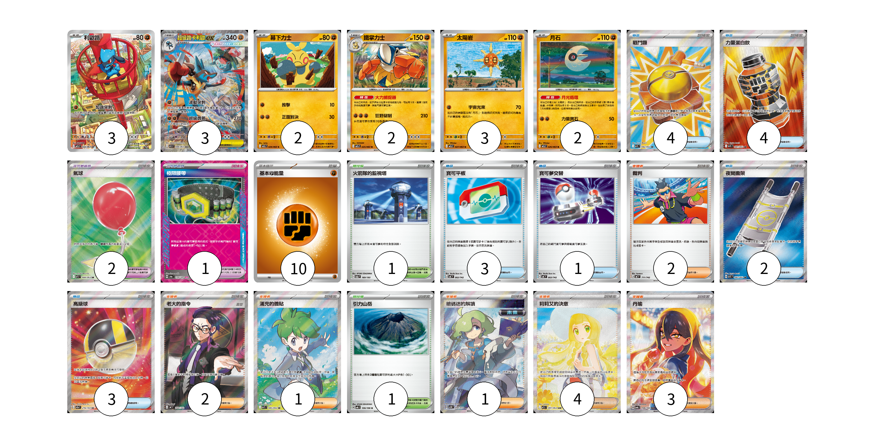牌組構築方案 以此牌組為基礎新構築牌組 顯示卡面 顯示列表 寶可夢卡(15) 3 3 2 2 3 2 寶可夢道具(3) 2 1 物品卡(17) 4 4 3 1 2 3 支援者卡(13) 2 2 1 1 4 3 競技場卡(2) 1 1 能量卡(10) 10 寶可夢卡(15) 卡牌名稱 張數 卡牌名稱 張數 利歐路 M1L 068/063 03 超級路卡利歐ex M1L 088/063 03 幕下力士 M1L 024/063 02 鐵掌力士 M1L 025/063 02 太陽岩 M1L 027/063 03 月石 M1L 026/063 02 寶可夢道具(3) 卡牌名稱 張數 卡牌名稱 張數 氣球 M1L 084/063 02 極限腰帶 SV8a 159/187 01 物品卡(17) 卡牌名稱 張數 卡牌名稱 張數 戰鬥鑼 M1L 082/063 04 力量蛋白飲 M1L 081/063 04 寶可平板 MC 662/742 03 寶可夢交替 MC 663/742 01 夜間擔架 M1L 083/063 02 高級球 M2a 216/193 03 支援者卡(13) 卡牌名稱 張數 卡牌名稱 張數 裁判 MC 711/742 02 老大的指令(烏羽) MC 760/742 02 滿充的體貼 M1S 085/063 01 暗碼迷的解讀 SV5M 090/071 01 莉莉艾的決意 M1L 091/063 04 丹瑜 SV6 130/101 03 競技場卡(2) 卡牌名稱 張數 卡牌名稱 張數 火箭隊的監視塔 M2a 189/193 01 引力山岳 SV8 106/106 01 能量卡(10) 卡牌名稱 張數 卡牌名稱 張數 基本【鬥】能量 M-P FIG 10 以此牌組為基礎新構築牌組 牌組編碼 aGkUCK-DpJyhj-DomXrK copy 列印牌組單 牌組編碼已複製 分享至SNS