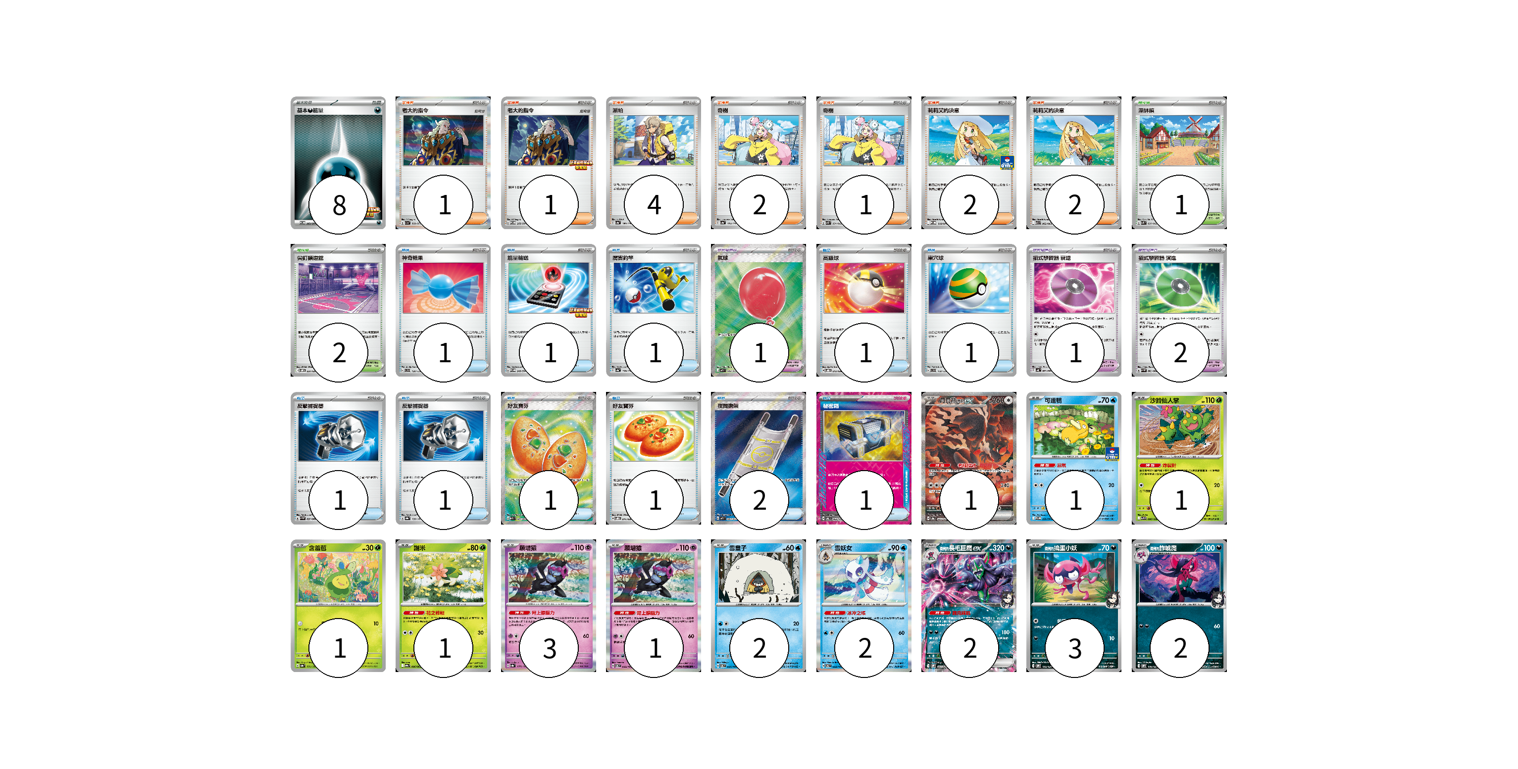 牌組構築方案 以此牌組為基礎新構築牌組 顯示卡面 顯示列表 寶可夢卡(20) 1 1 1 1 1 3 1 2 2 2 3 2 寶可夢道具(4) 1 1 2 物品卡(12) 1 1 1 1 1 1 1 1 1 2 1 支援者卡(13) 1 1 4 2 1 2 2 競技場卡(3) 1 2 能量卡(8) 8 寶可夢卡(20) 卡牌名稱 張數 卡牌名稱 張數 月月熊 赫月ex SV8a 225/187 01 可達鴨 SV-P 220/SV-P 01 沙鈴仙人掌 SV9 006/100 01 含羞苞 SV8a 001/187 01 謝米 SV9a 006/063 01 願增猿 SV8a 075/187 03 願增猿 SV6 055/101 01 雪童子 SV6 031/101 02 雪妖女 SV6 033/101 02 <瑪俐的>長毛巨魔ex SVOM 007/021 02 <瑪俐的>搗蛋小妖 SVOM 005/021 03 <瑪俐的>詐唬魔 SVOM 006/021 02 寶可夢道具(4) 卡牌名稱 張數 卡牌名稱 張數 氣球 M1L 084/063 01 招式學習器 衰退 SV4K 063/066 01 招式學習器 演進 SV4M 063/066 02 物品卡(12) 卡牌名稱 張數 卡牌名稱 張數 神奇糖果 SVD 120/139 01 能量輸送 SV-P 249/SV-P 01 厲害釣竿 SV4a 158/190 01 高級球 SVOD 012/020 01 巢穴球 SVD 118/139 01 反擊捕捉器 SV4M 059/066 01 反擊捕捉器 SV8a 139/187 01 好友寶芬 M1S 081/063 01 好友寶芬 SVOD 011/020 01 夜間擔架 M1L 083/063 02 秘密箱 SV6 092/101 01 支援者卡(13) 卡牌名稱 張數 卡牌名稱 張數 老大的指令 SV1a 069/073 01 老大的指令 SV-P 255/SV-P 01 派帕 SV4a 180/190 04 奇樹 SV4a 174/190 02 奇樹 SVK 031/042 01 莉莉艾的決意 M-P 018/M-P 02 莉莉艾的決意 M1L 062/063 02 競技場卡(3) 卡牌名稱 張數 卡牌名稱 張數 深缽鎮 SVK 039/042 01 尖釘鎮道館 SVOM 021/021 02 能量卡(8) 卡牌名稱 張數 卡牌名稱 張數 基本【惡】能量 SV-P 263/SV-P 08 以此牌組為基礎新構築牌組 牌組編碼 aJIZQu-tuOsBh-qGrKyg copy 列印牌組單 牌組編碼已複製 分享至SNS