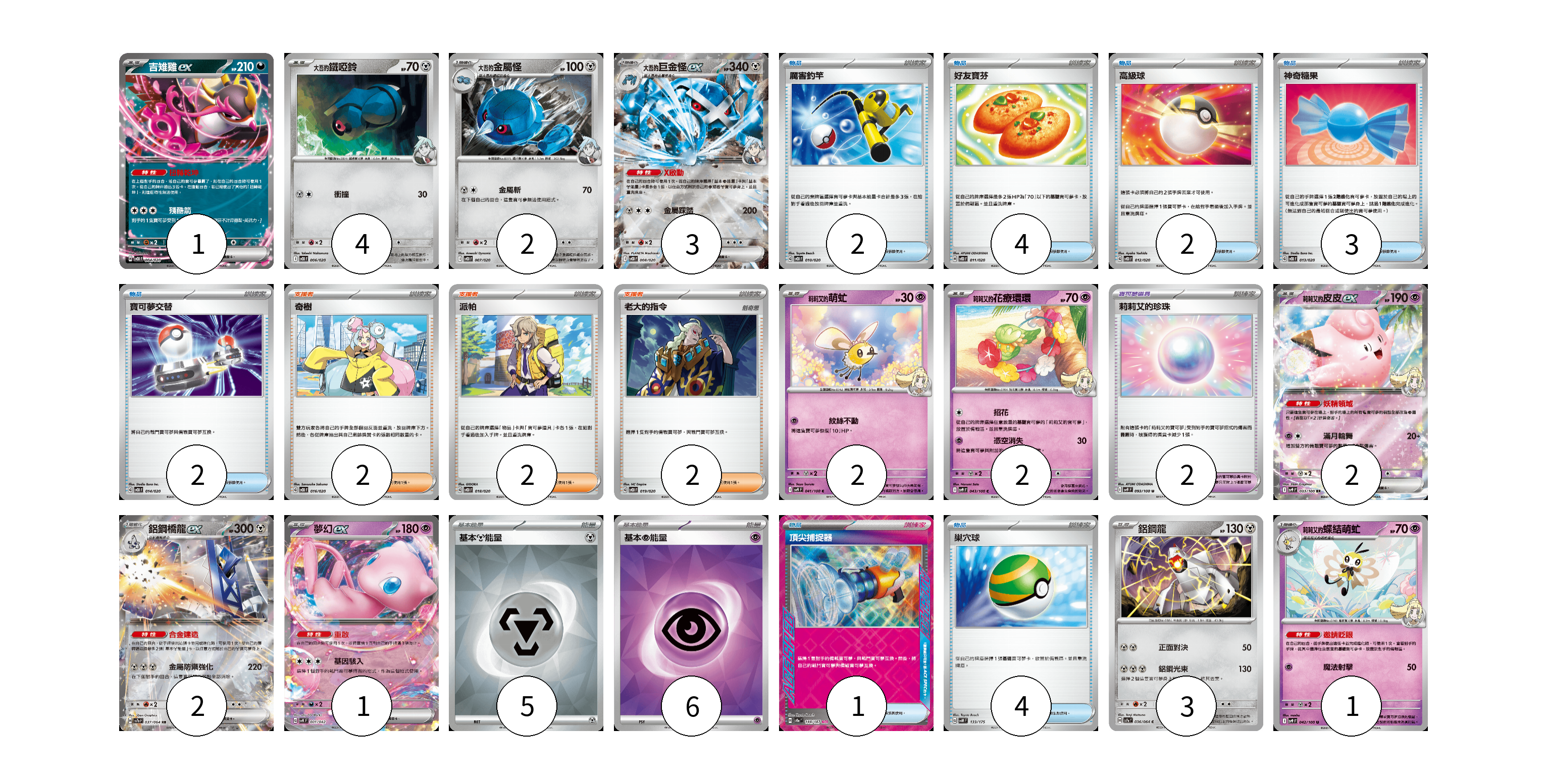 牌組構築方案 以此牌組為基礎新構築牌組 顯示卡面 顯示列表 寶可夢卡(23) 1 4 2 3 2 2 2 2 1 3 1 寶可夢道具(2) 2 物品卡(18) 2 4 2 3 2 1 4 支援者卡(6) 2 2 2 能量卡(11) 5 6 寶可夢卡(23) 卡牌名稱 張數 卡牌名稱 張數 吉雉雞ex SVOD 004/020 01 <大吾的>鐵啞鈴 SVOD 006/020 04 <大吾的>金屬怪 SVOD 007/020 02 <大吾的>巨金怪ex SVOD 008/020 03 莉莉艾的萌虻 SV9 041/100 02 莉莉艾的花療環環 SV9 043/100 02 莉莉艾的皮皮ex SV9 033/100 02 鋁鋼橋龍ex SV7a 037/064 02 夢幻ex SVK 001/042 01 鋁鋼龍 SV7a 036/064 03 莉莉艾的蝶結萌虻 SV9 042/100 01 寶可夢道具(2) 卡牌名稱 張數 卡牌名稱 張數 莉莉艾的珍珠 SV9 093/100 02 物品卡(18) 卡牌名稱 張數 卡牌名稱 張數 厲害釣竿 SVOD 010/020 02 好友寶芬 SVOD 011/020 04 高級球 SVOD 012/020 02 神奇糖果 SVOD 013/020 03 寶可夢交替 SVOD 014/020 02 頂尖捕捉器 SV8a 148/187 01 巢穴球 SVM 133/175 04 支援者卡(6) 卡牌名稱 張數 卡牌名稱 張數 奇樹 SVOD 016/020 02 派帕 SVOD 018/020 02 老大的指令 SVOD 019/020 02 能量卡(11) 卡牌名稱 張數 卡牌名稱 張數 基本【鋼】能量 SVOD MET 05 基本【超】能量 SVOD PSY 06 以此牌組為基礎新構築牌組 牌組編碼 aRmkVs-jsvoSv-XvZiNH copy 列印牌組單 牌組編碼已複製 分享至SNS
