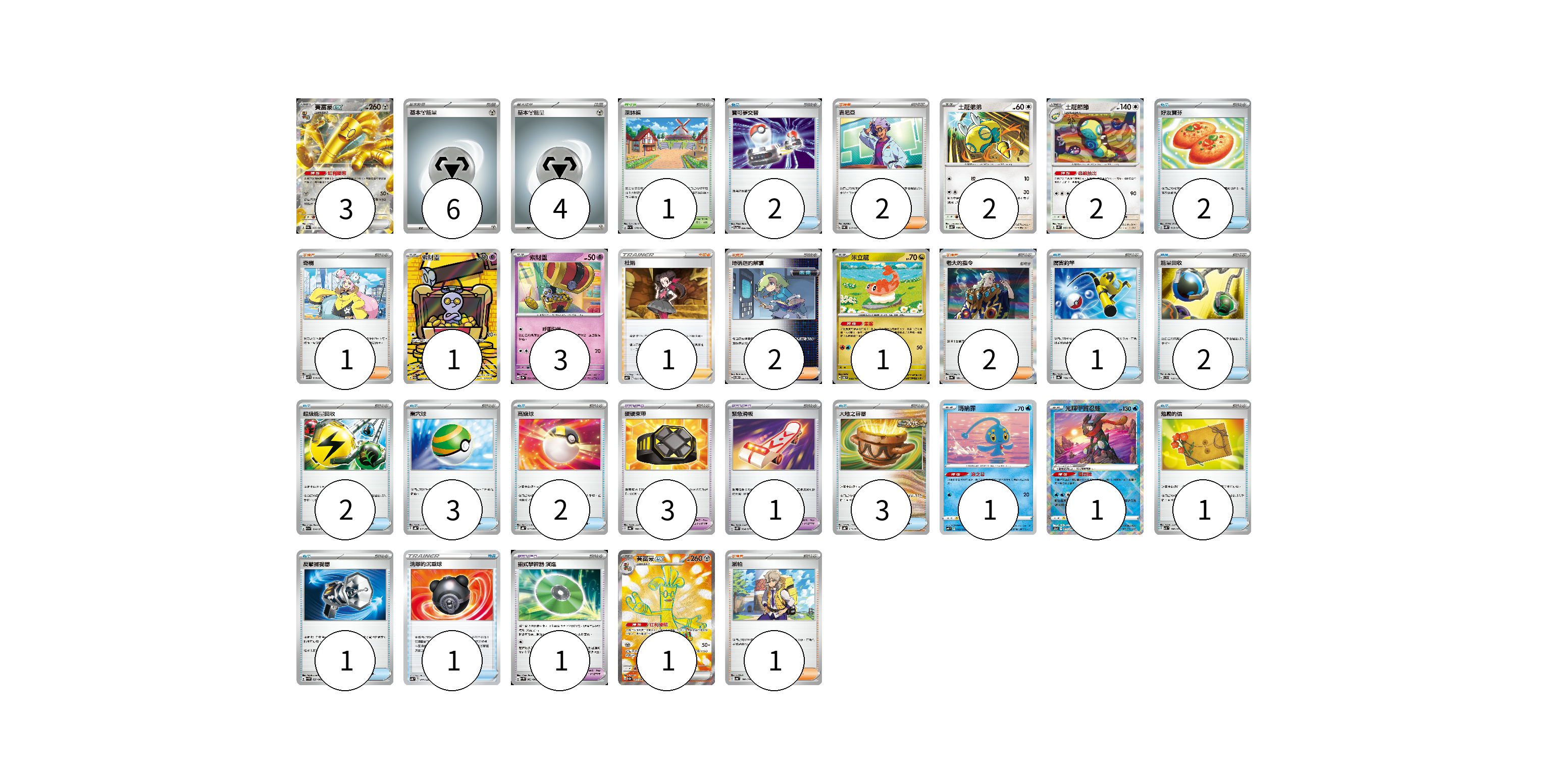 牌組構築方案 以此牌組為基礎新構築牌組 顯示卡面 顯示列表 寶可夢卡(15) 3 2 2 1 3 1 1 1 1 寶可夢道具(5) 3 1 1 物品卡(20) 2 2 1 2 2 3 2 3 1 1 1 支援者卡(9) 2 1 1 2 2 1 競技場卡(1) 1 能量卡(10) 6 4 寶可夢卡(15) 卡牌名稱 張數 卡牌名稱 張數 賽富豪ex SV3a 050/062 03 土龍弟弟 SV5K 056/071 02 土龍節節 SV5K 057/071 02 索財靈 SV3a 068/062 01 索財靈 SV3a 020/062 03 米立龍 SV6 082/101 01 瑪納霏 SVF 003/038 01 光輝甲賀忍蛙 S12a 033/172 01 賽富豪ex SV3a 079/062 01 寶可夢道具(5) 卡牌名稱 張數 卡牌名稱 張數 硬硬束帶 SV4a 166/190 03 緊急滑板 SV5K 064/071 01 招式學習器 演進 SV4M 063/066 01 物品卡(20) 卡牌名稱 張數 卡牌名稱 張數 寶可夢交替 SV5a 056/066 02 好友寶芬 SV5K 063/071 02 厲害釣竿 SV4a 158/190 01 能量回收 SVD 110/139 02 超級能量回收 SV1a 064/073 02 巢穴球 SVHK 012/022 03 高級球 SVHK 013/022 02 大地之容器 SVHK 011/022 03 勉勵的信 SV3 100/108 01 反擊捕捉器 SV4M 059/066 01 洗翠的沉重球 SVB 014/028 01 支援者卡(9) 卡牌名稱 張數 卡牌名稱 張數 吉尼亞 SVAL 017/021 02 奇樹 SVHM 018/022 01 杜娟 SVB 021/028 01 暗碼迷的解讀 SV5M 067/071 02 老大的指令 SV4a 181/190 02 派帕 SV4a 180/190 01 競技場卡(1) 卡牌名稱 張數 卡牌名稱 張數 深缽鎮 SV1a 070/073 01 能量卡(10) 卡牌名稱 張數 卡牌名稱 張數 基本【鋼】能量 SVB MET 06 基本鋼能量 sv-p MET 04 以此牌組為基礎新構築牌組 牌組編碼 aUfUqz-DKRuRQ-EXiGHp copy 列印牌組單 牌組編碼已複製 分享至SNS