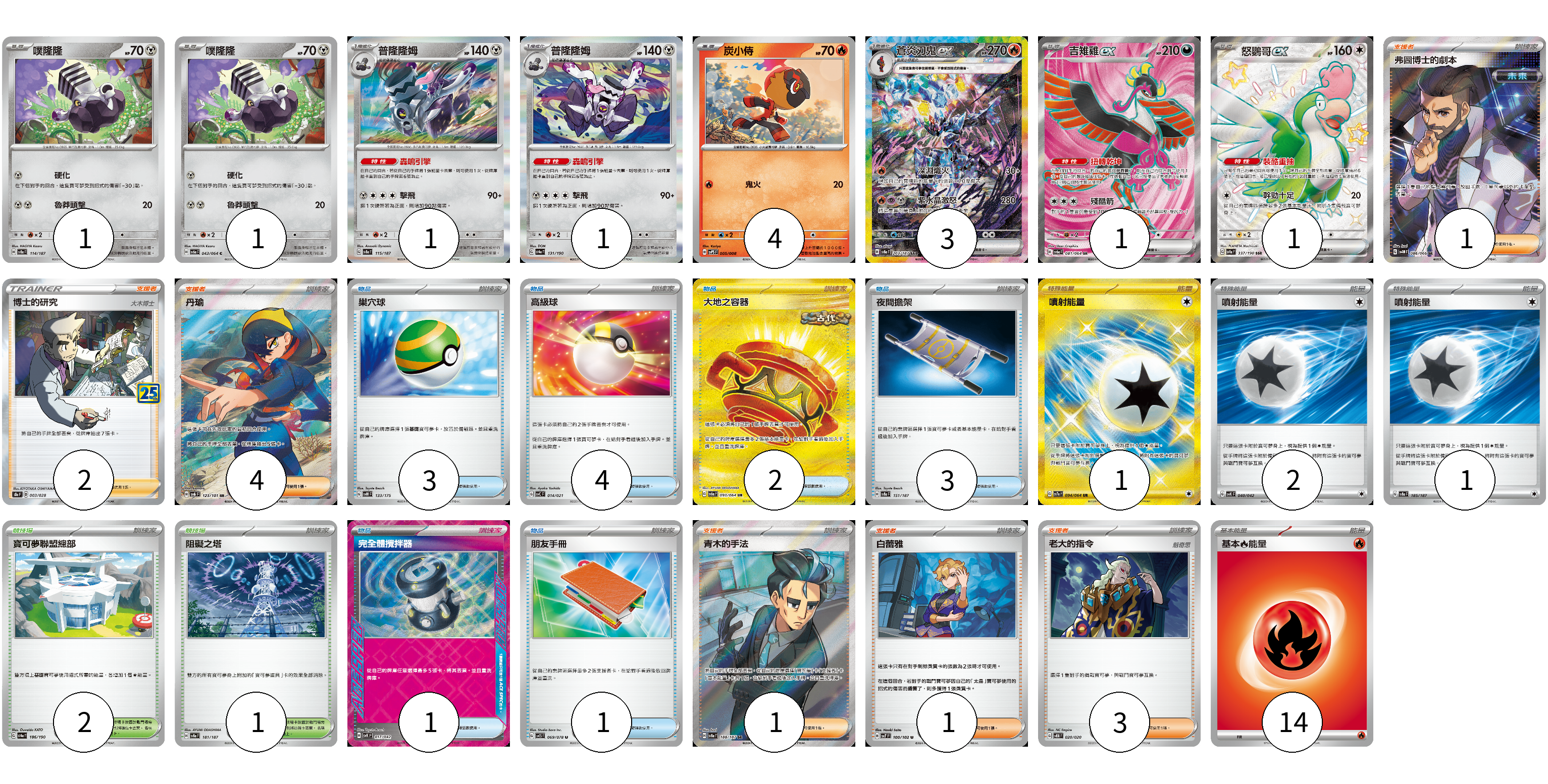 牌組構築方案 以此牌組為基礎新構築牌組 顯示卡面 顯示列表 寶可夢卡(13) 1 1 1 1 4 3 1 1 物品卡(14) 3 4 2 3 1 1 支援者卡(12) 1 2 4 1 1 3 競技場卡(3) 2 1 能量卡(18) 1 2 1 14 寶可夢卡(13) 卡牌名稱 張數 卡牌名稱 張數 噗隆隆 SV8a 114/187 01 噗隆隆 SV6a 043/064 01 普隆隆姆 SV8a 115/187 01 普隆隆姆 SV4a 131/190 01 炭小侍 SVPS 005/008 04 蒼炎刃鬼ex SV8a 203/187 03 吉雉雞ex SV6a 081/064 01 怒鸚哥ex SV4a 337/190 01 物品卡(14) 卡牌名稱 張數 卡牌名稱 張數 巢穴球 SVM 133/175 03 高級球 SVC 014/021 04 大地之容器 SV6a 093/064 02 夜間擔架 SV8a 151/187 03 完全體攪拌器 SVK 017/042 01 朋友手冊 SV1S 069/078 01 支援者卡(12) 卡牌名稱 張數 卡牌名稱 張數 弗圖博士的劇本 SV4M 086/066 01 博士的研究(大木博士) S8a 003/028 02 丹瑜 SV6 123/101 04 青木的手法 SV8a 188/187 01 白蕾雅 SV7 100/102 01 老大的指令 SVEM 020/020 03 競技場卡(3) 卡牌名稱 張數 卡牌名稱 張數 寶可夢聯盟總部 SV4a 186/190 02 阻礙之塔 SV8a 181/187 01 能量卡(18) 卡牌名稱 張數 卡牌名稱 張數 噴射能量 SV7a 094/064 01 噴射能量 SVK 040/042 02 噴射能量 SV8a 185/187 01 基本火能量 sv-p FIR 14 以此牌組為基礎新構築牌組 牌組編碼 aUxZgZ-TmZgvh-TxIbHE copy 列印牌組單 牌組編碼已複製 分享至SNS