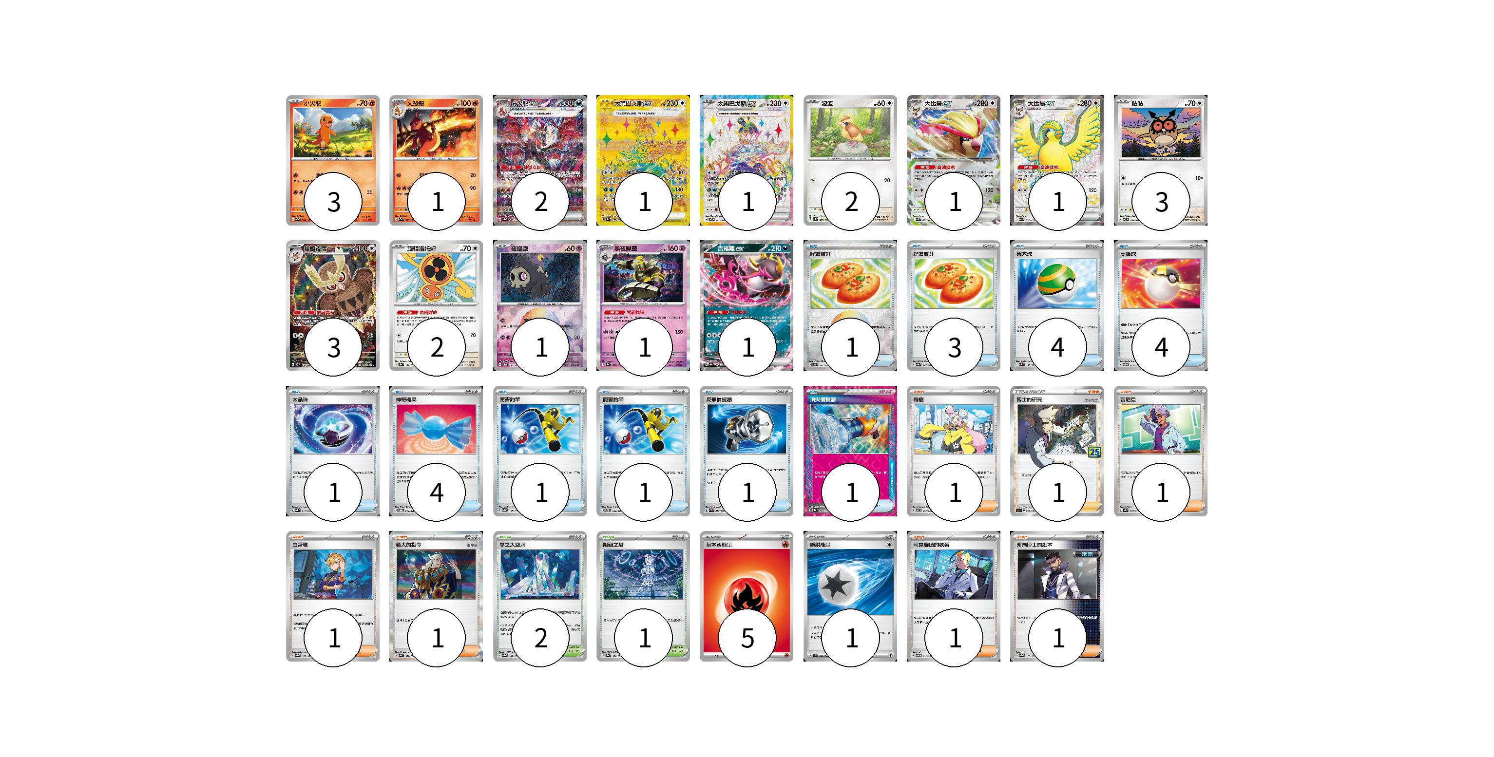 牌組構築方案 以此牌組為基礎新構築牌組 顯示卡面 顯示列表 寶可夢卡(23) 3 1 2 1 1 2 1 1 3 3 2 1 1 1 物品卡(21) 1 3 4 4 1 4 1 1 1 1 支援者卡(7) 1 1 1 1 1 1 1 競技場卡(3) 2 1 能量卡(6) 5 1 寶可夢卡(23) 卡牌名稱 張數 卡牌名稱 張數 小火龍 SV2a 004/165 03 火恐龍 SV2a 005/165 01 噴火龍ex SV4a 349/190 02 太樂巴戈斯ex SV8a 237/187 01 太樂巴戈斯ex SV7 122/102 01 波波 SV3 087/108 02 大比鳥ex SV3 089/108 01 大比鳥ex SV4a 335/190 01 咕咕 SV7 076/102 03 貓頭夜鷹 SV7 114/102 03 旋轉洛托姆 SV8a 131/187 02 夜巡靈 SV8a 064/187 01 黑夜魔靈 SV8a 066/187 01 吉雉雞ex SV8a 104/187 01 物品卡(21) 卡牌名稱 張數 卡牌名稱 張數 好友寶芬 SV8a 147/187 01 好友寶芬 SV8a 147/187 03 巢穴球 SVM 133/175 04 高級球 SVOD 012/020 04 太晶珠 SVK 013/042 01 神奇糖果 SVOD 013/020 04 厲害釣竿 SV4a 158/190 01 厲害釣竿 SVTG 009/019 01 反擊捕捉器 SV4M 059/066 01 頂尖捕捉器 SV8a 148/187 01 支援者卡(7) 卡牌名稱 張數 卡牌名稱 張數 奇樹 SVTR 017/021 01 博士的研究(大木博士) S8a 003/028 01 吉尼亞 SV1S 074/078 01 白蕾雅 SV8a 176/187 01 老大的指令 SV4a 181/190 01 阿克羅瑪的執著 SVOM 017/021 01 弗圖博士的劇本 SV8a 175/187 01 競技場卡(3) 卡牌名稱 張數 卡牌名稱 張數 零之大空洞 SV8a 182/187 02 阻礙之塔 SV8a 181/187 01 能量卡(6) 卡牌名稱 張數 卡牌名稱 張數 基本【火】能量 SVTL FIR 05 噴射能量 SVK 040/042 01 以此牌組為基礎新構築牌組 牌組編碼 aXSJqQ-fLfyGo-feBFzT copy 列印牌組單 牌組編碼已複製 分享至SNS