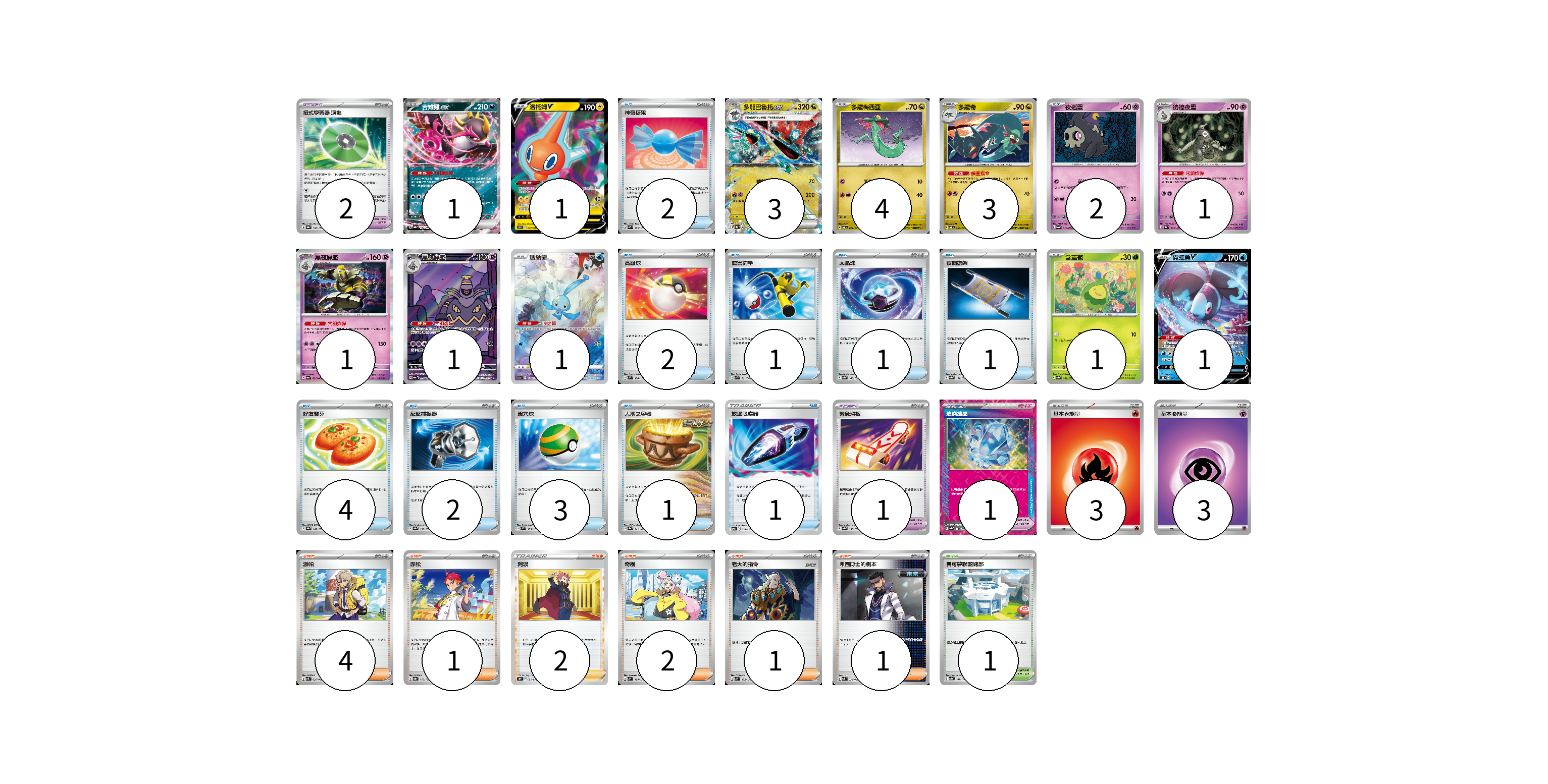 牌組構築方案 以此牌組為基礎新構築牌組 顯示卡面 顯示列表 寶可夢卡(20) 1 1 3 4 3 2 1 1 1 1 1 1 寶可夢道具(4) 2 1 1 物品卡(18) 2 2 1 1 1 4 2 3 1 1 支援者卡(11) 4 1 2 2 1 1 競技場卡(1) 1 能量卡(6) 3 3 寶可夢卡(20) 卡牌名稱 張數 卡牌名稱 張數 吉雉雞ex SV8a 104/187 01 洛托姆V S11 037/100 01 多龍巴魯托ex SV8a 120/187 03 多龍梅西亞 SV6 079/101 04 多龍奇 SV6 080/101 03 夜巡靈 SV6a 018/064 02 彷徨夜靈 SV8a 065/187 01 黑夜魔靈 SV6a 020/064 01 黑夜魔靈 SV6a 070/064 01 瑪納霏 S12a 178/172 01 含羞苞 SV8a 001/187 01 霓虹魚V SVHM 001/022 01 寶可夢道具(4) 卡牌名稱 張數 卡牌名稱 張數 招式學習器 演進 SV8a 160/187 02 緊急滑板 SV8a 153/187 01 璀璨結晶 SV8a 152/187 01 物品卡(18) 卡牌名稱 張數 卡牌名稱 張數 神奇糖果 SVM 135/175 02 高級球 SVM 134/175 02 厲害釣竿 SVK 011/042 01 太晶珠 SV8a 145/187 01 夜間擔架 SV8a 151/187 01 好友寶芬 SV8a 147/187 04 反擊捕捉器 SV8a 139/187 02 巢穴球 SVM 133/175 03 大地之容器 SV8a 143/187 01 放逐吸塵器 SVB 016/028 01 支援者卡(11) 卡牌名稱 張數 卡牌名稱 張數 派帕 SVK 035/042 04 赤松 SV8a 163/187 01 阿渡 S12 096/098 02 奇樹 SVM 160/175 02 老大的指令 SVM 172/175 01 弗圖博士的劇本 SVK 034/042 01 競技場卡(1) 卡牌名稱 張數 卡牌名稱 張數 寶可夢聯盟總部 SV4a 186/190 01 能量卡(6) 卡牌名稱 張數 卡牌名稱 張數 基本火能量 sv-p FIR 03 基本超能量 sv-p PSY 03 以此牌組為基礎新構築牌組 牌組編碼 aYDBHq-OIcgqe-qBwVRi copy 列印牌組單 牌組編碼已複製 分享至SNS