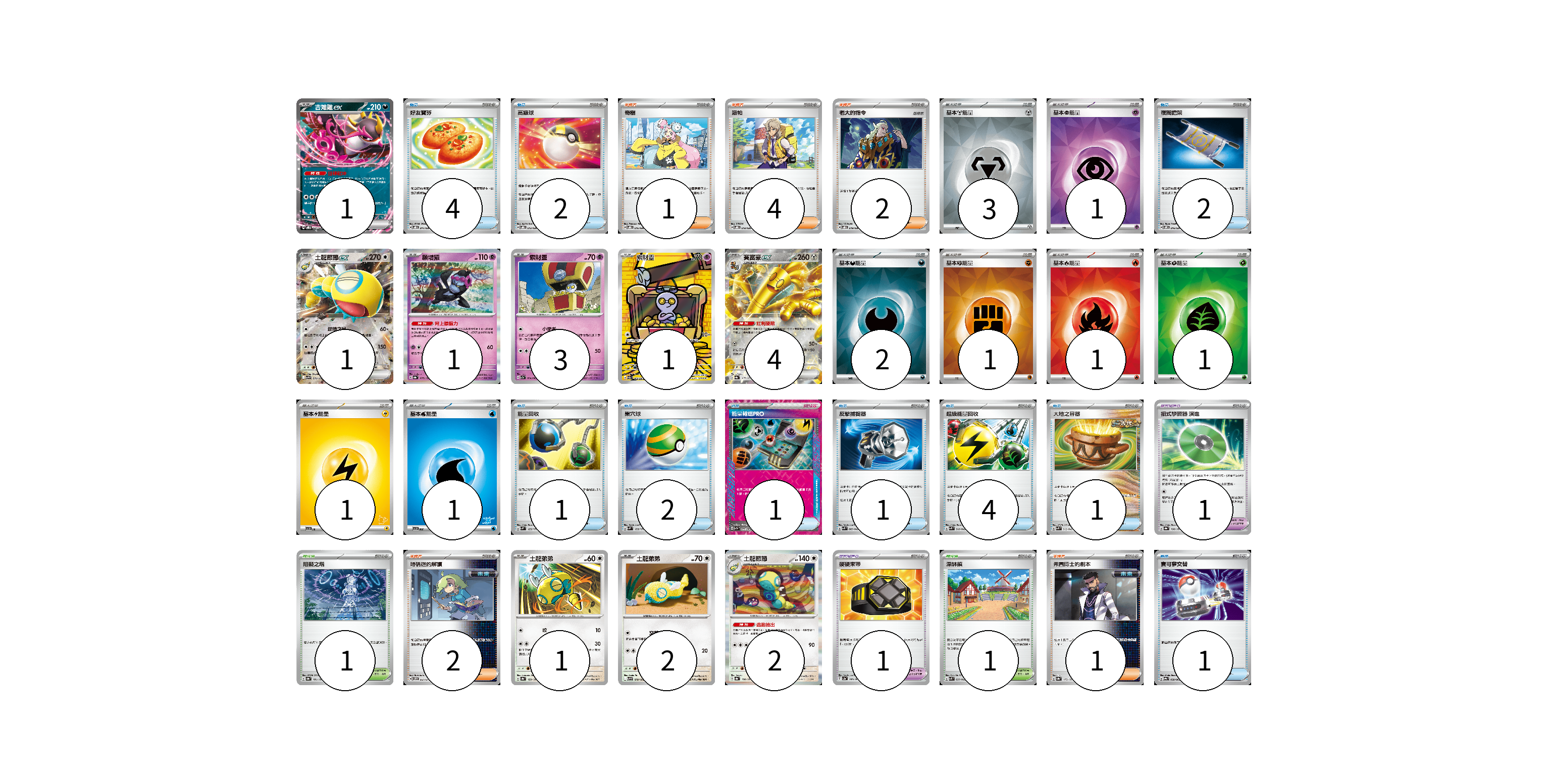 牌組構築方案 以此牌組為基礎新構築牌組 顯示卡面 顯示列表 寶可夢卡(16) 1 1 1 3 1 4 1 2 2 寶可夢道具(2) 1 1 物品卡(19) 4 2 2 1 2 1 1 4 1 1 支援者卡(10) 1 4 2 2 1 競技場卡(2) 1 1 能量卡(11) 3 1 2 1 1 1 1 1 寶可夢卡(16) 卡牌名稱 張數 卡牌名稱 張數 吉雉雞ex SVOD 004/020 01 土龍節節ex SV9 079/100 01 願增猿 SV8a 075/187 01 索財靈 SV7a 024/064 03 索財靈 SV3a 068/062 01 賽富豪ex SV8a 117/187 04 土龍弟弟 SV8a 129/187 01 土龍弟弟 SV9 078/100 02 土龍節節 SV8a 130/187 02 寶可夢道具(2) 卡牌名稱 張數 卡牌名稱 張數 招式學習器 演進 SV8a 160/187 01 硬硬束帶 SV2a 159/165 01 物品卡(19) 卡牌名稱 張數 卡牌名稱 張數 好友寶芬 SVOD 011/020 04 高級球 SVOD 012/020 02 夜間擔架 SVOM 016/021 02 能量回收 SVM 125/175 01 巢穴球 SVM 133/175 02 能量輸送PRO SV7a 052/064 01 反擊捕捉器 SVK 009/042 01 超級能量回收 SVK 010/042 04 大地之容器 SVK 012/042 01 寶可夢交替 SV9a 058/063 01 支援者卡(10) 卡牌名稱 張數 卡牌名稱 張數 奇樹 SVOD 016/020 01 派帕 SVOD 018/020 04 老大的指令 SVOD 019/020 02 暗碼迷的解讀 SV5M 067/071 02 弗圖博士的劇本 SV8a 175/187 01 競技場卡(2) 卡牌名稱 張數 卡牌名稱 張數 阻礙之塔 SV8a 181/187 01 深缽鎮 SVK 039/042 01 能量卡(11) 卡牌名稱 張數 卡牌名稱 張數 基本【鋼】能量 SVOD MET 03 基本【超】能量 SVOD PSY 01 基本【惡】能量 SVOM DAR 02 基本【鬥】能量 SVK FIG 01 基本【火】能量 SVK FIR 01 基本【草】能量 SVK GRA 01 基本【雷】能量 SVI LIG 01 基本【水】能量 SVI WAT 01 以此牌組為基礎新構築牌組 牌組編碼 aajwSV-MFzolh-HcxaNt copy 列印牌組單 牌組編碼已複製 分享至SNS