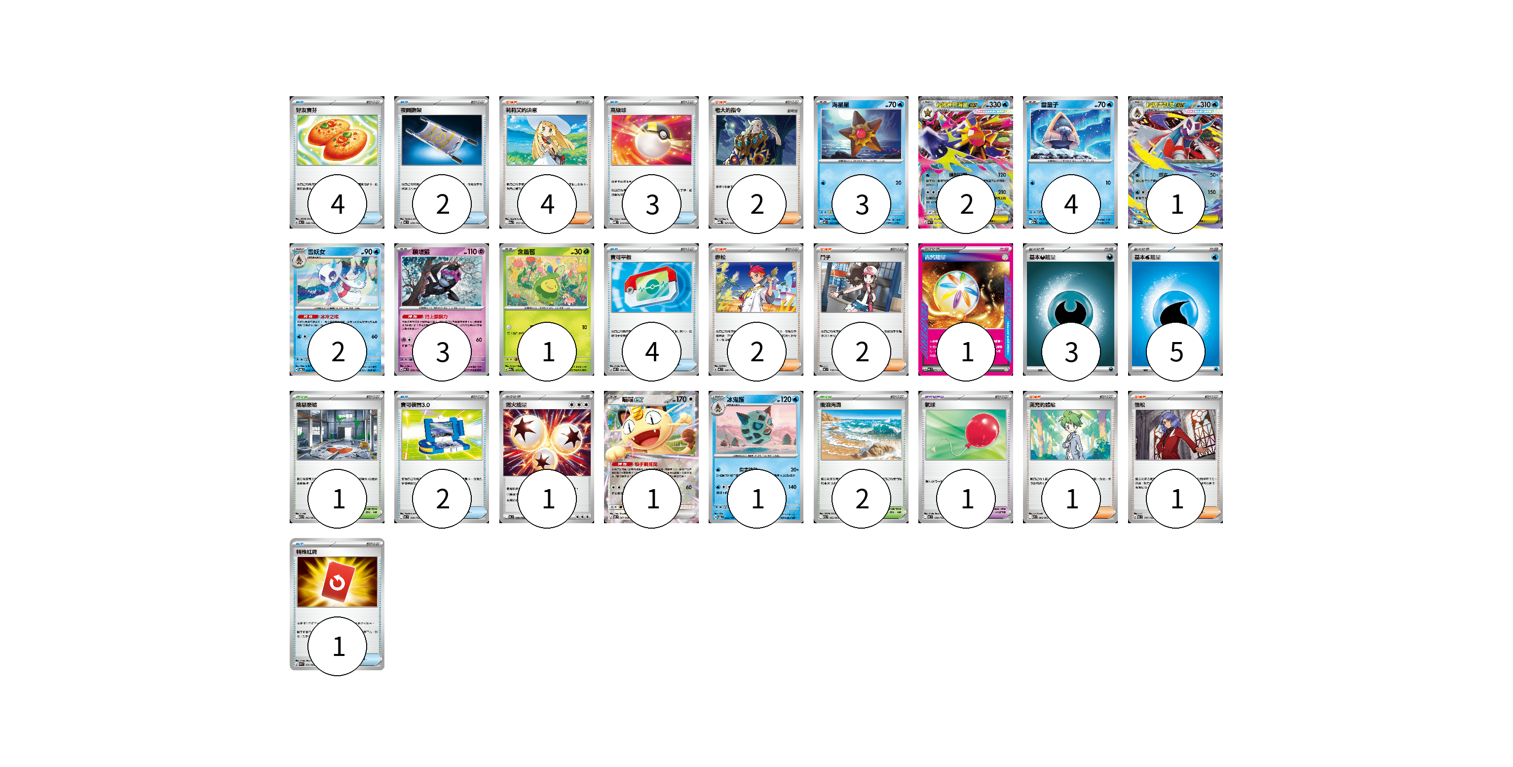 牌組構築方案 以此牌組為基礎新構築牌組 顯示卡面 顯示列表 寶可夢卡(18) 3 2 4 1 2 3 1 1 1 寶可夢道具(1) 1 物品卡(16) 4 2 3 4 2 1 支援者卡(12) 4 2 2 2 1 1 競技場卡(3) 1 2 能量卡(10) 1 3 5 1 寶可夢卡(18) 卡牌名稱 張數 卡牌名稱 張數 海星星 M3 020/080 03 超級寶石海星ex M3 021/080 02 雪童子 M2a 035/193 04 超級雪妖女ex M2a 036/193 01 雪妖女 SV6 033/101 02 願增猿 MC 358/742 03 含羞苞 M2a 011/193 01 喵喵ex M3 061/080 01 冰鬼護 SV6 032/101 01 寶可夢道具(1) 卡牌名稱 張數 卡牌名稱 張數 氣球 MC 688/742 01 物品卡(16) 卡牌名稱 張數 卡牌名稱 張數 好友寶芬 MC 648/742 04 夜間擔架 MC 670/742 02 高級球 MBD 014/022 03 寶可平板 M3 070/080 04 寶可裝置3.0 MC 660/742 02 特殊紅牌 M4 072/083 01 支援者卡(12) 卡牌名稱 張數 卡牌名稱 張數 莉莉艾的決意 M2a 175/193 04 老大的指令 MBG 021/022 02 赤松 MC 696/742 02 鬥子 MC 718/742 02 滿充的體貼 M1S 060/063 01 悟松 MC 707/742 01 競技場卡(3) 卡牌名稱 張數 卡牌名稱 張數 險惡廢墟 M1L 063/063 01 衝浪海灘 M1S 062/063 02 能量卡(10) 卡牌名稱 張數 卡牌名稱 張數 古舊能量 MC 741/742 01 基本【惡】能量 MC DAR 03 基本【水】能量 MC WAT 05 燃火能量 MC 736/742 01 以此牌組為基礎新構築牌組 牌組編碼 abnLuS-AYdmPg-NfZGOL copy 列印牌組單 牌組編碼已複製 分享至SNS