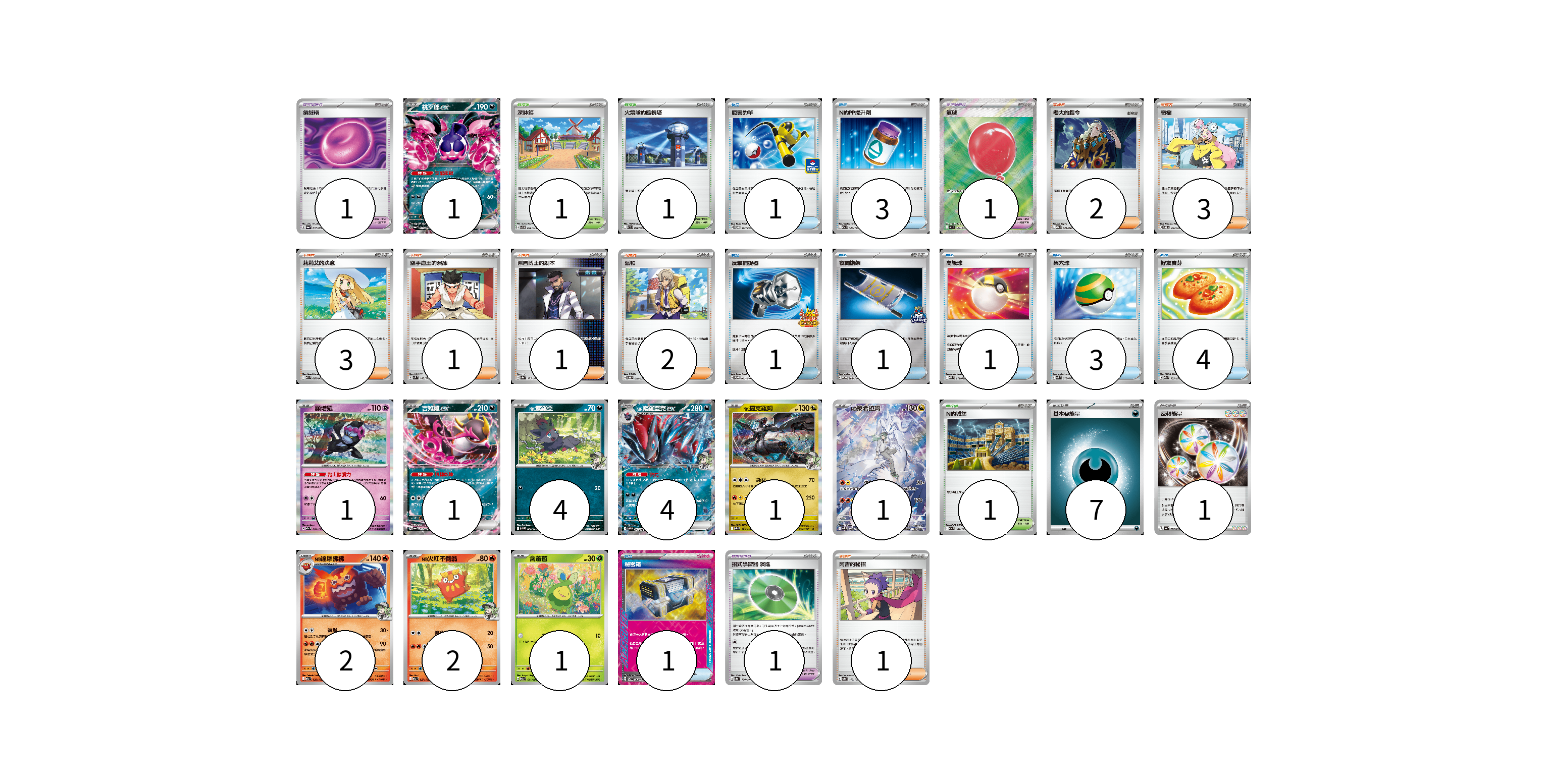牌組構築方案 以此牌組為基礎新構築牌組 顯示卡面 顯示列表 寶可夢卡(18) 1 1 1 4 4 1 1 2 2 1 寶可夢道具(3) 1 1 1 物品卡(15) 1 3 1 1 1 3 4 1 支援者卡(13) 2 3 3 1 1 2 1 競技場卡(3) 1 1 1 能量卡(8) 7 1 寶可夢卡(18) 卡牌名稱 張數 卡牌名稱 張數 桃歹郎ex SV6a 039/064 01 願增猿 M2a 081/193 01 吉雉雞ex SV6a 038/064 01 N的索羅亞 SV9 060/100 04 N的索羅亞克ex SV9 061/100 04 N的捷克羅姆 M2a 129/193 01 N的萊希拉姆 SV9 109/100 01 N的達摩狒狒 M2a 028/193 02 N的火紅不倒翁 M2a 027/193 02 含羞苞 M2a 011/193 01 寶可夢道具(3) 卡牌名稱 張數 卡牌名稱 張數 鎖鏈糬 SV6a 057/064 01 氣球 M1L 084/063 01 招式學習器 演進 SV8a 160/187 01 物品卡(15) 卡牌名稱 張數 卡牌名稱 張數 厲害釣竿 SV-P 112/SV-P 01 N的PP提升劑 M2a 146/193 03 反擊捕捉器 SV-P 083/SV-P 01 夜間擔架 SV-P 204/SV-P 01 高級球 MBD 014/022 01 巢穴球 SVK 016/042 03 好友寶芬 M2a 153/193 04 秘密箱 SV6 092/101 01 支援者卡(13) 卡牌名稱 張數 卡牌名稱 張數 老大的指令 MBG 021/022 02 奇樹 SVOD 016/020 03 莉莉艾的決意 M1L 062/063 03 空手道王的演練 SVM 143/175 01 弗圖博士的劇本 SV8a 175/187 01 派帕 SVOD 018/020 02 阿杏的秘招 SV8a 166/187 01 競技場卡(3) 卡牌名稱 張數 卡牌名稱 張數 深缽鎮 SVF 036/038 01 火箭隊的監視塔 SV10 096/098 01 N的城堡 M2a 181/193 01 能量卡(8) 卡牌名稱 張數 卡牌名稱 張數 基本【惡】能量 MBG DAR 07 反轉能量 SV4a 189/190 01 以此牌組為基礎新構築牌組 牌組編碼 acaXoe-sXWgzQ-tuhDRh copy 列印牌組單 牌組編碼已複製 分享至SNS