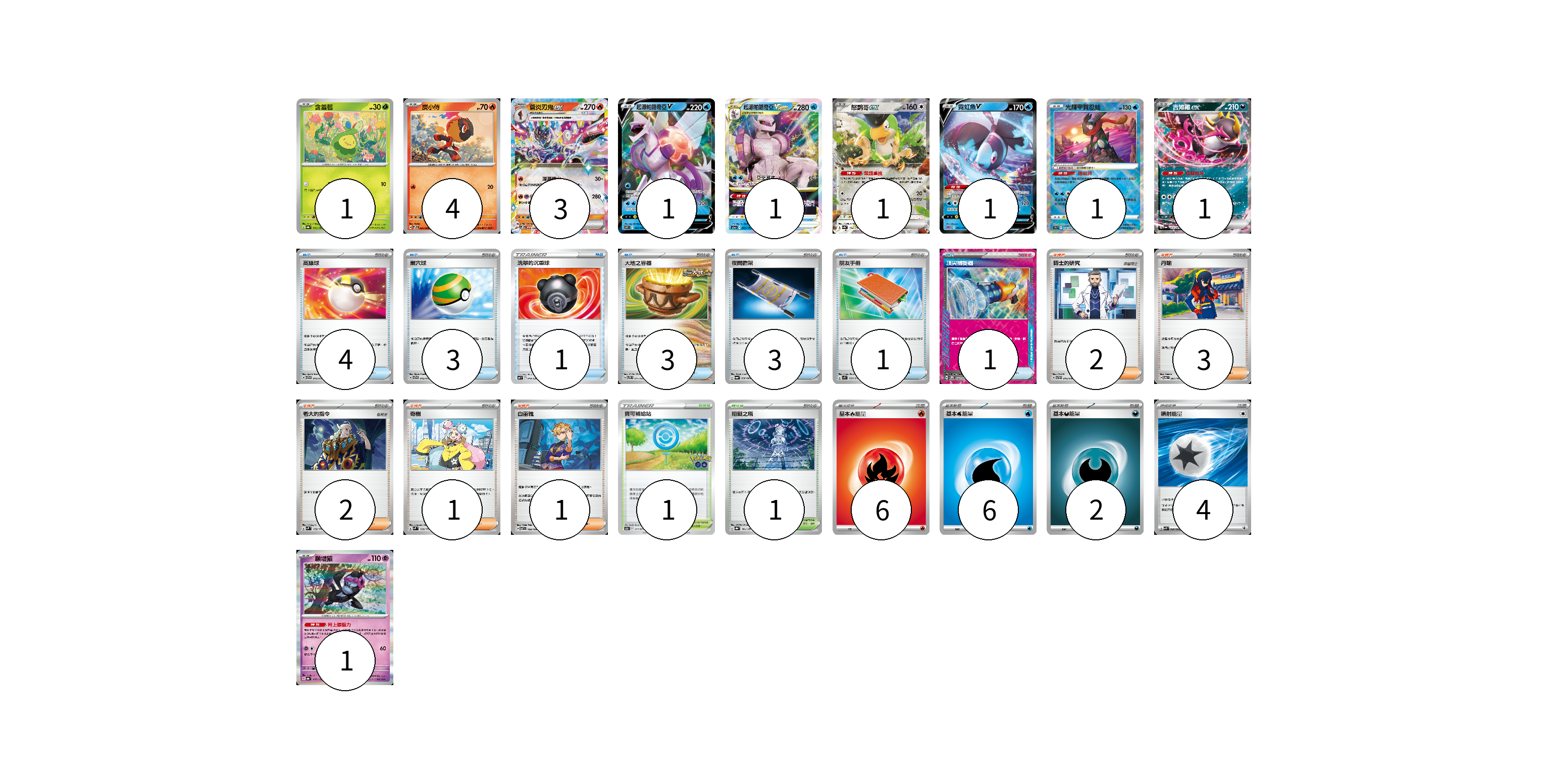 牌組構築方案 以此牌組為基礎新構築牌組 顯示卡面 顯示列表 寶可夢卡(15) 1 4 3 1 1 1 1 1 1 1 物品卡(16) 4 3 1 3 3 1 1 支援者卡(9) 2 3 2 1 1 競技場卡(2) 1 1 能量卡(18) 6 6 2 4 寶可夢卡(15) 卡牌名稱 張數 卡牌名稱 張數 含羞苞 SV8a 001/187 01 炭小侍 SVPS 005/008 04 蒼炎刃鬼ex SVPS 006/008 03 起源帕路奇亞V S10P 022/067 01 起源帕路奇亞VSTAR S12a 028/172 01 怒鸚哥ex SV4a 154/190 01 霓虹魚V SPD 002/020 01 光輝甲賀忍蛙 S9a 026/067 01 吉雉雞ex SV6a 038/064 01 願增猿 SV8a 075/187 01 物品卡(16) 卡牌名稱 張數 卡牌名稱 張數 高級球 SVTG 013/019 04 巢穴球 SVTG 012/019 03 洗翠的沉重球 SVF 019/038 01 大地之容器 SVTS 011/022 03 夜間擔架 SV6a 056/064 03 朋友手冊 SV1S 069/078 01 頂尖捕捉器 SV5M 062/071 01 支援者卡(9) 卡牌名稱 張數 卡牌名稱 張數 博士的研究 SVTH 016/018 02 丹瑜 SV6 097/101 03 老大的指令 SVM 172/175 02 奇樹 SVM 160/175 01 白蕾雅 SV7 100/102 01 競技場卡(2) 卡牌名稱 張數 卡牌名稱 張數 寶可補給站 S10b 071/071 01 阻礙之塔 SV8a 181/187 01 能量卡(18) 卡牌名稱 張數 卡牌名稱 張數 基本【火】能量 SVTL FIR 06 基本【水】能量 SVF WAT 06 基本【惡】能量 SVD DAR 02 噴射能量 SVK 040/042 04 以此牌組為基礎新構築牌組 牌組編碼 aldyOW-CJZqId-NKOwuL copy 列印牌組單 牌組編碼已複製 分享至SNS