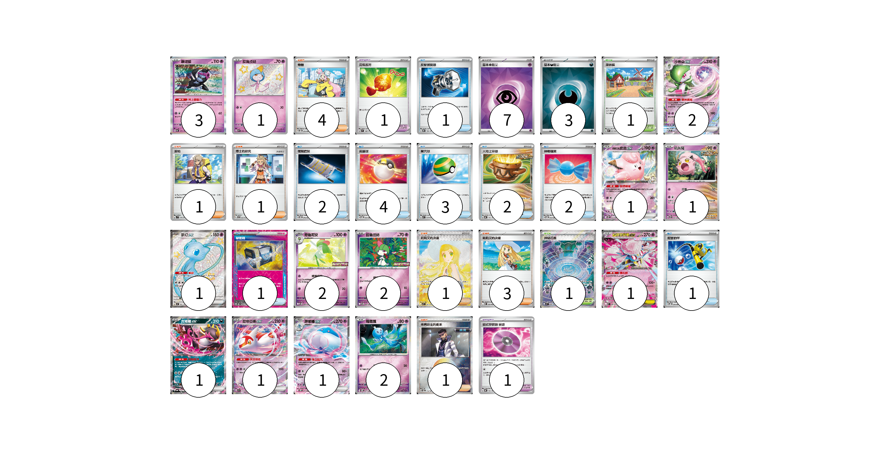 牌組構築方案 以此牌組為基礎新構築牌組 顯示卡面 顯示列表 寶可夢卡(19) 3 1 2 1 1 1 2 2 1 1 1 1 2 寶可夢道具(2) 1 1 物品卡(16) 1 2 4 3 2 2 1 1 支援者卡(11) 4 1 1 1 3 1 競技場卡(2) 1 1 能量卡(10) 7 3 寶可夢卡(19) 卡牌名稱 張數 卡牌名稱 張數 願增猿 SV8a 075/187 03 拉魯拉絲 SV4a 258/190 01 沙奈朵ex SVTS 004/022 02 莉莉艾的皮皮ex SV9 033/100 01 吼叫尾 SVTS 007/022 01 夢幻ex SV4a 327/190 01 奇魯莉安 M-P 006/M-P 02 拉魯拉絲 M-P 005/M-P 02 超級蒂安希ex MBD 006/022 01 吉雉雞ex SV8a 104/187 01 拉帝亞斯ex SV7a 019/064 01 胖嘟嘟ex SV11W 042/086 01 輕飄飄 SV11W 041/086 02 寶可夢道具(2) 卡牌名稱 張數 卡牌名稱 張數 勇氣護符 SVM 142/175 01 招式學習器 衰退 SV8a 161/187 01 物品卡(16) 卡牌名稱 張數 卡牌名稱 張數 反擊捕捉器 SV8a 139/187 01 夜間擔架 SVOM 016/021 02 高級球 SVOD 012/020 04 巢穴球 SVK 016/042 03 大地之容器 SV8a 143/187 02 神奇糖果 SVOD 013/020 02 秘密箱 SV6 092/101 01 厲害釣竿 SVOD 010/020 01 支援者卡(11) 卡牌名稱 張數 卡牌名稱 張數 奇樹 SVOD 016/020 04 派帕 SV1V 076/078 01 博士的研究 SVF 030/038 01 莉莉艾的決意 M1L 091/063 01 莉莉艾的決意 MBD 021/022 03 弗圖博士的劇本 SV8a 175/187 01 競技場卡(2) 卡牌名稱 張數 卡牌名稱 張數 深缽鎮 SVK 039/042 01 神秘花園 M1S 086/063 01 能量卡(10) 卡牌名稱 張數 卡牌名稱 張數 基本【超】能量 SVOD PSY 07 基本【惡】能量 SVOM DAR 03 以此牌組為基礎新構築牌組 牌組編碼 ambupH-lZEHqf-ldKaJO copy 列印牌組單 牌組編碼已複製 分享至SNS