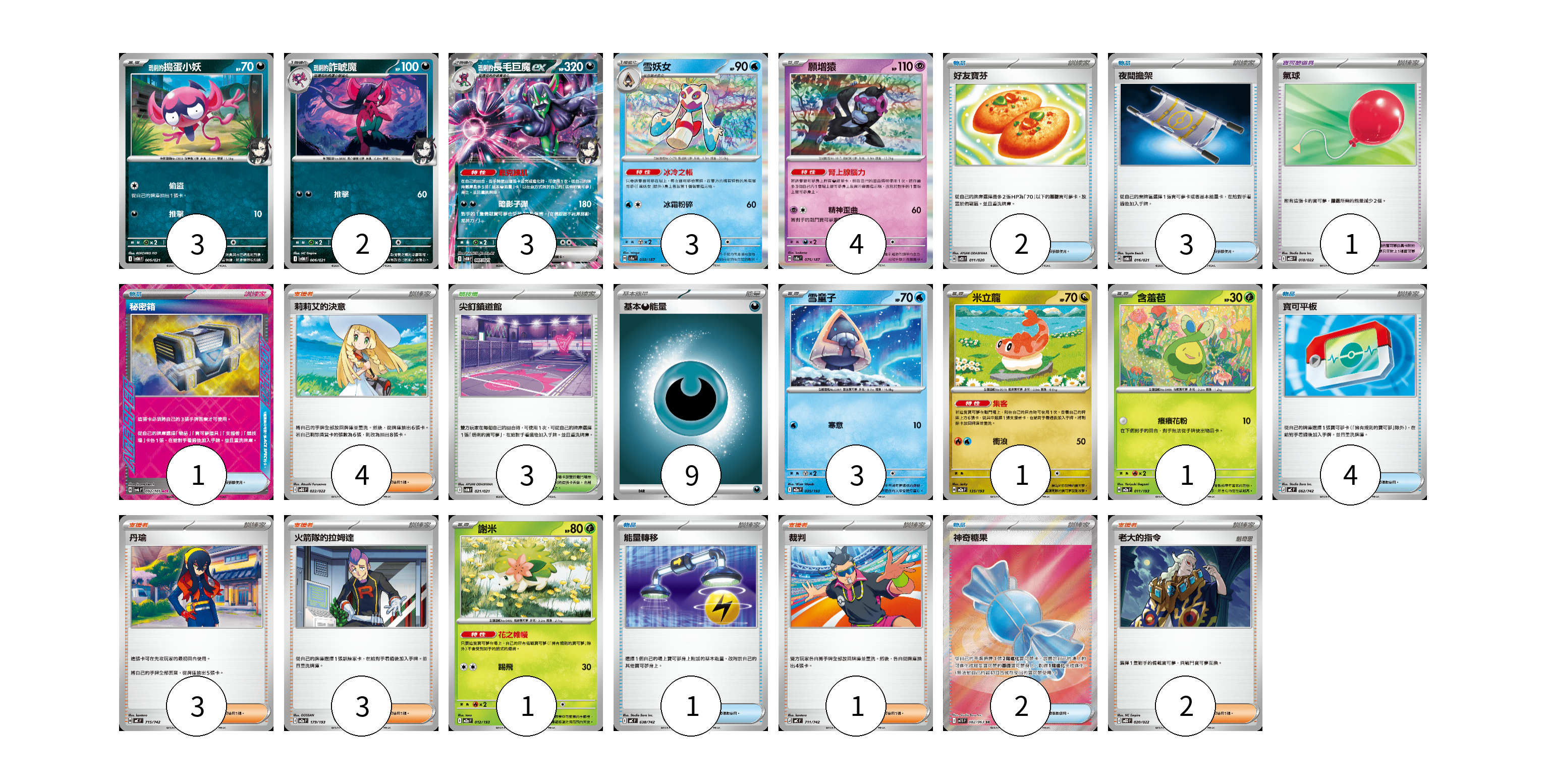 牌組構築方案 以此牌組為基礎新構築牌組 顯示卡面 顯示列表 寶可夢卡(21) 3 2 3 3 4 3 1 1 1 物品卡(14) 2 3 1 1 4 1 2 支援者卡(13) 4 3 3 1 2 競技場卡(3) 3 能量卡(9) 9 寶可夢卡(21) 卡牌名稱 張數 卡牌名稱 張數 <瑪俐的>搗蛋小妖 SVOM 005/021 03 <瑪俐的>詐唬魔 SVOM 006/021 02 <瑪俐的>長毛巨魔ex SVOM 007/021 03 雪妖女 SV8a 038/187 03 願增猿 SV8a 075/187 04 雪童子 M2a 035/193 03 米立龍 M2a 135/193 01 含羞苞 M2a 011/193 01 謝米 M2a 012/193 01 物品卡(14) 卡牌名稱 張數 卡牌名稱 張數 好友寶芬 SVOD 011/020 02 夜間擔架 SVOM 016/021 03 氣球 MBD 018/022 01 秘密箱 SV6 092/101 01 寶可平板 MC 662/742 04 能量轉移 MC 638/742 01 神奇糖果 M1S 082/063 02 支援者卡(13) 卡牌名稱 張數 卡牌名稱 張數 莉莉艾的決意 MBG 022/022 04 丹瑜 MC 715/742 03 火箭隊的拉姆達 M2a 179/193 03 裁判 MC 711/742 01 老大的指令 MBD 020/022 02 競技場卡(3) 卡牌名稱 張數 卡牌名稱 張數 尖釘鎮道館 SVOM 021/021 03 能量卡(9) 卡牌名稱 張數 卡牌名稱 張數 基本【惡】能量 M-P DAR 09 以此牌組為基礎新構築牌組 牌組編碼 ankcHg-JpSnkJ-MwYind copy 列印牌組單 牌組編碼已複製 分享至SNS
