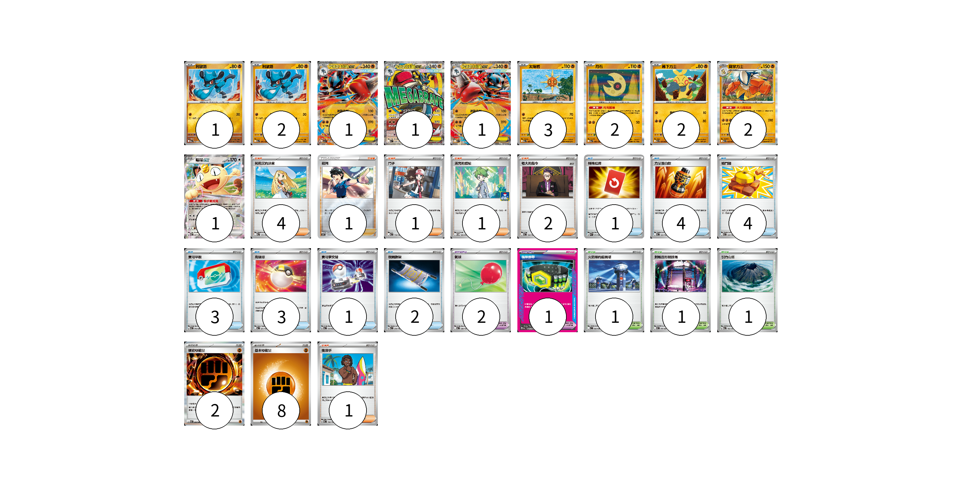牌組構築方案 以此牌組為基礎新構築牌組 顯示卡面 顯示列表 寶可夢卡(16) 1 2 1 1 1 3 2 2 2 1 寶可夢道具(3) 2 1 物品卡(18) 1 4 4 3 3 1 2 支援者卡(10) 4 1 1 1 2 1 競技場卡(3) 1 1 1 能量卡(10) 2 8 寶可夢卡(16) 卡牌名稱 張數 卡牌名稱 張數 利歐路 M2a 091/193 01 利歐路 M2a 091/193 02 超級路卡利歐ex M2a 092/193 01 超級路卡利歐ex M2a 228/193 01 超級路卡利歐ex M1L 029/063 01 太陽岩 M2a 087/193 03 月石 M2a 086/193 02 幕下力士 M1L 024/063 02 鐵掌力士 M1L 025/063 02 喵喵ex M3 061/080 01 寶可夢道具(3) 卡牌名稱 張數 卡牌名稱 張數 氣球 MC 688/742 02 極限腰帶 MC 691/742 01 物品卡(18) 卡牌名稱 張數 卡牌名稱 張數 特殊紅牌 M4 072/083 01 力量蛋白飲 MC 652/742 04 戰鬥鑼 MC 654/742 04 寶可平板 M3 070/080 03 高級球 MC 651/742 03 寶可夢交替 MJ 019/022 01 夜間擔架 MC 670/742 02 支援者卡(10) 卡牌名稱 張數 卡牌名稱 張數 莉莉艾的決意 M2a 175/193 04 裁判 SO 024/030 01 鬥子 MC 718/742 01 滿充的體貼 M-P 082/M-P 01 老大的指令 MC 724/742 02 衝浪手 MC 708/742 01 競技場卡(3) 卡牌名稱 張數 卡牌名稱 張數 火箭隊的監視塔 SV10 096/098 01 對戰圓形競技場 M2 079/080 01 引力山岳 M2a 183/193 01 能量卡(10) 卡牌名稱 張數 卡牌名稱 張數 硬岩【鬥】能量 M3 080/080 02 基本【鬥】能量 MC FIG 08 以此牌組為基礎新構築牌組 牌組編碼 aocEmE-PJFlpr-FblTFc copy 列印牌組單 牌組編碼已複製 分享至SNS