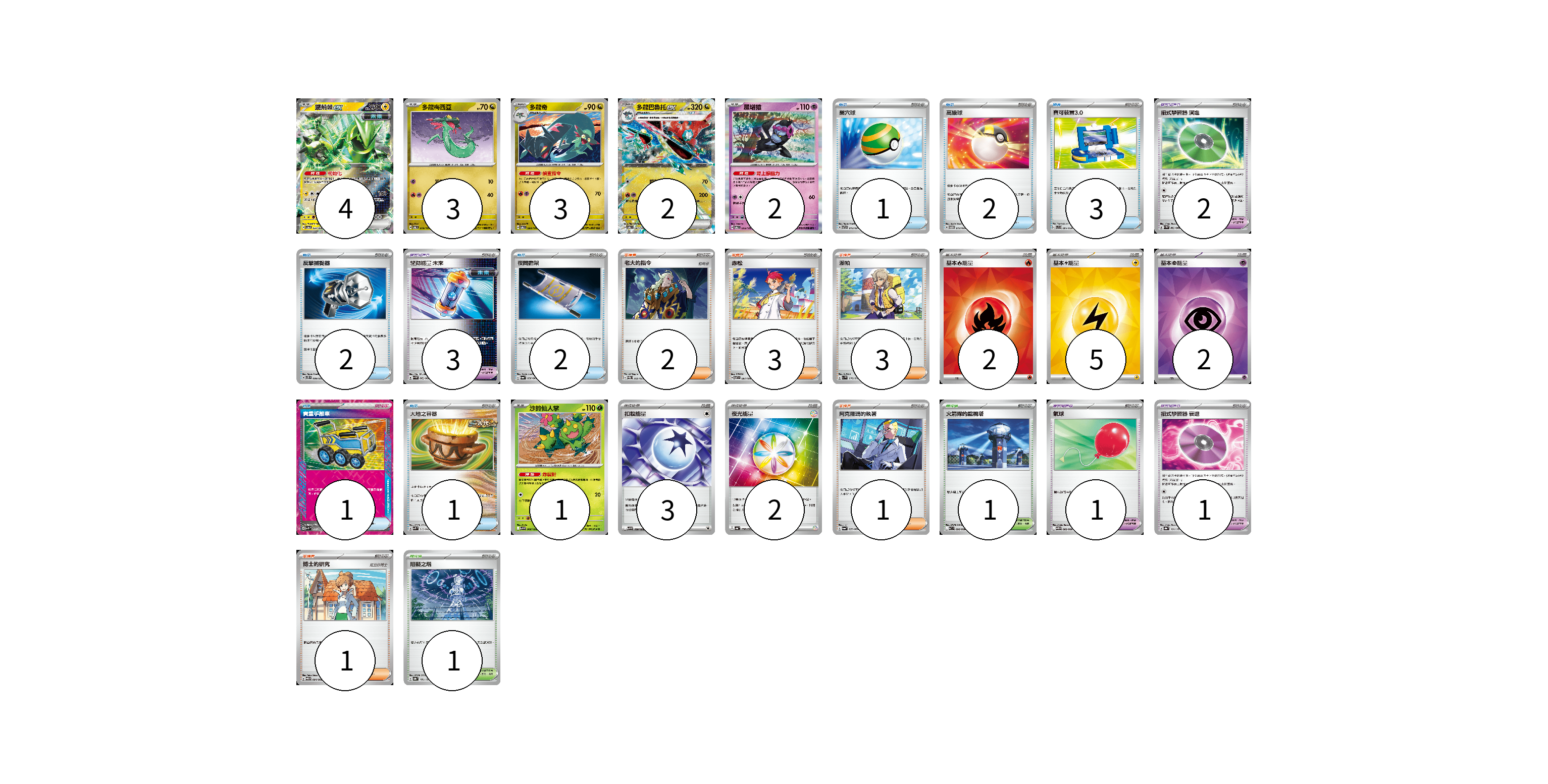 牌組構築方案 以此牌組為基礎新構築牌組 顯示卡面 顯示列表 寶可夢卡(15) 4 3 3 2 2 1 寶可夢道具(7) 2 3 1 1 物品卡(12) 1 2 3 2 2 1 1 支援者卡(10) 2 3 3 1 1 競技場卡(2) 1 1 能量卡(14) 2 5 2 3 2 寶可夢卡(15) 卡牌名稱 張數 卡牌名稱 張數 鐵荊棘ex SV5a 033/066 04 多龍梅西亞 SV6 079/101 03 多龍奇 SV6 080/101 03 多龍巴魯托ex SV6 081/101 02 願增猿 SV6 055/101 02 沙鈴仙人掌 SV9 006/100 01 寶可夢道具(7) 卡牌名稱 張數 卡牌名稱 張數 招式學習器 演進 SV4M 063/066 02 驅勁能量 未來 SV4M 062/066 03 氣球 SV11B 082/086 01 招式學習器 衰退 SV8a 161/187 01 物品卡(12) 卡牌名稱 張數 卡牌名稱 張數 巢穴球 SVTR 013/021 01 高級球 SVTM 012/022 02 寶可裝置3.0 SVB 004/028 03 反擊捕捉器 SVTS 009/022 02 夜間擔架 SV6a 056/064 02 貴重手推車 SVK 020/042 01 大地之容器 SVK 012/042 01 支援者卡(10) 卡牌名稱 張數 卡牌名稱 張數 老大的指令 SVEM 020/020 02 赤松 SV7 097/102 03 派帕 SV1V 076/078 03 阿克羅瑪的執著 SV6a 059/064 01 博士的研究 SV11B 084/086 01 競技場卡(2) 卡牌名稱 張數 卡牌名稱 張數 火箭隊的監視塔 SV10 096/098 01 阻礙之塔 SV8a 181/187 01 能量卡(14) 卡牌名稱 張數 卡牌名稱 張數 基本【火】能量 SVK FIR 02 基本【雷】能量 SVK LIG 05 基本【超】能量 SVK PSY 02 扣殺能量 SV9 100/100 03 夜光能量 SV4a 190/190 02 以此牌組為基礎新構築牌組 牌組編碼 apuNfb-BAraXj-NhNUJq copy 列印牌組單 牌組編碼已複製 分享至SNS
