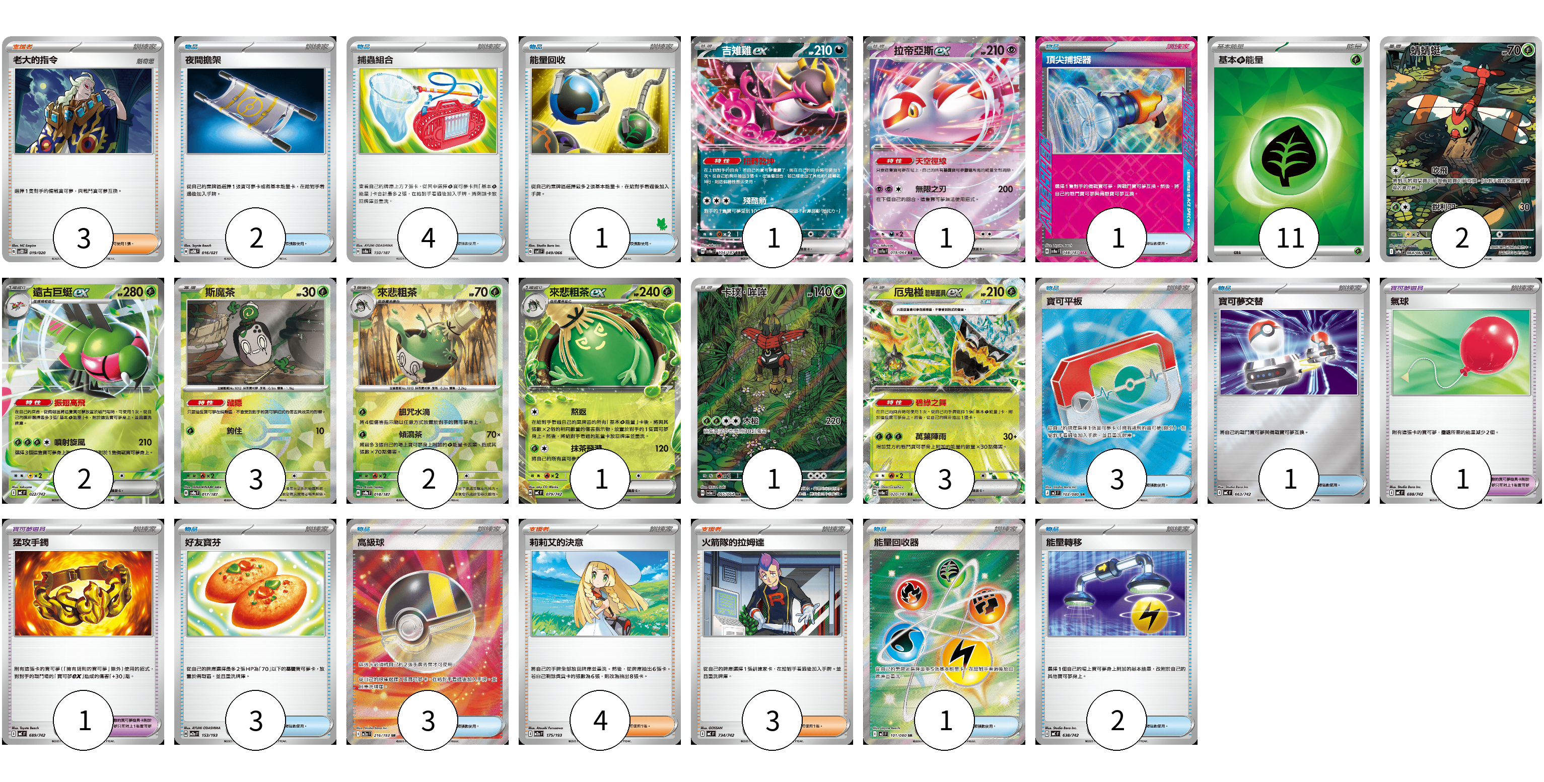 牌組構築方案 以此牌組為基礎新構築牌組 顯示卡面 顯示列表 寶可夢卡(16) 1 1 2 2 3 2 1 1 3 寶可夢道具(2) 1 1 物品卡(21) 2 4 1 1 3 1 3 3 1 2 支援者卡(10) 3 4 3 能量卡(11) 11 寶可夢卡(16) 卡牌名稱 張數 卡牌名稱 張數 吉雉雞ex SV8a 104/187 01 拉帝亞斯ex SV7a 019/064 01 蜻蜻蜓 SV9a 064/063 02 遠古巨蜓ex MC 022/742 02 斯魔茶 SV8a 017/187 03 來悲粗茶 SV8a 018/187 02 來悲粗茶ex MC 079/742 01 卡璞・哞哞 SV6a 065/064 01 厄鬼椪 碧草面具ex SV8a 020/187 03 寶可夢道具(2) 卡牌名稱 張數 卡牌名稱 張數 氣球 MC 688/742 01 猛攻手鐲 MC 689/742 01 物品卡(21) 卡牌名稱 張數 卡牌名稱 張數 夜間擔架 SVOM 016/021 02 捕蟲組合 SV8a 150/187 04 能量回收 SVI 049/066 01 頂尖捕捉器 SV8a 148/187 01 寶可平板 M3 103/080 03 寶可夢交替 MC 663/742 01 好友寶芬 M2a 153/193 03 高級球 M2a 216/193 03 能量回收器 M3 101/080 01 能量轉移 MC 638/742 02 支援者卡(10) 卡牌名稱 張數 卡牌名稱 張數 老大的指令 SVOD 019/020 03 莉莉艾的決意 M2a 175/193 04 火箭隊的拉姆達 MC 734/742 03 能量卡(11) 卡牌名稱 張數 卡牌名稱 張數 基本【草】能量 SVK GRA 11 以此牌組為基礎新構築牌組 牌組編碼 aqHfgF-pVJYGD-mroiIH copy 列印牌組單 牌組編碼已複製 分享至SNS