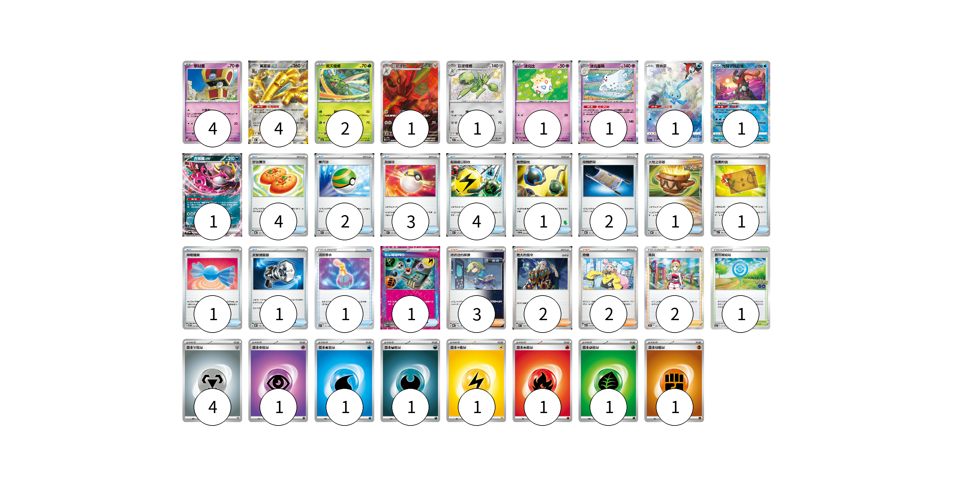 牌組構築方案 以此牌組為基礎新構築牌組 顯示卡面 顯示列表 寶可夢卡(17) 4 4 2 1 1 1 1 1 1 1 物品卡(22) 4 2 3 4 1 2 1 1 1 1 1 1 支援者卡(9) 3 2 2 2 競技場卡(1) 1 能量卡(11) 4 1 1 1 1 1 1 1 寶可夢卡(17) 卡牌名稱 張數 卡牌名稱 張數 索財靈 SV7a 024/064 04 賽富豪ex SV8a 117/187 04 飛天螳螂 SV2a 123/165 02 巨鉗螳螂 SV3 116/108 01 巨鉗螳螂 SV4a 299/190 01 波克比 SV8 045/106 01 波克基斯 SV8 047/106 01 瑪納霏 S12a 178/172 01 光輝甲賀忍蛙 SVF 004/038 01 吉雉雞ex SV8a 104/187 01 物品卡(22) 卡牌名稱 張數 卡牌名稱 張數 好友寶芬 SV8a 147/187 04 巢穴球 SVK 016/042 02 高級球 SVK 018/042 03 超級能量回收 SVK 010/042 04 能量回收 SVI 049/066 01 夜間擔架 SV8a 151/187 02 大地之容器 SV8a 143/187 01 勉勵的信 SV3 100/108 01 神奇糖果 SVTS 015/022 01 反擊捕捉器 SV8a 139/187 01 消除香水 SVF 011/038 01 能量輸送PRO SV7a 052/064 01 支援者卡(9) 卡牌名稱 張數 卡牌名稱 張數 暗碼迷的解讀 SV8a 165/187 03 老大的指令 SVM 172/175 02 奇樹 SVHM 018/022 02 珠貝 S12a 149/172 02 競技場卡(1) 卡牌名稱 張數 卡牌名稱 張數 寶可補給站 S10b 071/071 01 能量卡(11) 卡牌名稱 張數 卡牌名稱 張數 基本【鋼】能量 SVF MET 04 基本【超】能量 SVF PSY 01 基本【水】能量 SVF WAT 01 基本【惡】能量 SVD DAR 01 基本【雷】能量 SVF LIG 01 基本【火】能量 SVF FIR 01 基本【草】能量 SVF GRA 01 基本【鬥】能量 SVF FIG 01 以此牌組為基礎新構築牌組 牌組編碼 arQoVe-zLheuv-EehOql copy 列印牌組單 牌組編碼已複製 分享至SNS