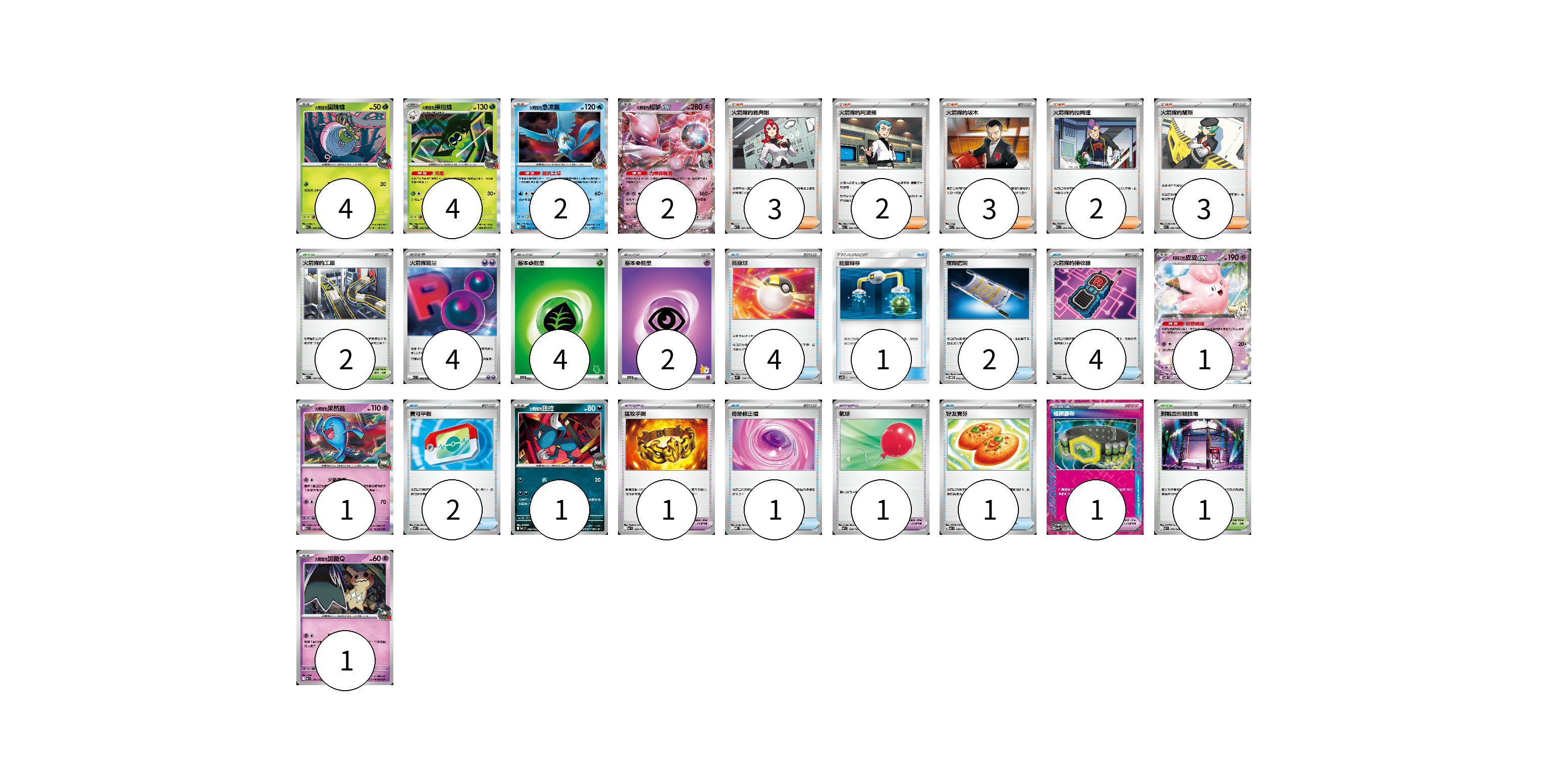 牌組構築方案 以此牌組為基礎新構築牌組 顯示卡面 顯示列表 寶可夢卡(16) 4 4 2 2 1 1 1 1 寶可夢道具(3) 1 1 1 物品卡(15) 4 1 2 4 2 1 1 支援者卡(13) 3 2 3 2 3 競技場卡(3) 2 1 能量卡(10) 4 4 2 寶可夢卡(16) 卡牌名稱 張數 卡牌名稱 張數 <火箭隊的>團珠蛛 SV10 008/098 04 <火箭隊的>操陷蛛 SV10 009/098 04 <火箭隊的>急凍鳥 SV10 022/098 02 <火箭隊的>超夢ex SV10 039/098 02 莉莉艾的皮皮ex SV9 033/100 01 <火箭隊的>果然翁 SV10 040/098 01 <火箭隊的>狃拉 MC 448/742 01 <火箭隊的>謎擬Q MC 341/742 01 寶可夢道具(3) 卡牌名稱 張數 卡牌名稱 張數 猛攻手鐲 MC 689/742 01 氣球 MC 688/742 01 極限腰帶 SV5K 066/071 01 物品卡(15) 卡牌名稱 張數 卡牌名稱 張數 高級球 SVM 134/175 04 能量轉移 AC2D 139/176 01 夜間擔架 SVOM 016/021 02 火箭隊的接收器 SV10 090/098 04 寶可平板 M3 070/080 02 奇跡修正檔 MBD 017/022 01 好友寶芬 MC 648/742 01 支援者卡(13) 卡牌名稱 張數 卡牌名稱 張數 火箭隊的雅典娜 SV10 091/098 03 火箭隊的阿波羅 SV10 092/098 02 火箭隊的坂木 SV10 093/098 03 火箭隊的拉姆達 SV10 094/098 02 火箭隊的蘭斯 SV10 095/098 03 競技場卡(3) 卡牌名稱 張數 卡牌名稱 張數 火箭隊的工廠 SV10 097/098 02 對戰圓形競技場 M2 079/080 01 能量卡(10) 卡牌名稱 張數 卡牌名稱 張數 火箭隊能量 SV10 098/098 04 基本【草】能量 SVI GRA 04 基本【超】能量 SVI PSY 02 以此牌組為基礎新構築牌組 牌組編碼 atDCch-odGbGG-LsIuKy copy 列印牌組單 牌組編碼已複製 分享至SNS
