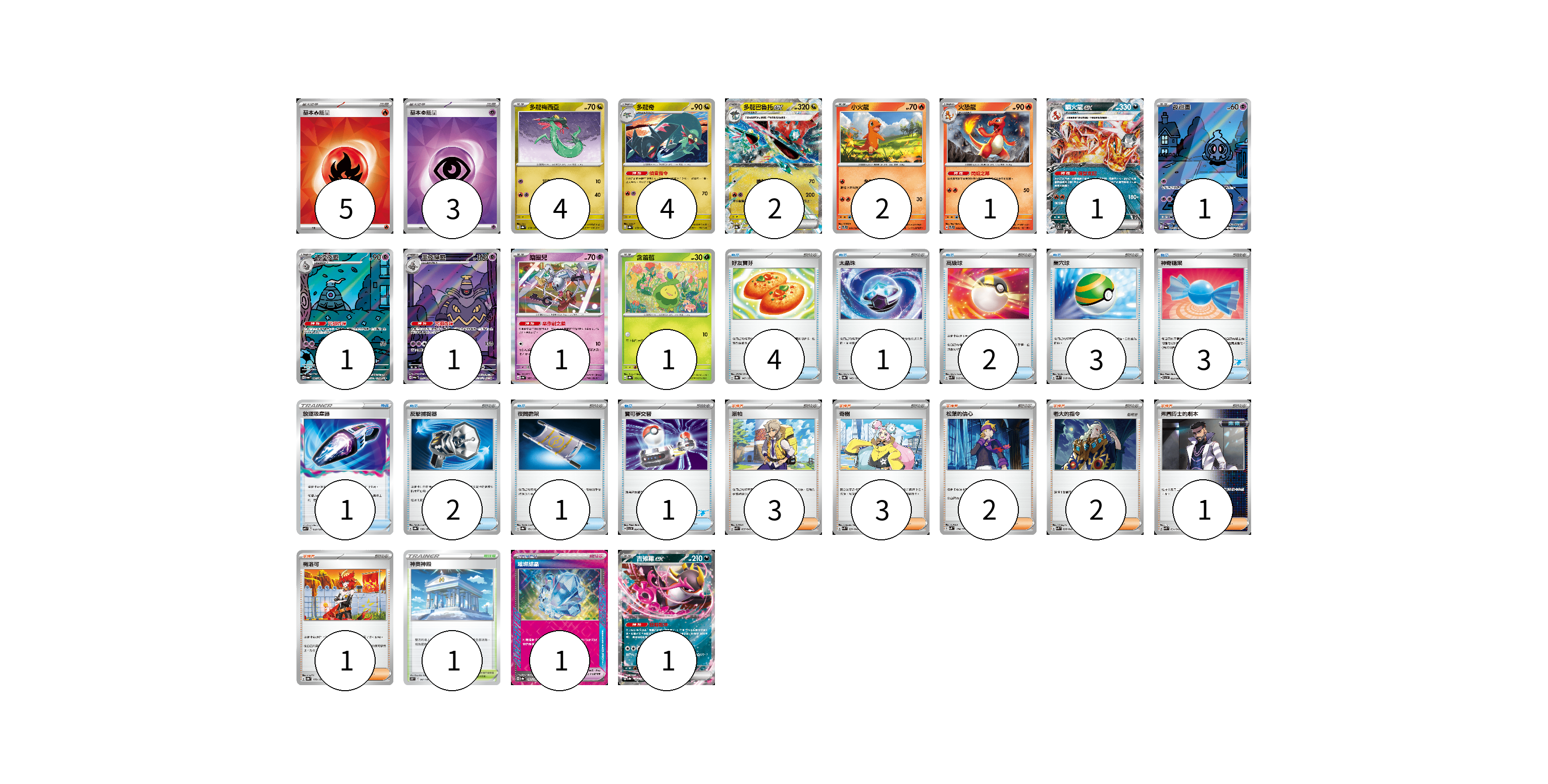牌組構築方案 以此牌組為基礎新構築牌組 顯示卡面 顯示列表 寶可夢卡(20) 4 4 2 2 1 1 1 1 1 1 1 1 寶可夢道具(1) 1 物品卡(18) 4 1 2 3 3 1 2 1 1 支援者卡(12) 3 3 2 2 1 1 競技場卡(1) 1 能量卡(8) 5 3 寶可夢卡(20) 卡牌名稱 張數 卡牌名稱 張數 多龍梅西亞 SV8a 118/187 04 多龍奇 SV8a 119/187 04 多龍巴魯托ex SV8a 120/187 02 小火龍 SVTL 001/021 02 火恐龍 SVTL 002/021 01 噴火龍ex SVTL 006/021 01 夜巡靈 SV6a 068/064 01 彷徨夜靈 SV6a 069/064 01 黑夜魔靈 SV6a 070/064 01 鑰圈兒 SV4a 087/190 01 含羞苞 SV8a 001/187 01 吉雉雞ex SV8a 104/187 01 寶可夢道具(1) 卡牌名稱 張數 卡牌名稱 張數 璀璨結晶 SV8a 152/187 01 物品卡(18) 卡牌名稱 張數 卡牌名稱 張數 好友寶芬 SV8a 147/187 04 太晶珠 SV8a 145/187 01 高級球 SVK 018/042 02 巢穴球 SVK 016/042 03 神奇糖果 SVI 053/066 03 放逐吸塵器 SVF 023/038 01 反擊捕捉器 SV8a 139/187 02 夜間擔架 SV8a 151/187 01 寶可夢交替 SVI 054/066 01 支援者卡(12) 卡牌名稱 張數 卡牌名稱 張數 派帕 SVK 035/042 03 奇樹 SVK 031/042 03 松葉的信心 SVM 174/175 02 老大的指令 SVK 036/042 02 弗圖博士的劇本 SVK 034/042 01 梅洛可 SV8a 179/187 01 競技場卡(1) 卡牌名稱 張數 卡牌名稱 張數 神奧神殿 S10P 067/067 01 能量卡(8) 卡牌名稱 張數 卡牌名稱 張數 基本【火】能量 SVK FIR 05 基本【超】能量 SVK PSY 03 以此牌組為基礎新構築牌組 牌組編碼 bAzPFX-EaksqN-ztBpMW copy 列印牌組單 牌組編碼已複製 分享至SNS