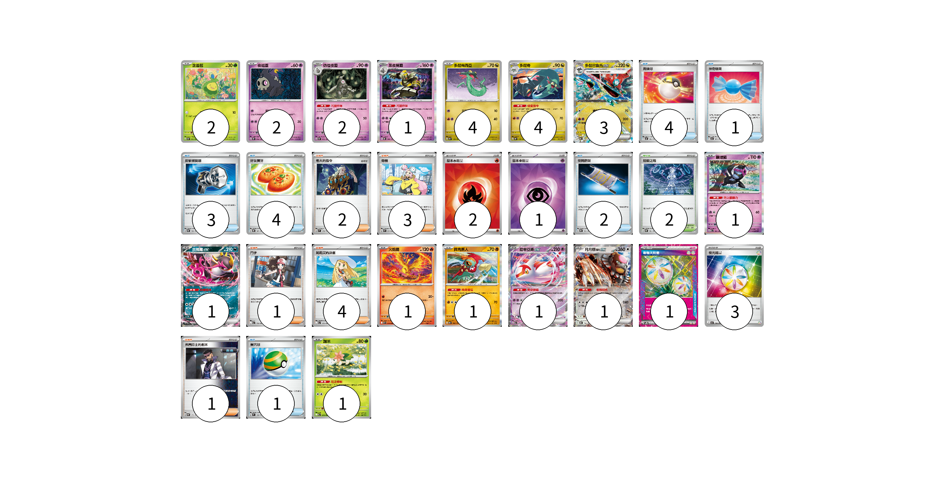 牌組構築方案 以此牌組為基礎新構築牌組 顯示卡面 顯示列表 寶可夢卡(25) 2 2 2 1 4 4 3 1 1 1 1 1 1 1 物品卡(15) 4 1 3 4 2 1 支援者卡(11) 2 3 1 4 1 競技場卡(2) 2 能量卡(7) 2 1 1 3 寶可夢卡(25) 卡牌名稱 張數 卡牌名稱 張數 含羞苞 SV8a 001/187 02 夜巡靈 SV8a 064/187 02 彷徨夜靈 SV8a 065/187 02 黑夜魔靈 SV8a 066/187 01 多龍梅西亞 SV8a 118/187 04 多龍奇 SV8a 119/187 04 多龍巴魯托ex SV8a 120/187 03 願增猿 M2a 081/193 01 吉雉雞ex M2a 114/193 01 火焰鳥 M2 014/080 01 摔角鷹人 SV8a 084/187 01 拉帝亞斯ex M2a 075/193 01 月月熊 赫月ex SV8a 134/187 01 謝米 M2a 012/193 01 物品卡(15) 卡牌名稱 張數 卡牌名稱 張數 高級球 SV4a 161/190 04 神奇糖果 SV4a 163/190 01 反擊捕捉器 SV8a 139/187 03 好友寶芬 SV8a 147/187 04 夜間擔架 SV8a 151/187 02 巢穴球 SVM 133/175 01 支援者卡(11) 卡牌名稱 張數 卡牌名稱 張數 老大的指令 SVM 172/175 02 奇樹 SVK 031/042 03 鬥子 M2a 172/193 01 莉莉艾的決意 M2a 175/193 04 弗圖博士的劇本 SV8a 175/187 01 競技場卡(2) 卡牌名稱 張數 卡牌名稱 張數 阻礙之塔 SV8a 181/187 02 能量卡(7) 卡牌名稱 張數 卡牌名稱 張數 基本【火】能量 SVK FIR 02 基本【超】能量 SVK PSY 01 新衝天能量 SV5K 071/071 01 夜光能量 SV4a 190/190 03 以此牌組為基礎新構築牌組 牌組編碼 bBdZIw-xGDSTh-ESsqgm copy 列印牌組單 牌組編碼已複製 分享至SNS