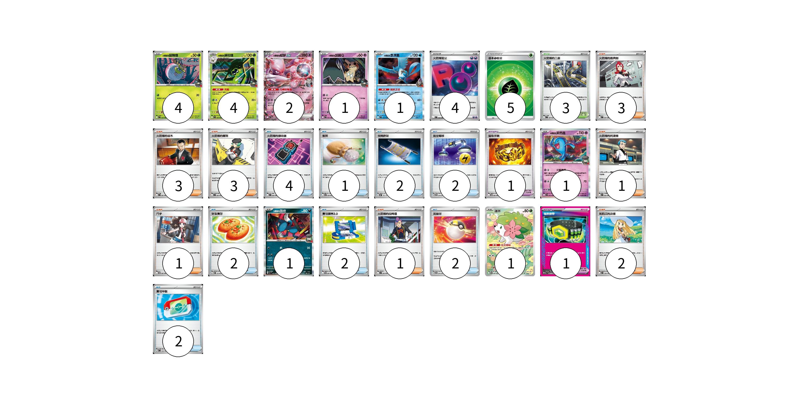 牌組構築方案 以此牌組為基礎新構築牌組 顯示卡面 顯示列表 寶可夢卡(15) 4 4 2 1 1 1 1 1 寶可夢道具(2) 1 1 物品卡(17) 4 1 2 2 2 2 2 2 支援者卡(14) 3 3 3 1 1 1 2 競技場卡(3) 3 能量卡(9) 4 5 寶可夢卡(15) 卡牌名稱 張數 卡牌名稱 張數 <火箭隊的>團珠蛛 SV10 008/098 04 <火箭隊的>操陷蛛 SV10 009/098 04 <火箭隊的>超夢ex SV10 039/098 02 <火箭隊的>謎擬Q SV10 042/098 01 <火箭隊的>急凍鳥 SV10 022/098 01 <火箭隊的>果然翁 SV10 040/098 01 <火箭隊的>狃拉 SV10 072/098 01 謝米 SV9a 066/063 01 寶可夢道具(2) 卡牌名稱 張數 卡牌名稱 張數 猛攻手鐲 SV11W 082/086 01 極限腰帶 MC 691/742 01 物品卡(17) 卡牌名稱 張數 卡牌名稱 張數 火箭隊的接收器 SV10 090/098 04 聖灰 SV9a 056/063 01 夜間擔架 SV8a 151/187 02 能量轉移 SVTR 010/021 02 好友寶芬 MBD 013/022 02 寶可裝置3.0 SV11B 081/086 02 高級球 SVTR 014/021 02 寶可平板 MC 662/742 02 支援者卡(14) 卡牌名稱 張數 卡牌名稱 張數 火箭隊的雅典娜 SV10 091/098 03 火箭隊的坂木 SV10 093/098 03 火箭隊的蘭斯 SV10 095/098 03 火箭隊的阿波羅 SV10 092/098 01 鬥子 SV11W 085/086 01 火箭隊的拉姆達 SV10 094/098 01 莉莉艾的決意 MC 729/742 02 競技場卡(3) 卡牌名稱 張數 卡牌名稱 張數 火箭隊的工廠 SV10 097/098 03 能量卡(9) 卡牌名稱 張數 卡牌名稱 張數 火箭隊能量 SV10 098/098 04 基本【草】能量 SI GRA 05 以此牌組為基礎新構築牌組 牌組編碼 bCVXJu-dIGybs-vIGPzZ copy 列印牌組單 牌組編碼已複製 分享至SNS