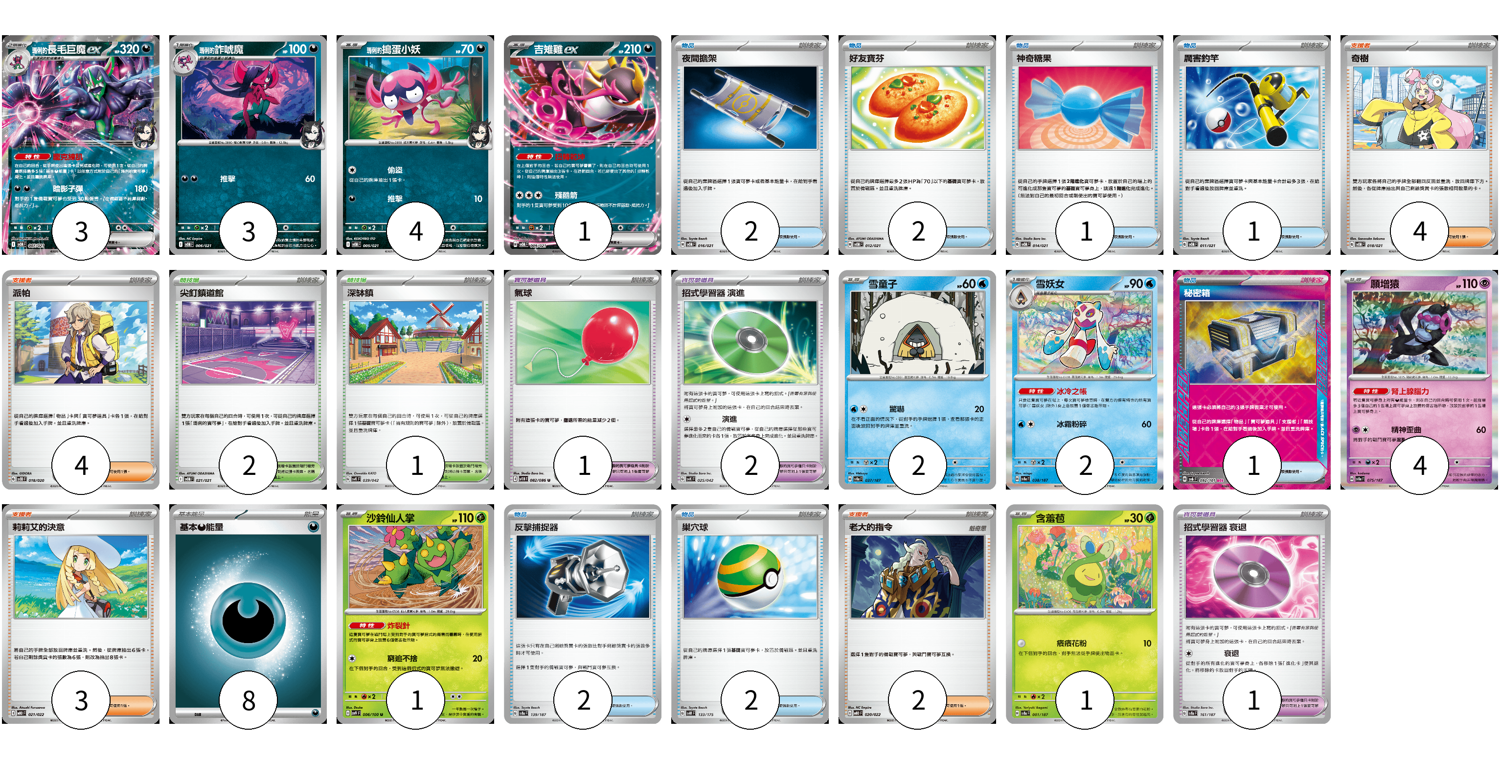 牌組構築方案 以此牌組為基礎新構築牌組 顯示卡面 顯示列表 寶可夢卡(21) 3 3 4 1 2 2 4 1 1 寶可夢道具(4) 1 2 1 物品卡(11) 2 2 1 1 1 2 2 支援者卡(13) 4 4 3 2 競技場卡(3) 2 1 能量卡(8) 8 寶可夢卡(21) 卡牌名稱 張數 卡牌名稱 張數 <瑪俐的>長毛巨魔ex SVOM 007/021 03 <瑪俐的>詐唬魔 SVOM 006/021 03 <瑪俐的>搗蛋小妖 SVOM 005/021 04 吉雉雞ex SVOM 009/021 01 雪童子 SV8a 037/187 02 雪妖女 SV8a 038/187 02 願增猿 SV8a 075/187 04 沙鈴仙人掌 SV9 006/100 01 含羞苞 SV8a 001/187 01 寶可夢道具(4) 卡牌名稱 張數 卡牌名稱 張數 氣球 SV11B 082/086 01 招式學習器 演進 SVK 025/042 02 招式學習器 衰退 SV8a 161/187 01 物品卡(11) 卡牌名稱 張數 卡牌名稱 張數 夜間擔架 SVOM 016/021 02 好友寶芬 SVOM 012/021 02 神奇糖果 SVOM 014/021 01 厲害釣竿 SVOM 011/021 01 秘密箱 SV6 092/101 01 反擊捕捉器 SV8a 139/187 02 巢穴球 SVM 133/175 02 支援者卡(13) 卡牌名稱 張數 卡牌名稱 張數 奇樹 SVOM 018/021 04 派帕 SVOD 018/020 04 莉莉艾的決意 MBD 021/022 03 老大的指令 MBD 020/022 02 競技場卡(3) 卡牌名稱 張數 卡牌名稱 張數 尖釘鎮道館 SVOM 021/021 02 深缽鎮 SVK 039/042 01 能量卡(8) 卡牌名稱 張數 卡牌名稱 張數 基本【惡】能量 MBG DAR 08 以此牌組為基礎新構築牌組 牌組編碼 bCXhvo-bzAbQb-SXYxDf copy 列印牌組單 牌組編碼已複製 分享至SNS