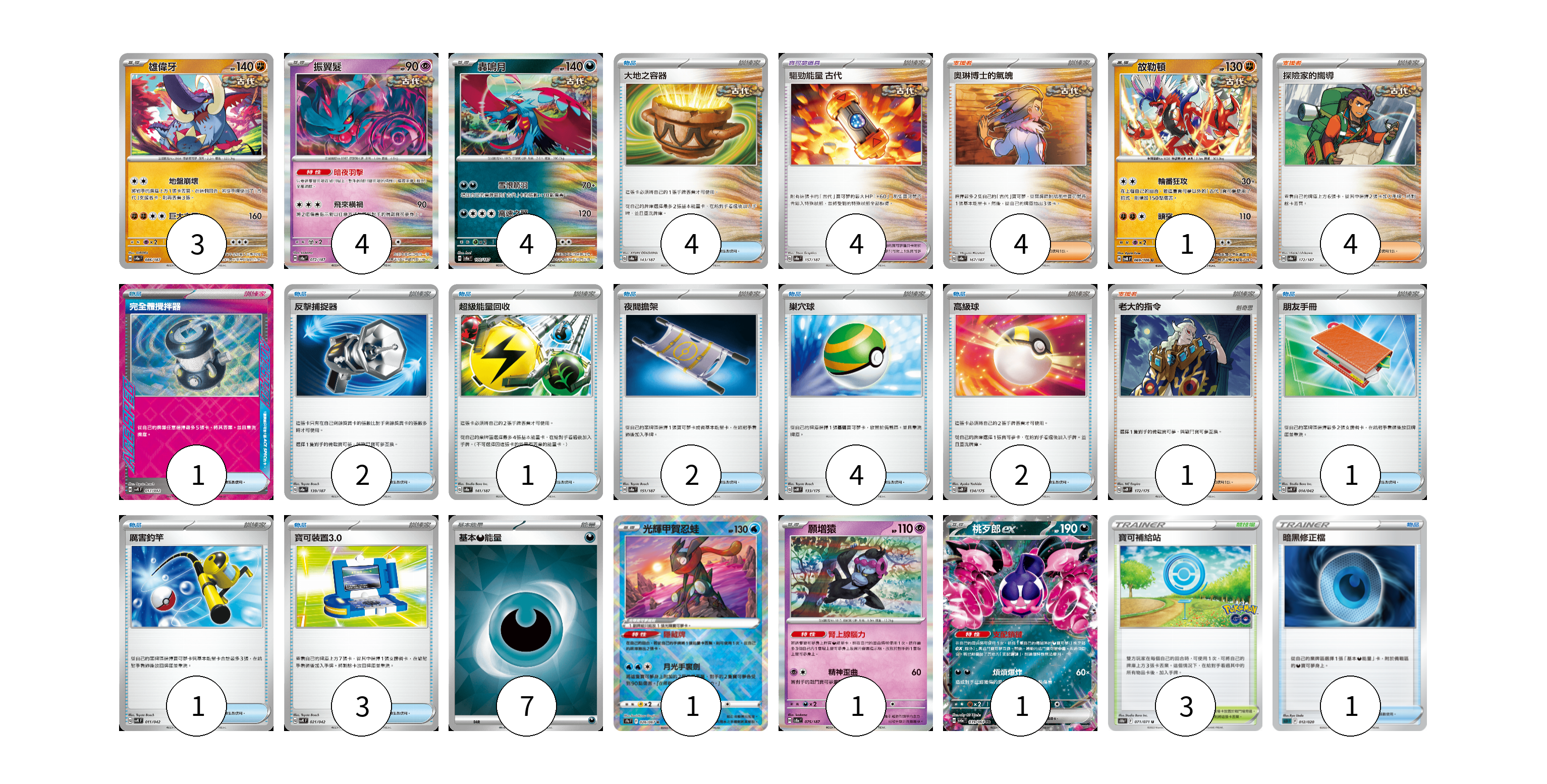 牌組構築方案 以此牌組為基礎新構築牌組 顯示卡面 顯示列表 寶可夢卡(15) 3 4 4 1 1 1 1 寶可夢道具(4) 4 物品卡(22) 4 1 2 1 2 4 2 1 1 3 1 支援者卡(9) 4 4 1 競技場卡(3) 3 能量卡(7) 7 寶可夢卡(15) 卡牌名稱 張數 卡牌名稱 張數 雄偉牙 SV8a 086/187 03 振翼髮 SV8a 072/187 04 轟鳴月 SV8a 100/187 04 故勒頓 SV8 069/106 01 光輝甲賀忍蛙 S9a 026/067 01 願增猿 SV8a 075/187 01 桃歹郎ex SV6a 039/064 01 寶可夢道具(4) 卡牌名稱 張數 卡牌名稱 張數 驅勁能量 古代 SV8a 157/187 04 物品卡(22) 卡牌名稱 張數 卡牌名稱 張數 大地之容器 SV8a 143/187 04 完全體攪拌器 SVK 017/042 01 反擊捕捉器 SV8a 139/187 02 超級能量回收 SV8a 141/187 01 夜間擔架 SV8a 151/187 02 巢穴球 SVM 133/175 04 高級球 SVM 134/175 02 朋友手冊 SVK 014/042 01 厲害釣竿 SVK 011/042 01 寶可裝置3.0 SVK 021/042 03 暗黑修正檔 SLD 012/020 01 支援者卡(9) 卡牌名稱 張數 卡牌名稱 張數 奧琳博士的氣魄 SV8a 167/187 04 探險家的嚮導 SV8a 172/187 04 老大的指令 SVM 172/175 01 競技場卡(3) 卡牌名稱 張數 卡牌名稱 張數 寶可補給站 S10b 071/071 03 能量卡(7) 卡牌名稱 張數 卡牌名稱 張數 基本【惡】能量 SVK DAR 07 以此牌組為基礎新構築牌組 牌組編碼 bCmypG-UrUjLv-xoYMfH copy 列印牌組單 牌組編碼已複製 分享至SNS
