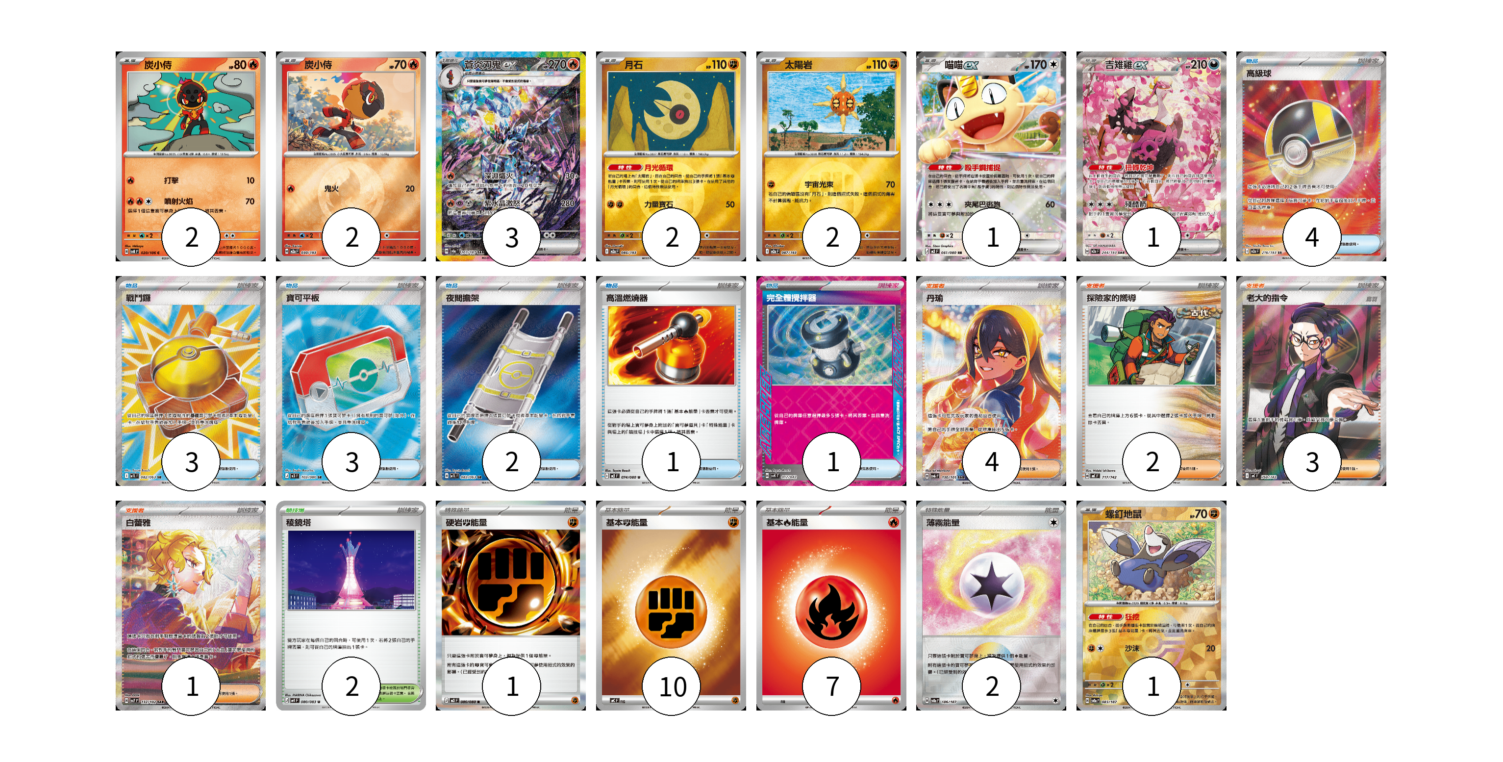 牌組構築方案 以此牌組為基礎新構築牌組 顯示卡面 顯示列表 寶可夢卡(14) 2 2 3 2 2 1 1 1 物品卡(14) 4 3 3 2 1 1 支援者卡(10) 4 2 3 1 競技場卡(2) 2 能量卡(20) 1 10 7 2 寶可夢卡(14) 卡牌名稱 張數 卡牌名稱 張數 炭小侍 SV8 020/106 02 炭小侍 M2a 030/193 02 蒼炎刃鬼ex SV8a 203/187 03 月石 M2a 086/193 02 太陽岩 M2a 087/193 02 喵喵ex M3 061/080 01 吉雉雞ex M2a 244/193 01 螺釘地鼠 SV8a 083/187 01 物品卡(14) 卡牌名稱 張數 卡牌名稱 張數 高級球 M2a 216/193 04 戰鬥鑼 M1L 082/063 03 寶可平板 M3 103/080 03 夜間擔架 M1L 083/063 02 高溫燃燒器 M2 074/080 01 完全體攪拌器 SVK 017/042 01 支援者卡(10) 卡牌名稱 張數 卡牌名稱 張數 丹瑜 SV6 130/101 04 探險家的嚮導 MC 717/742 02 老大的指令(烏羽) MC 760/742 03 白蕾雅 SV7 132/102 01 競技場卡(2) 卡牌名稱 張數 卡牌名稱 張數 稜鏡塔 M4 080/083 02 能量卡(20) 卡牌名稱 張數 卡牌名稱 張數 硬岩【鬥】能量 M3 080/080 01 基本【鬥】能量 MC FIG 10 基本【火】能量 MC FIR 07 薄霧能量 SV8a 186/187 02 以此牌組為基礎新構築牌組 牌組編碼 bDSelP-qvcyGd-bgIosY copy 列印牌組單 牌組編碼已複製 分享至SNS