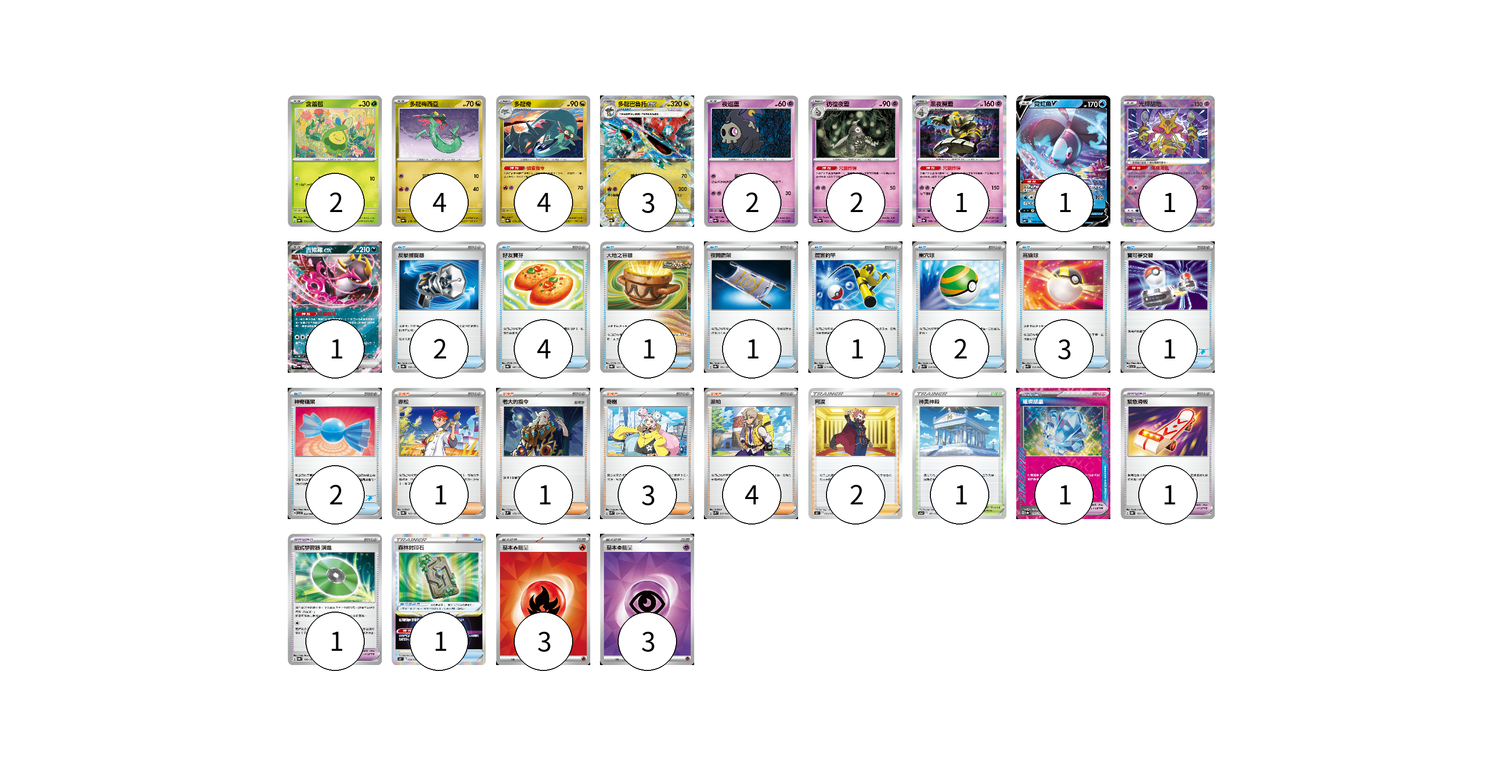 牌組構築方案 以此牌組為基礎新構築牌組 顯示卡面 顯示列表 寶可夢卡(21) 2 4 4 3 2 2 1 1 1 1 寶可夢道具(4) 1 1 1 1 物品卡(17) 2 4 1 1 1 2 3 1 2 支援者卡(11) 1 1 3 4 2 競技場卡(1) 1 能量卡(6) 3 3 寶可夢卡(21) 卡牌名稱 張數 卡牌名稱 張數 含羞苞 SV8a 001/187 02 多龍梅西亞 SV8a 118/187 04 多龍奇 SV8a 119/187 04 多龍巴魯托ex SV8a 120/187 03 夜巡靈 SV8a 064/187 02 彷徨夜靈 SV8a 065/187 02 黑夜魔靈 SV8a 066/187 01 霓虹魚V SVB 008/028 01 光輝胡地 S11a 031/068 01 吉雉雞ex SV6a 038/064 01 寶可夢道具(4) 卡牌名稱 張數 卡牌名稱 張數 璀璨結晶 SV8a 152/187 01 緊急滑板 SV8a 153/187 01 招式學習器 演進 SV8a 160/187 01 森林封印石 S12 092/098 01 物品卡(17) 卡牌名稱 張數 卡牌名稱 張數 反擊捕捉器 SV8a 139/187 02 好友寶芬 SV8a 147/187 04 大地之容器 SV8a 143/187 01 夜間擔架 SV8a 151/187 01 厲害釣竿 SVK 011/042 01 巢穴球 SVK 016/042 02 高級球 SVK 018/042 03 寶可夢交替 SVI 054/066 01 神奇糖果 SVI 053/066 02 支援者卡(11) 卡牌名稱 張數 卡牌名稱 張數 赤松 SV8a 163/187 01 老大的指令 SVM 172/175 01 奇樹 SVK 031/042 03 派帕 SVK 035/042 04 阿渡 S12 096/098 02 競技場卡(1) 卡牌名稱 張數 卡牌名稱 張數 神奧神殿 S12a 169/172 01 能量卡(6) 卡牌名稱 張數 卡牌名稱 張數 基本【火】能量 SVK FIR 03 基本【超】能量 SVK PSY 03 以此牌組為基礎新構築牌組 牌組編碼 bEtegZ-NHckCU-flRfzS copy 列印牌組單 牌組編碼已複製 分享至SNS