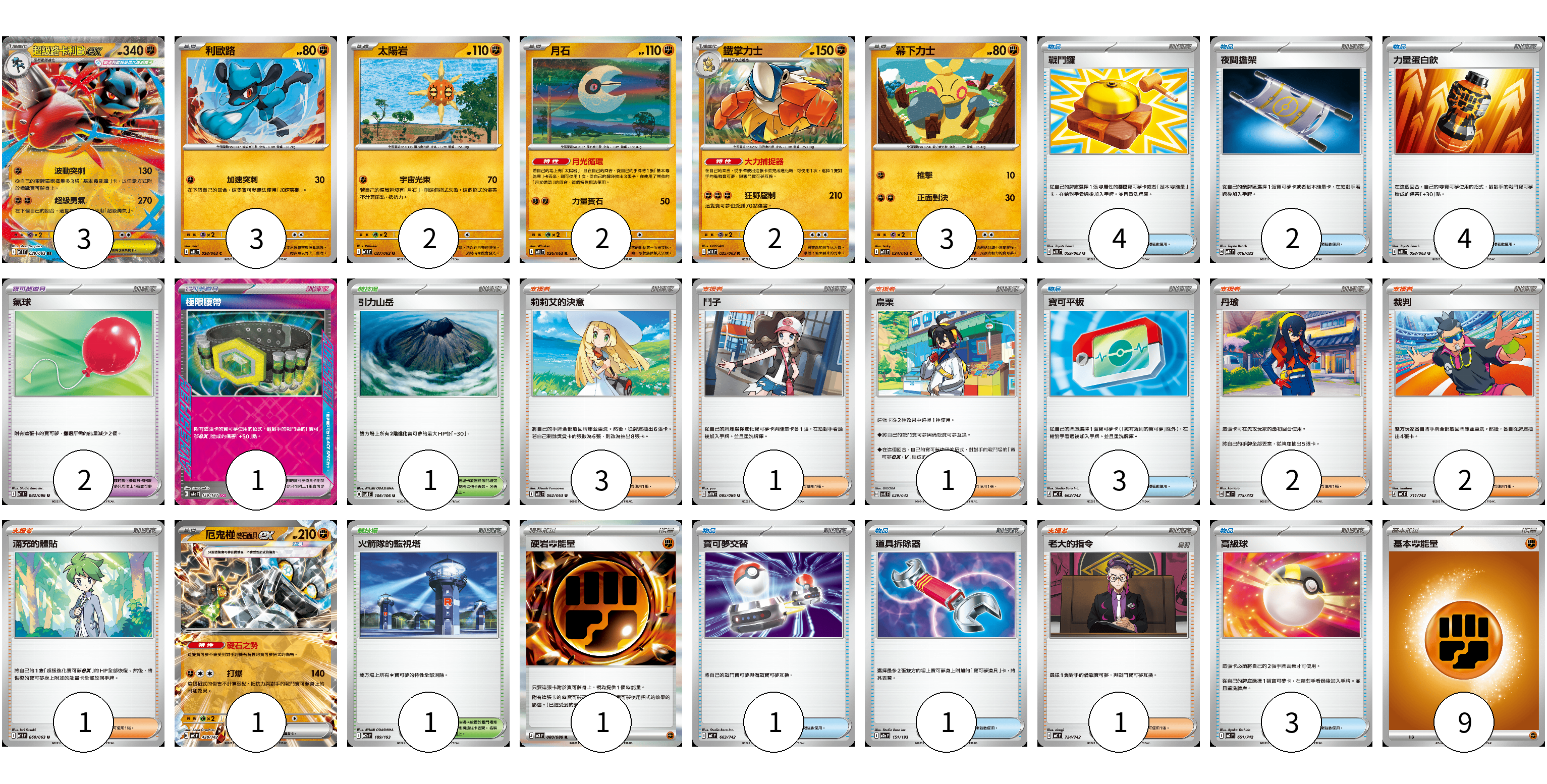 牌組構築方案 以此牌組為基礎新構築牌組 顯示卡面 顯示列表 寶可夢卡(16) 3 3 2 2 2 3 1 寶可夢道具(3) 2 1 物品卡(18) 4 2 4 3 1 1 3 支援者卡(11) 3 1 1 2 2 1 1 競技場卡(2) 1 1 能量卡(10) 1 9 寶可夢卡(16) 卡牌名稱 張數 卡牌名稱 張數 超級路卡利歐ex M1L 029/063 03 利歐路 M1L 028/063 03 太陽岩 M1L 027/063 02 月石 M1L 026/063 02 鐵掌力士 M1L 025/063 02 幕下力士 M1L 024/063 03 厄鬼椪 礎石面具ex MC 428/742 01 寶可夢道具(3) 卡牌名稱 張數 卡牌名稱 張數 氣球 SV11B 082/086 02 極限腰帶 SV8a 159/187 01 物品卡(18) 卡牌名稱 張數 卡牌名稱 張數 戰鬥鑼 M1L 059/063 04 夜間擔架 MBD 016/022 02 力量蛋白飲 M1L 058/063 04 寶可平板 MC 662/742 03 寶可夢交替 MC 663/742 01 道具拆除器 M2a 151/193 01 高級球 MC 651/742 03 支援者卡(11) 卡牌名稱 張數 卡牌名稱 張數 莉莉艾的決意 M1L 062/063 03 鬥子 SV11W 085/086 01 烏栗 SVK 029/042 01 丹瑜 MC 715/742 02 裁判 MC 711/742 02 滿充的體貼 M1S 060/063 01 老大的指令 MC 724/742 01 競技場卡(2) 卡牌名稱 張數 卡牌名稱 張數 引力山岳 SV8 106/106 01 火箭隊的監視塔 M2a 189/193 01 能量卡(10) 卡牌名稱 張數 卡牌名稱 張數 硬岩【鬥】能量 M3 080/080 01 基本【鬥】能量 MC FIG 09 以此牌組為基礎新構築牌組 牌組編碼 bIFXTV-WPwGgk-QpGdOR copy 列印牌組單 牌組編碼已複製 分享至SNS