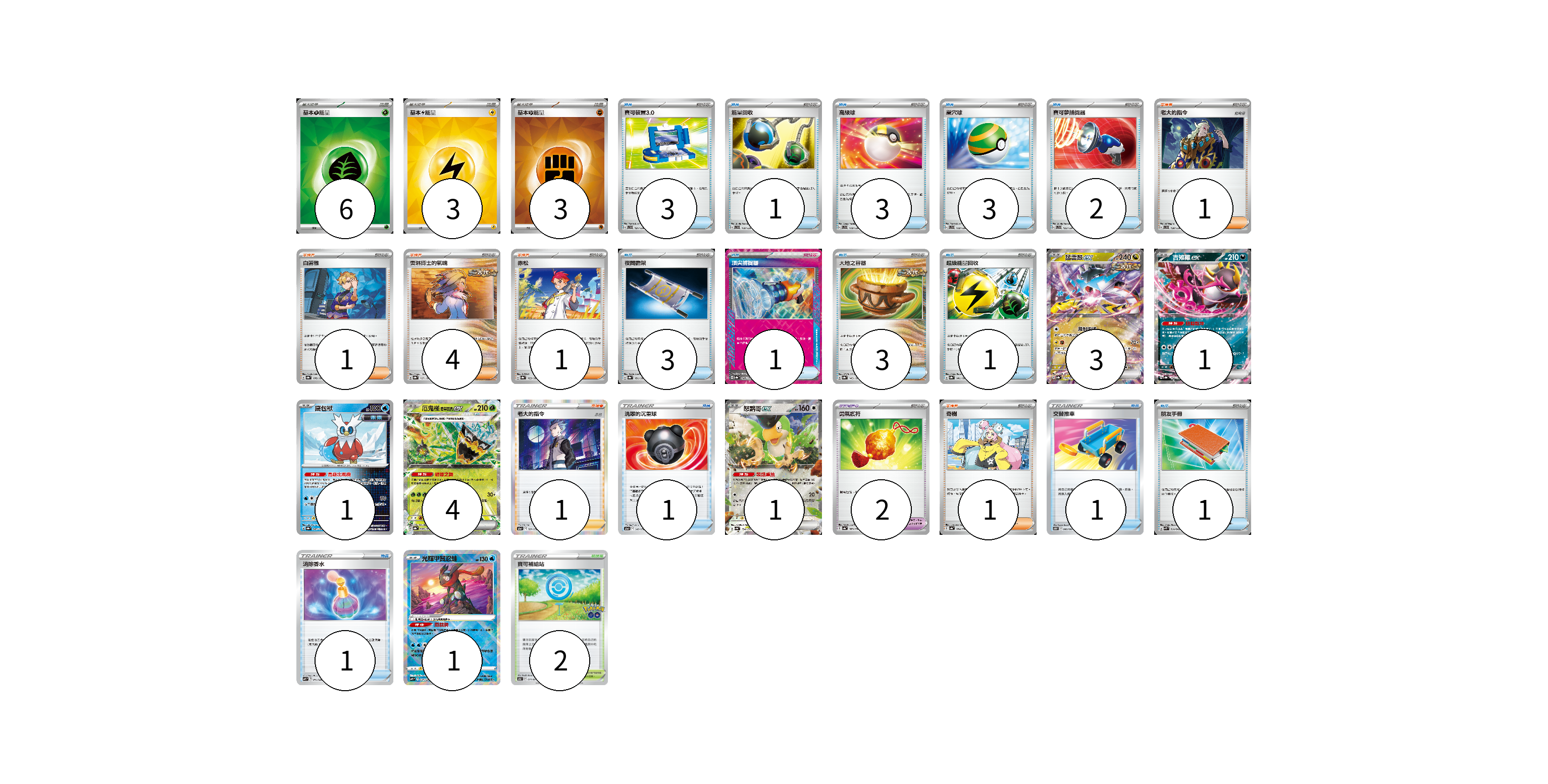 牌組構築方案 以此牌組為基礎新構築牌組 顯示卡面 顯示列表 寶可夢卡(11) 3 1 1 4 1 1 寶可夢道具(2) 2 物品卡(24) 3 1 3 3 2 3 1 3 1 1 1 1 1 支援者卡(9) 1 1 4 1 1 1 競技場卡(2) 2 能量卡(12) 6 3 3 寶可夢卡(11) 卡牌名稱 張數 卡牌名稱 張數 猛雷鼓ex SV8a 124/187 03 吉雉雞ex SV8a 104/187 01 鐵包袱 SV8a 047/187 01 厄鬼椪 碧草面具ex SV8a 020/187 04 怒鸚哥ex SV4a 154/190 01 光輝甲賀忍蛙 SVF 004/038 01 寶可夢道具(2) 卡牌名稱 張數 卡牌名稱 張數 勇氣護符 SV4a 169/190 02 物品卡(24) 卡牌名稱 張數 卡牌名稱 張數 寶可裝置3.0 SVD 121/139 03 能量回收 SVD 110/139 01 高級球 SVD 119/139 03 巢穴球 SVD 118/139 03 寶可夢捕捉器 SVD 123/139 02 夜間擔架 SV8a 151/187 03 頂尖捕捉器 SV8a 148/187 01 大地之容器 SV8a 143/187 03 超級能量回收 SV8a 141/187 01 洗翠的沉重球 S12a 140/172 01 交替推車 S10D 060/067 01 朋友手冊 SVK 014/042 01 消除香水 SVF 011/038 01 支援者卡(9) 卡牌名稱 張數 卡牌名稱 張數 老大的指令(魁奇思) SVD 138/139 01 白蕾雅 SV8a 176/187 01 奧琳博士的氣魄 SV8a 167/187 04 赤松 SV8a 163/187 01 老大的指令(赤日) S12a 161/172 01 奇樹 SV4a 174/190 01 競技場卡(2) 卡牌名稱 張數 卡牌名稱 張數 寶可補給站 S10b 071/071 02 能量卡(12) 卡牌名稱 張數 卡牌名稱 張數 基本【草】能量 SVK GRA 06 基本【雷】能量 SVK LIG 03 基本【鬥】能量 SVK FIG 03 以此牌組為基礎新構築牌組 牌組編碼 bIoASp-MkuSDq-lCAkqn copy 列印牌組單 牌組編碼已複製 分享至SNS
