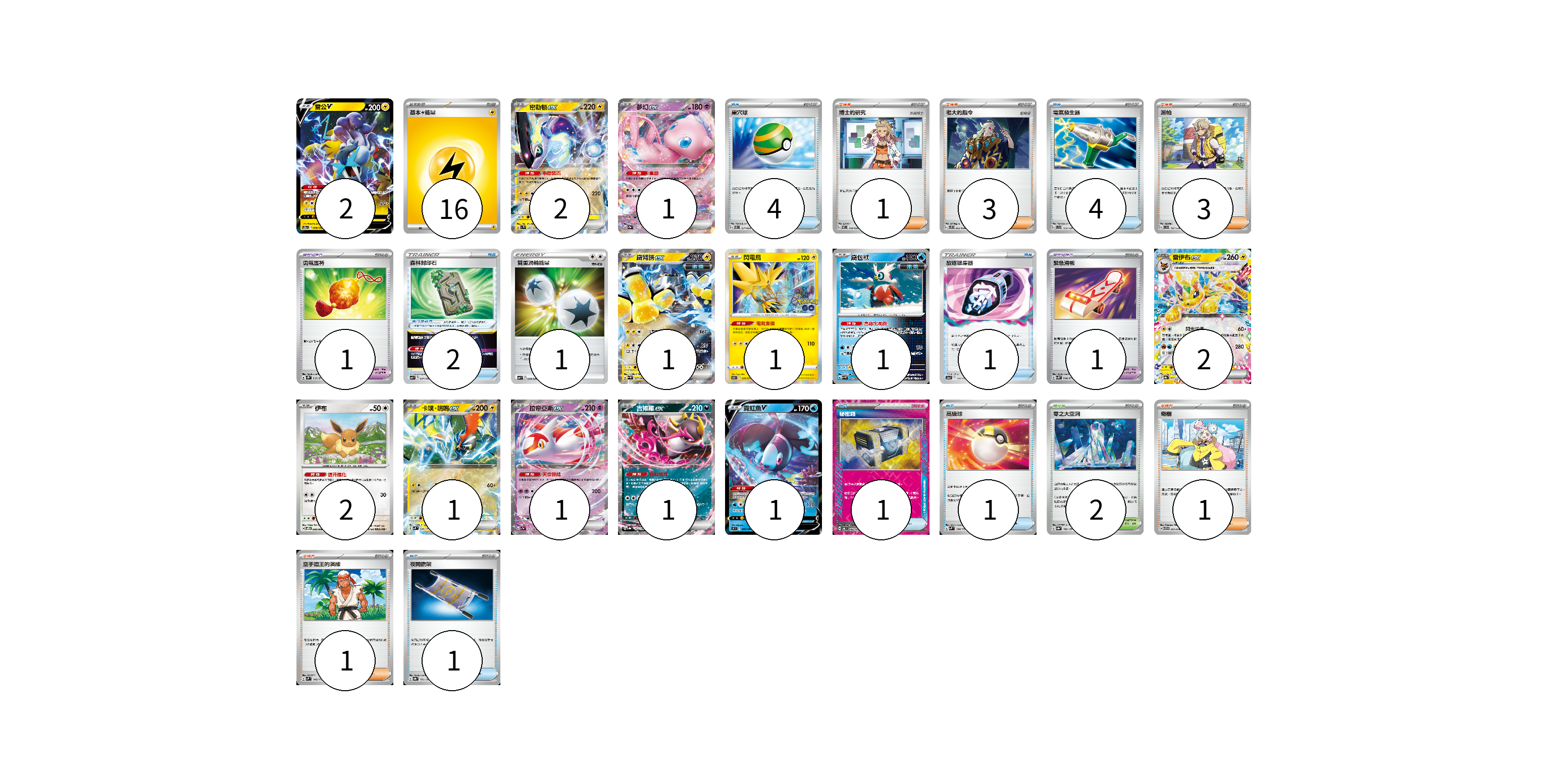 牌組構築方案 以此牌組為基礎新構築牌組 顯示卡面 顯示列表 寶可夢卡(16) 2 2 1 1 1 1 2 2 1 1 1 1 寶可夢道具(2) 1 1 物品卡(14) 4 4 2 1 1 1 1 支援者卡(9) 1 3 3 1 1 競技場卡(2) 2 能量卡(17) 16 1 寶可夢卡(16) 卡牌名稱 張數 卡牌名稱 張數 雷公V S12a 038/172 02 密勒頓ex SV1V 037/078 02 夢幻ex SV2a 151/165 01 鐵臂膀ex SV4M 027/066 01 閃電鳥 S10b 029/071 01 鐵包袱 SV4M 020/066 01 雷伊布ex SV8a 052/187 02 伊布 SVPN 008/008 02 卡璞・鳴鳴ex SVM 046/175 01 拉帝亞斯ex SV7a 019/064 01 吉雉雞ex SV8a 104/187 01 霓虹魚V S9 030/100 01 寶可夢道具(2) 卡牌名稱 張數 卡牌名稱 張數 勇氣護符 SV2D 067/071 01 緊急滑板 SV5K 064/071 01 物品卡(14) 卡牌名稱 張數 卡牌名稱 張數 巢穴球 SVEL 011/020 04 電氣發生器 SVD 113/139 04 森林封印石 SVF 024/038 02 放逐吸塵器 S12a 144/172 01 秘密箱 SV6 092/101 01 高級球 SVM 134/175 01 夜間擔架 SV8a 151/187 01 支援者卡(9) 卡牌名稱 張數 卡牌名稱 張數 博士的研究 SVEL 018/020 01 老大的指令 SVF 032/038 03 派帕 SVD 137/139 03 奇樹 SVTG 017/019 01 空手道王的演練 SVM 149/175 01 競技場卡(2) 卡牌名稱 張數 卡牌名稱 張數 零之大空洞 SV8a 182/187 02 能量卡(17) 卡牌名稱 張數 卡牌名稱 張數 基本【雷】能量 SVF LIG 16 雙重渦輪能量 SVF 038/038 01 以此牌組為基礎新構築牌組 牌組編碼 bLeKxJ-jYAiot-wHeyEB copy 列印牌組單 牌組編碼已複製 分享至SNS