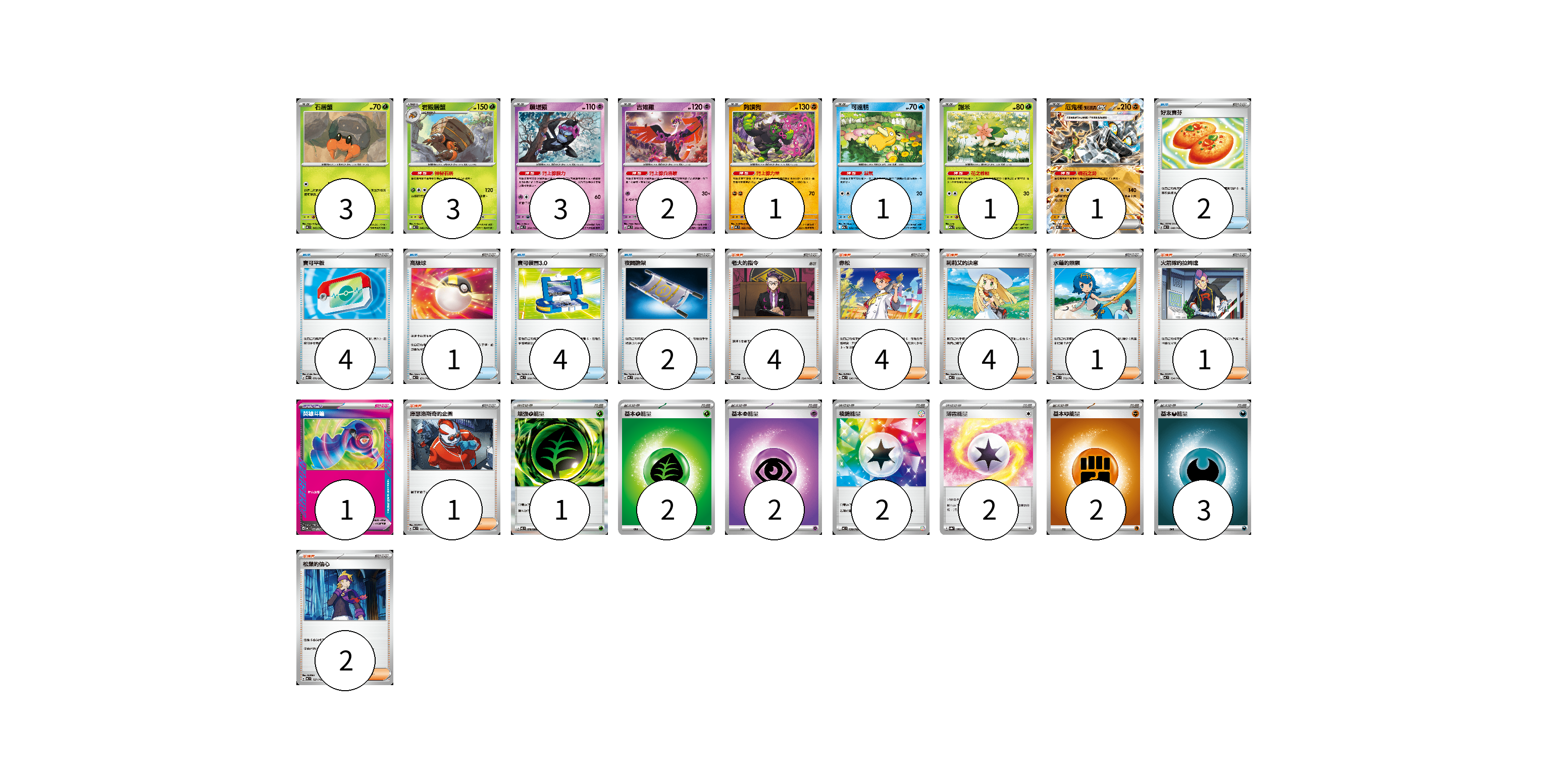 牌組構築方案 以此牌組為基礎新構築牌組 顯示卡面 顯示列表 寶可夢卡(15) 3 3 3 2 1 1 1 1 寶可夢道具(1) 1 物品卡(13) 2 4 1 4 2 支援者卡(17) 4 4 4 1 1 1 2 能量卡(14) 1 2 2 2 2 2 3 寶可夢卡(15) 卡牌名稱 張數 卡牌名稱 張數 石居蟹 MC 045/742 03 岩殿居蟹 MC 046/742 03 願增猿 MC 358/742 03 吉雉雞 MC 359/742 02 夠讚狗 MC 426/742 01 可達鴨 M2a 032/193 01 謝米 M2a 012/193 01 厄鬼椪 礎石面具ex MC 428/742 01 寶可夢道具(1) 卡牌名稱 張數 卡牌名稱 張數 英雄斗篷 MC 687/742 01 物品卡(13) 卡牌名稱 張數 卡牌名稱 張數 好友寶芬 MC 648/742 02 寶可平板 M3 070/080 04 高級球 MC 651/742 01 寶可裝置3.0 MC 660/742 04 夜間擔架 MC 670/742 02 支援者卡(17) 卡牌名稱 張數 卡牌名稱 張數 老大的指令 MC 724/742 04 赤松 MC 696/742 04 莉莉艾的決意 MC 729/742 04 水蓮的照顧 MC 712/742 01 火箭隊的拉姆達 MC 734/742 01 庫瑟洛斯奇的企圖 MC 705/742 01 松葉的信心 MC 727/742 02 能量卡(14) 卡牌名稱 張數 卡牌名稱 張數 增強【草】能量 M3 078/080 01 基本【草】能量 MJ GRA 02 基本【超】能量 MC PSY 02 稜鏡能量 MC 739/742 02 薄霧能量 SV8a 186/187 02 基本【鬥】能量 MC FIG 02 基本【惡】能量 MC DAR 03 以此牌組為基礎新構築牌組 牌組編碼 bNIkGm-sdxCFH-lGRgYC copy 列印牌組單 牌組編碼已複製 分享至SNS