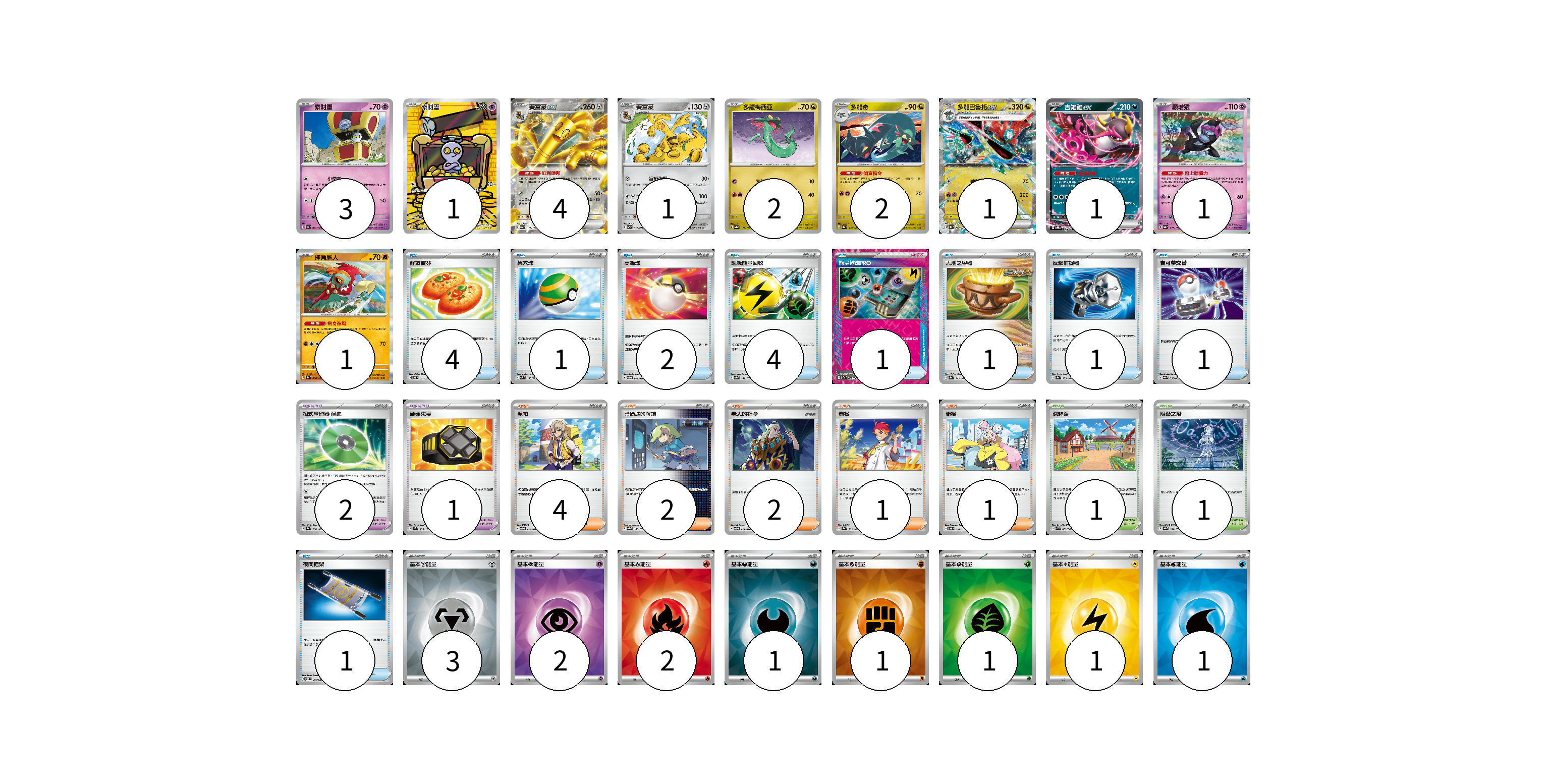 牌組構築方案 以此牌組為基礎新構築牌組 顯示卡面 顯示列表 寶可夢卡(17) 3 1 4 1 2 2 1 1 1 1 寶可夢道具(3) 2 1 物品卡(16) 4 1 2 4 1 1 1 1 1 支援者卡(10) 4 2 2 1 1 競技場卡(2) 1 1 能量卡(12) 3 2 2 1 1 1 1 1 寶可夢卡(17) 卡牌名稱 張數 卡牌名稱 張數 索財靈 SV7a 024/064 03 索財靈 SV3a 068/062 01 賽富豪ex SV8a 117/187 04 賽富豪 SV7a 038/064 01 多龍梅西亞 SV8a 118/187 02 多龍奇 SV8a 119/187 02 多龍巴魯托ex SV8a 120/187 01 吉雉雞ex SVOD 004/020 01 願增猿 SV8a 075/187 01 摔角鷹人 SV8a 084/187 01 寶可夢道具(3) 卡牌名稱 張數 卡牌名稱 張數 招式學習器 演進 SV8a 160/187 02 硬硬束帶 SVM 139/175 01 物品卡(16) 卡牌名稱 張數 卡牌名稱 張數 好友寶芬 SVOD 011/020 04 巢穴球 SVM 133/175 01 高級球 SVOD 012/020 02 超級能量回收 SV8a 141/187 04 能量輸送PRO SV7a 052/064 01 大地之容器 SV8a 143/187 01 反擊捕捉器 SV8a 139/187 01 寶可夢交替 SV9a 058/063 01 夜間擔架 SVOM 016/021 01 支援者卡(10) 卡牌名稱 張數 卡牌名稱 張數 派帕 SVOD 018/020 04 暗碼迷的解讀 SV8a 165/187 02 老大的指令 SVOD 019/020 02 赤松 SV8a 163/187 01 奇樹 SVOD 016/020 01 競技場卡(2) 卡牌名稱 張數 卡牌名稱 張數 深缽鎮 SVK 039/042 01 阻礙之塔 SV8a 181/187 01 能量卡(12) 卡牌名稱 張數 卡牌名稱 張數 基本【鋼】能量 SVOD MET 03 基本【超】能量 SVOD PSY 02 基本【火】能量 SVM FIR 02 基本【惡】能量 SVOM DAR 01 基本【鬥】能量 SVM FIG 01 基本【草】能量 SVM GRA 01 基本【雷】能量 SVM LIG 01 基本【水】能量 SVM WAT 01 以此牌組為基礎新構築牌組 牌組編碼 bNMIfW-fnKuja-eSipLS copy 列印牌組單 牌組編碼已複製 分享至SNS